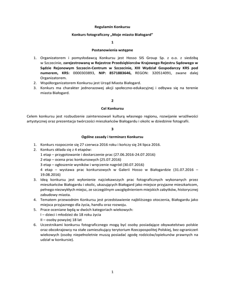 Regulamin Konkursu Konkurs fotograficzny „Moje miasto Białogard” 1 Postanowienia wstępne 1. Organizatorem i pomysłodawcą Konkursu jest Hosso SIS Group Sp. z o.o. z siedzibą w Szczecinie, zarejestrowaną w Rejestrze Przedsiębiorców Krajowego Rejestru Sądowego w Sądzie Rejonowym Szczecin-Centrum w Szczecinie, XIII Wydział Gospodarczy KRS pod numerem, KRS: 0000303893, NIP: 8571883646, REGON: 320514091, zwane dalej Organizatorem. 2. Współorganizatorem Konkursu jest Urząd Miasta Białogard. 3. Konkurs ma charakter jednorazowej akcji społeczno-edukacyjnej i odbywa się na terenie miasta Białogard. 2 Cel Konkursu Celem konkursu jest rozbudzenie zainteresowań kulturą własnego regionu, rozwijanie wrażliwości artystycznej oraz prezentacja twórczości mieszkańców Białogardu i okolic w dziedzinie fotografii. 3 Ogólne zasady i terminarz Konkursu 1. Konkurs rozpocznie się 27 czerwca 2016 roku i kończy się 24 lipca 2016. 2. Konkurs składa się z 4 etapów: 1 etap – przygotowanie i dostarczenie prac (27.06.2016-24.07.2016) 2 etap – ocena prac konkursowych (25.07.2016) 3 etap – ogłoszenie wyników i wręczenie nagród (30.07.2016) 4 etap – wystawa prac konkursowych w Galerii Hosso w Białogardzie (31.07.2016 – 19.08.2016) 3. Ideą konkursu jest wyłonienie najciekawszych prac fotograficznych wykonanych przez mieszkańców Białogardu i okolic, ukazujących Białogard jako miejsce przyjazne mieszkańcom, pełnego niezwykłych miejsc, ze szczególnym uwzględnieniem miejskich zabytków, historycznej zabudowy miasta. 4. Tematem przewodnim Konkursu jest przedstawienie najbliższego otoczenia, Białogardu jako miejsca przyjaznego dla życia, handlu oraz rozwoju. 5. Prace oceniane będą w dwóch kategoriach wiekowych: I – dzieci i młodzież do 18 roku życia II – osoby powyżej 18 lat 6. Uczestnikami konkursu fotograficznego mogą być osoby posiadające obywatelstwo polskie oraz obcokrajowcy na stałe zamieszkujący terytorium Rzeczpospolitej Polskiej, bez ograniczeń wiekowych (osoby niepełnoletnie muszą posiadać zgodę rodziców/opiekunów prawnych na udział w konkursie). 1 4 Zgłoszenie do Konkursu i wymogi pracy konkursowej 1. Prace należy przesłać drogą mailową na adres [email protected] (decyduje data potwierdzenia otrzymania maila przez Organizatora) lub dostarczyć osobiście na płycie CD do biura administracji w Galerii Hosso do dnia 24 lipca 2016 r. 2. Minimalna jakość zdjęcia konkursowego to 300 dpi, format 3:2, jpg. 3. Do każdej pracy konkursowej koniecznie należy dołączyć zgłoszenie uczestnictwa w konkursie, zawierające zgodę na przetwarzanie danych osobowych. W przypadku przesłania zdjęć drogą elektroniczną dokumenty powinny stanowić załącznik maila a następnie powinny zostać dostarczone do biura administracji budynku Hosso lub wysłane pocztą na adres: Galeria Hosso w Białogardzie, Plac Wolności 10a, 78-200 Białogard. 4. Za dopuszczalną cyfrową obróbkę zdjęć uznaje się wyłącznie modyfikację dotyczące całego kadru, takie jak korekta barwy (balansu bieli), jasności, kontrastu, nasycenie kolorów i ostrości, a także usunięcia cyfrowego „szumu”. Zabronione jest zatem usuwanie i dodawanie jakichkolwiek elementów zmieniających treść zdjęcia, jednak dopuszczamy usuwanie ze zdjęcia rys i plam powstałych w wyniku uszkodzenia lub zabrudzenia materiału fotograficznego. 5. Karta zgłoszeniowa, jak i oświadczenie zawierające zgodę na przetwarzanie danych osobowych muszą być podpisane przez uczestnika konkursu, a w przypadku osób niepełnoletnich przez rodziców lub opiekunów prawnych. 6. Prace przesyłane tylko w formie elektronicznej, bez koniecznych zgód na przetwarzanie danych osobowych nie będą zakwalifikowane do udziału w konkursie. 7. Jeden uczestnik może przesłać maksymalnie 5 prac konkursowych. 8. Obowiązuje dowolna technika fotograficzna. 9. Prace muszą być zgodne z celem i regulaminem Konkursu. 10. Udział w Konkursie jest bezpłatny i całkowicie dobrowolny. 5 Ocena prac, wybór laureatów i nagrody 1. Oceny nadesłanych prac dokona specjalnie powołane przez Organizatorów Jury. 2. Kryteria oceny: - walory estetyczne, artystyczne i merytoryczne prac - interpretacja i nawiązanie do tematu - pomysłowość i zmysł obserwacji - spełnienie wymogów formalnych 3. Jury dokona oceny prac nadesłanych do 24 lipca i wyłoni laureatów oraz maksymalnie 30 prac, które zakwalifikują się do wystawy w Galerii Hosso. 4. Planuje się przyznanie w każdej kategorii wiekowej I, II i III nagrody oraz maksymalnie 3 wyróżnień. 5. Nagrody w Konkursie są nagrodami rzeczowymi. Wśród nagród będą: tablety, statywy fotograficzne, selfie stick, atrakcyjne gadżety. 6. Ogłoszenie wyników oraz wręczenie nagród nastąpi 30 lipca 2016., podczas Dni Białogardu 2016. 2 7. Decyzja Jury jest ostateczna i niepodważalna. 8. Przyjmuje się, że osobą uprawnioną do odbioru nagrody jest osoba, której dane wskazane są w zgłoszeniu konkursowym lub rodzic albo opiekun prawny Uczestnika lub też osoba przez niego pisemnie upoważniona. 6 Prawa autorskie i publikacja prac w serwisach 1. Autor wyraża zgodę na publikację prac konkursowych na fanpage Galerii Hosso w Białogardzie, stronach www przynależnych do organizatorów, materiałach i folderach promocyjnych. 2. Organizatorzy zastrzegają sobie prawo do weryfikacji zgłoszonych prac konkursowych pod kątem ich zgodności z prawem i dobrymi obyczajami, w szczególności zaś prace konkursowe nie mogą zawierać treści obscenicznych oraz mogących zostać uznanymi za obraźliwe. 3. Prace publikowane na FB będą opatrzone tytułem oraz imieniem i nazwiskiem autora. 4. Przesłanie pracy do Konkursu jest równoznaczne z: - zapewnieniem, iż uczestnik jest autorem zgłoszonej pracy i w żaden sposób przy ich tworzeniu nie naruszył praw autorskich ani innych praw osób trzecich - udzieleniem zgody na prezentowanie pracy poprzez public
