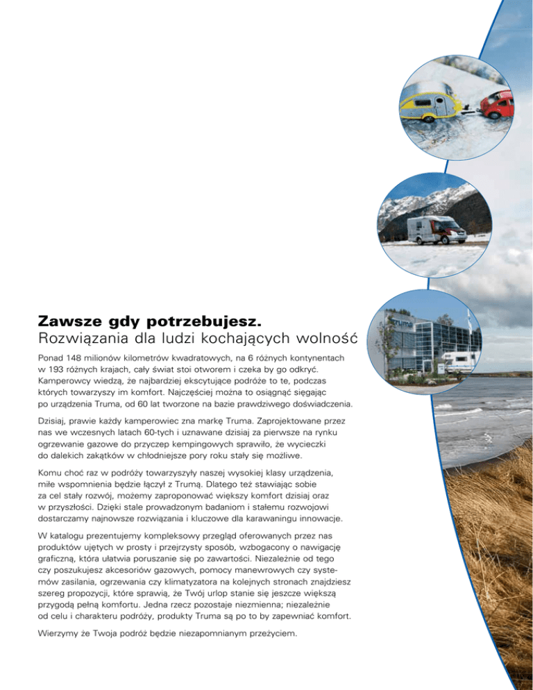 35°10‘ N 32 Zawsze gdy potrzebujesz. Rozwiązania dla ludzi kochających wolność Ponad 148 milionów kilometrów kwadratowych, na 6 różnych kontynentach w 193 różnych krajach, cały świat stoi otworem i czeka by go odkryć. Kamperowcy wiedzą, że najbardziej ekscytujące podróże to te, podczas których towarzyszy im komfort. Najczęściej można to osiągnąć sięgając po urządzenia Truma, od 60 lat tworzone na bazie prawdziwego doświadczenia. Dzisiaj, prawie każdy kamperowiec zna markę Truma. Zaprojektowane przez nas we wczesnych latach 60-tych i uznawane dzisiaj za pierwsze na rynku ogrzewanie gazowe do przyczep kempingowych sprawiło, że wycieczki do dalekich zakątków w chłodniejsze pory roku stały się możliwe. Komu choć raz w podróży towarzyszyły naszej wysokiej klasy urządzenia, miłe wspomnienia będzie łączył z Trumą. Dlatego też stawiając sobie za cel stały rozwój, możemy zaproponować większy komfort dzisiaj oraz w przyszłości. Dzięki stale prowadzonym badaniom i stałemu rozwojowi dostarczamy najnowsze rozwiązania i kluczowe dla karawaningu innowacje. W katalogu prezentujemy kompleksowy przegląd oferowanych przez nas produktów ujętych w prosty i przejrzysty sposób, wzbogacony o nawigację graficzną, która ułatwia poruszanie się po zawartości. Niezależnie od tego czy poszukujesz akcesoriów gazowych, pomocy manewrowych czy systemów zasilania, ogrzewania czy klimatyzatora na kolejnych stronach znajdziesz szereg propozycji, które sprawią, że Twój urlop stanie się jeszcze większą przygodą pełną komfortu. Jedna rzecz pozostaje niezmienna; niezależnie od celu i charakteru podróży, produkty Truma są po to by zapewniać komfort. Wierzymy że Twoja podróż będzie niezapomnianym przeżyciem. 27°04‘ W 26° 53‘ N 8° 41‘ W 42° 39‘ N 1°05‘ E 2°17‘32°17‘ N, 15°01‘ W N, 15°01‘ W 26° 53‘ N 8° 41‘ W Najwyższy poziom komfortu na kempingu W tym tkwi siła Trumy Kamper Przyczepa kempingowa POMOCE MANEWROWE Wstęp 6 SecuMotion Mover SE R 9 Węże HP z zabezpieczeniami Mover TE R 9 Zdalny wskaźnik DuoC z EisEx 89 ® ® 88 Mover SR 10 DuoControl 90 Mover PowerSet 10 Reduktory kempingowe 91 Zestawy instalacyjne 10 Węże gazowe bez zabezpieczeń Dane techniczne i akcesoria 12 Reduktor VDR 50/30 92 Zdalny wyłącznik gazu 93 BBQ 93 Zawory i złączki 93 Dane techniczne i akcesoria 94 ® ® SYSTEMY KLIMATYZACJI Wstęp 18 Aventa comfort 22 Saphir compact 24 Saphir comfort 24 ZASILANIE Saphir vario 25 Wstęp Rozprowadzenie powietrza 25 Przetwornica TG 1000 Sinus 111 Tłumik 25 Akumulator OPTIMA YT S 111 Przewód powietrza 25 NP 3000 112 Przetwornica TG 1000 25 BC 630 IU z panelem BC (430, 630, 860) 112 Co powinieneś wiedzieć 26 Automatyczny zasilacz PS 50 113 Dane techniczne i akcesoria 28 Panel kontrolny CP V 113 Generator napięcia VB 10 113 108 ® Panel kontrolny CP W ze wskaźnikiem SYSTEMY OGRZEWANIA poziomu ładowania 113 Dane techniczne i akcesoria 114 Wstęp 36 Combi 4/Combi 6 39 Combi D6 39 Trumatic S 3002/S 5002 40 KOMFORT WODNY Trumatic S 2200 40 Wstęp 134 Trumatic S 3002 FS 41 Bojler elektryczny 137 Obudowa typu „kominek” 41 Terma 137 Trumatic E 2400 42 Bojler B10/B14 138 Trumatic E 4000 42 FrostControl 138 Ultraheat 43 Truma AquaStar 139 Dmuchawy Truma 44 Dane techniczne i akcesoria 140 Airmix comfort 44 Rozprowadzenie powietrza 45 Suszarka 45 Dane techniczne i akcesoria 46 ZASILANIE GAZEM Wstęp 84 DuoControl CS pionowy 86 MonoControl CS 87 DuoComfort 88 DODATKI Akcesoria specjalne 148 Serwis Truma 154 51° 40‘N 116°27 PRECYZYJNE PARKOWANIE DOKŁADNIE TAM GDZIE TEGO CHCESZ POMOCE PARKOWANIA 7‘W POMOCE PARKOWANIA Niezależnie od tego gdzie spędzasz swoje wakacje, chcesz by były wolne od stresu już od pierwszych chwil. Ale nawet na najlepszych kempingach może zdarzyć się że nie będzie nikogo kto będzie mógł Ci pomóc zapar kować przyczepę. Truma zaprojektowała pomoce parkowania Mover® po to by chronić przed tego typu sytuacjami. Wraz z tymi solidnymi urządzeniami najwyższej jakości możesz zaparkować swoją przyczepę bezpiecznie, precyzyjnie i bez pomocy osób trzecich. Dzięki wyjątkowo trwałemu wykonaniu i jakości, nawet w trudnym terenie pełnym wystających korzeni i kamieni, pochyłym lub śliskim możesz zaparkować pewnie i bezpiecznie. Dzięki urządzeniom Truma, Twoje wakacje od samego początku aż do ostatniego dnia wolne będą od stresu związanego z parkowaniem – niezależnie gdzie wyruszysz. Uważaj na nierówności! Zrobimy to za Ciebie! Systemy parkowania Truma – Oryginalny Mover ® Od 10 lat zajmujemy się projektowaniem innowacyjnych pomocy parkowania do przyczep kempingowych. Te 10 lat dało nam doświadczenie i odegrało niepowtarzalną rolę w rozwoju naszych oryginalnych produktów. Ponieważ sami jesteśmy entuzjastami karawaningu i wiemy co dokładnie ma znaczenie, ciągle optymalizujemy oraz intensywnie testujemy jakość i bezpieczeństwo pomocy parkowania Mover® od momentu ich wynalezienia i debiutu na rynku. Najnowsze modele to niezrównana jakość i precyzja wykonania w najmniejszych szczegółach oparta na doświad czeniu poprzednich modeli. Dlatego właśnie nasze produkty zachwycają nawet po upływie czasu. 8 Parkowanie na milimetry Nieważne jak ciasno, nawet na najmniejszej przestrzeni. Bez poślizgów i zsunięć Bezpiecznie nawet na wzniesieniach 25%. Przyjazny w użyciu pilot Parkowanie jedną ręką bez wysiłku możliwe dzięki inteligentnemu pilotowi sterowania. Miękki start i precyzja Dzięki systemowi Durasoft gwarantowany miękki start i zatrzymanie. Bezpiecznie w każdym terenie Śnieg, żwir, piasek, trawa – Mover® Truma sprawdza się w każdym terenie. Przeszkody pokonane Mover® pokonuje krawężniki każdej wysokości. Najwyższa precyzja parkowania i zero wysiłku: parkowanie jest dziecinnie proste z Mover ® SE R. Jedyny w swojej klasie, najnowszy model nawet podczas zapinania i odpinania nie w