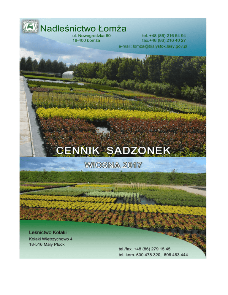 Nadleśnictwo Łomża ul. Nowogrodzka 60 18-400 Łomża tel. +48 (86) 216 54 94 fax.+48 (86) 216 40 27 e-mail: [email protected] Leśnictwo Kołaki Kołaki Wietrzychowo 4 18-516 Mały Płock tel./fax. +48 (86) 279 15 45 tel. kom. 600 478 320, 696 463 444 Warunki sprzedaży: 1. Sprzedaż hurtową i detaliczną materiału szkółkarskiego prowadzimy w szkółce, w dniach od poniedziałku do piątku w godzinach od 7.30 do 15.30 2. W niniejszej ofercie podane są ceny detaliczne i hurtowe brutto (zawierają podatek VAT 8%). 3. Przy zakupie roślin obowiązuje forma płatności gotówką, inne formy rozliczeń należy ustalać indywidualnie. 4. Sprzedaż materiału w pojemnikach prowadzimy przez cały sezon wegetacyjny, aż do wyczerpania zapasu. 5. Sprzedaż sadzonek z gruntu (kopany) rozpoczynamy : • jesienią, ok. 10 października do nastania mrozów • wiosną, z chwilą całkowitego rozmarznięcia gruntu do rozpoczęcia wegetacji. 6. Odbiór większej ilości roślin prosimy uzgodnić z 2-3 dniowym wyprzedzeniem, zamówienia realizujemy w kolejności zgłoszeń. Nie zapewniamy transpotu towaru. 7. Nadleśnictwo Łomża nie ponosi odpowiedzialności za niewykonanie zamówienia w wypadkach losowych np. porażenia szkodnikami, chorobami, wymarznięcia. 8. Nadleśnictwo Łomża zastrzega sobie możliwość zmian cen hurtowych i detalicznych w trakcie sezonu. 9. Przy jednorazowym zakupie dla nabywców detalicznych, którzy kupią sadzonki o wartości: powyżej 100 zł - udzielamy 5% rabatu powyżej 300 zł - udzielamy 7% rabatu powyżej 500 zł - udzielamy 10% rabatu 10. Cena hurtowa przysługuje wszystkim, którzy prowadzą usługi związane z urządzaniem terenów zieleni, OstrówSzkółka Mły Łomża projektowaniem ogrodów oraz tym, którzy kupują rośliny do dalszej odsprzedaży Kołaki Zambrów Augustów Białystok Kisiel materiału szkółkarskiego; (sklepy, centra ogrodnicze), producentom bez względu na ilość zakupionych roślin. 11. Nie prowadzimy sprzedaży wysyłkowej. Oznaczenia skrótów: przekreślenie C1, C2, C3, C4, C5 siewka siewka K grunt bryła Cennik ważny od 13.02.2017 Brak sadzonek w sprzedaży Pojemność doniczki w litrach Sadzonka jednoroczna z nasienia, kopana Sadzonka jednoroczna z nasienia, kasety Materiał kopany z gruntu z odkrytym systemem korzeniowym Materiał kopany z gruntu z bryłą korzeniową Choina kanadyjska Cis pośredni C3 15-20 10,50 8,40 Elegantissima C3 30-40 10,50 8,40 Kórnik C3 50-60 10,50 8,40 C3 30-40 10,50 8,40 x bryła 180-200 27,50 22,00 x bryła 80-120 41,10 32,88 Boulevard C3 20-30 5,70 4,56 Filifera Aureovariegata C3 40-50 8,60 6,88 Filifera Nana C3 50-60 5,70 4,56 Plumosa Rogersii C3 50-60 5,70 4,56 Squarrosa Aurea Nana C3 30-40 5,70 4,56 Squarrosa Sulphurea C3 70-80 5,70 4,56 Sungold C3 20-30 8,60 6,88 C3 60-80 10,50 8,40 x bryła 150-180 27,50 22,00 x bryła 150-180 41,10 32,88 Blue Alps C3 80-100 5,70 4,56 Expansa Variegata C3 15-20 5,70 4,56 Kuriwao Gold C5 60-80 10,50 8,40 Spartan C3 60-80 8,60 6,88 Stricta C3 15-20 5,70 4,56 Blue Star C3 10-15 10,50 8,40 Golden Flame C3 15-20 5,70 4,56 Holger C3 20-30 5,70 4,56 C3 15-20 5,70 4,56 C3 15-20 5,70 4,56 Tsuga canadensis Taxus baccata Taxus x media Hicksii Cyprysik groszkowy Cyprysik Lawsona Chamaecyparis pisifera Chamaecyparis lawsoniana Kelleris Gold Jałowiec chiński Jałowiec łuskowaty Jałowiec nadbrzeżny Juniperus chinensis Juniperus squamata Juniperus conferta x Jałowiec płożący Cena hurt. brutto Średnia wys. w cm Jeddeloh Cis pospolity Cena detal. brutto Rodzaj uprawy DRZEWA I KRZEWY IGLASTE Juniperus horizontalis Golden Carpet Jałowiec pospolity Jałowiec pośredni Jałowiec skalny Jodła nikko x bryła 130-150 27,50 22,00 x bryła 150-180 41,10 32,88 Green Carpet C3 15-20 5,70 4,56 Suecica C3 20-30 5,70 4,56 Suecica Aurea C3 15-20 5,70 4,56 Blue and Gold C3 40-50 8,60 6,88 Mordigan Gold C3 20-30 5,70 4,56 Blue Arrow C3 20-30 10,50 8,40 Skyrocket bryła 150-180 41,10 32,88 C3 20-30 10,50 8,40 x bryła 120-180 39,70 31,76 x C5 50-70 14,50 11,60 C4 40-50 10,70 8,56 C3 40-50 10,70 8,56 C5 30-40 14,50 11,60 C3 30-40 8,60 6,88 C5 50-60 10,50 8,40 C3 20-30 10,70 8,56 Alberta Globe C3 20 10,50 8,40 Conica C3 30-40 10,50 8,40 Echniformis C3 10-15 10,50 8,40 Juniperus communis Juniperus x media Juniperus scopulorum Abies koreana Abies homolepis x Jodła Veitcha Abies vetchii x Sosna bośniacka Pinus leucodermis x Sosna czarna Pinus nigra x Sosna górska Pinus mugo var. pumilio Sosna limba Pinus cembra x Świerk biały Cena hurt. brutto Średnia wys. w cm Wichita Blue Jodła koreańska Cena detal. brutto Rodzaj uprawy DRZEWA I KRZEWY IGLASTE Picea glauca Cena detal. brutto Cena hurt. brutto 20-30 1,75 1,40 5-7 0,70 0,56 C1 40-50 3,70 2,96 grunt 15-25 0,64 0,51 Nidiformis C3 15-20 10,50 8,40 Procumbens C3 10-15 10,50 8,40 x grunt 70-90 1,40 1,12 x bryła 60-150 27,50 22,00 x Rodzaj uprawy Średnia wys. w cm Glauca grunt Glauca siewka K Glauca DRZEWA I KRZEWY IGLASTE Świerk kłujący Świerk pospolity Żywotnik zachodni Picea pungens Picea abies Thuja occidentalis bryła 80-180 41,10 32,88 Aurescens C3 80-100 5,70 4,56 Brabant C3 30-40 5,70 4,56 Columna C3 60-70 8,60 6,88 Europe Gold C3 50-60 8,60 6,88 Globosa C3 50-60 8,60 6,88 Golden Globe Little Dorrit Rheingold Smaragd Spiralis Teddy Tiny Tim Yellow Ribon C3 C3 C5 C3 C5 C5 C3 C3 40-50 30 50-60 50-60 100 30-40 30-40 40-50 8,60 10,50 5,70 10,50 10,50 8,60 8,60 8,60 6,88 8,40 4,56 8,40 8,40 6,88 6,88 6,88 Cena detal. brutto Cena hurt. brutto 30-40 3,00 2,40 C3 20-30 3,00 2,40 Bagatelle C2 10-15 5,40 4,32 Erecta C2 15-20 5,40 4,32 Green Carpet C2 15-20 5,40 4,32 Helmond Pillar C2 15-20 5,40 4,32 Kelleriis C2 30-40 5,40 4,32 Kórnik C2 10-15 5,40 4,32 Powwow C2 15-20 5,40 4,32 Red Chief C2 20-30 5,40 4,32 Rose Glow C2 10-15 5,40 4,32 Guincho Purple C3 30-40 5,40 4,32 Laciniata C3 30-40 5,40 4,32 Pyramidalis C3 30-40 5,40 4,32 Variegata C3 30-40 5,40 4,32 C3 30-40 7,00 5,60 C2 15-20 3,00 2,40 x grunt 30-70 0,40 0,32 x grunt