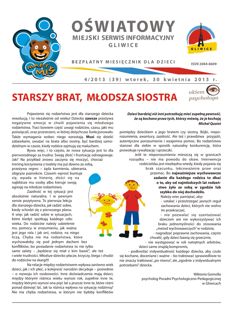 4 / 2 0 1 3 ( 3 9 ) w t o r e k , 3 0 k w i e t n i a 2 0 1 3 r. STARSZY BRAT, MŁODSZA SIOSTRA Pojawienie się rodzeństwa jest dla starszego dziecka rewolucją. I to niezależnie od wieku! Dziecko zawsze przeżywa negatywne emocje w chwili pojawienia się młodszego rodzeństwa. Traci bowiem część uwagi rodziców, czasu, jaki mu poświęcali, oraz przestrzeni, w której dotychczas funkcjonowało. Także wymagania wobec niego wzrastają. Musi się dzielić zabawkami, uważać na brata albo siostrę, być bardziej samodzielnym w czasie, kiedy rodzice zajmują się maluchem. Bywa więc, i to często, że nowa sytuacja jest to dla pierworodnego za trudna. Swoją złość i frustrację odreagowuje. Jak? Na przykład znowu zaczyna się moczyć, chociaż trening korzystania z toalety ma już dawno za sobą, przeżywa regres – żąda karmienia, ubierania, obgryza paznokcie. Czasem wprost buntuje się, wpada w histerię, złości się na najbliższe mu osoby albo kieruje swoją agresję na młodsze rodzeństwo. Zazdrość w tej sytuacji jest absolutnie naturalna. I w pewnym sensie pozytywna. To pierwsza lekcja dla starszego dziecka, jak radzić sobie, kiedy schodzi się z pierwszego planu. A więc jak radzić sobie w sytuacjach, które kiedyś spotkają każdego człowieka. Do rodziców należy udzielenie mu pomocy w zrozumieniu, jak ważna jest jego rola i jak oni, rodzice, na niego liczą. Chyba nie ma rodzeństwa, które wychowałoby się pod jednym dachem bez konfliktów, bo posiadanie rodzeństwa to nie tylko same zalety – „będziesz się miał z kim bawić”, ale też i wiele trudności. Młodsze dziecko płacze, krzyczy, biega i chodzi do rodziców na skargi!!! Na relacje między rodzeństwem wpływa zarówno wiek dzieci, jak i ich płeć, a kolejność narodzin decyduje – pośrednio – o rozwoju ich osobowości. Inne doświadczenia mają dzieci, między którymi różnica wieku wynosi rok, zupełnie inne te, między którymi wynosi ona pięć lat a jeszcze inne te, które różni ponad dziesięć lat. Jak ta różnica wpływa na sytuację rodzinną? Nie ma chyba rodzeństwa, w którym nie byłoby konfliktów Dzieci bardziej niż inni potrzebują mieć zupełną pewność, że są kochane przez tych, którzy mówią, że je kochają Michel Quoist pomiędzy dzieckiem a jego bratem czy siostrą. Bójki, nieporozumienia, awantury, zazdrość. Ale też i prawdziwa przyjaźń, autentyczne porozumienie i wzajemna pomoc. Bo rodzeństwo stanowi dla siebie w sposób naturalny konkurencję, która prowokuje rywalizację i sprzeczki. Jeśli te nieporozumienia mieszczą się w granicach rozsądku – nie ma powodu do obaw. Interwencja rodzicielska jest niezbędna wtedy, kiedy pojawia się brak szacunku, lekceważenie praw oraz przemoc. Bo najważniejsze wychowawcze zadanie dla każdego rodzica to dbać o to, aby od najmłodszych lat rodzeństwo żyło ze sobą w zgodzie lub szybko do niej dochodziło. Należy wiec pamiętać, aby: - ustalać i przestrzegać jasnych reguł zachowania dzieci, których nie wolno im przekraczać, - nie pozwalać się szantażować dzieciom ani nie wykorzystywać ich braku jednomyślności do stosowania „metod wychowawczych” w rodzinie, - nagradzać poprawne zachowania, często chwalić, gdy dzieci bawią się grzecznie, - nie występować w roli natrętnych arbitrów, dzieci same znajdą kompromis, - podkreślać indywidualność każdego dziecka, aby czuło się kochane, doceniane i ważne – bo traktować sprawiedliwie to nie znaczy traktować „po równo”, ale „zgodnie z indywidualnymi potrzebami” dziecka. Wiktoria Gomolla psycholog Poradni Psychologiczno-Pedagogicznej w Gliwicach Walki kogutów, czyli rodzeństwo kształtuje charakter Z azdrość, obowiązki i zakazy, przywileje to chleb codzienny każdego rodzeństwa. Jednak wszystkie konflikty między nimi znakomicie przygotowują dzieci do życia w społeczeństwie. Z kolei układy między rodzeństwem określają pozycję w relacjach z innymi ludźmi na całe życie. Tematem tego wydania jest „starszy brat i młodsza siostra”, jednak ze względu, na fakt, że mam tylko starszą siostrę, oceniam relacje między rodzeństwem z punktu widzenia młodszej siostry. Relacje między rodzeństwem tej samej płci są znacznie bardziej obarczone zazdrością, zwłaszcza w przypadku dwóch dziewczynek. Zdaniem psychologów, starsza siostra stara się bardziej udowodnić swoją indywidualność, a ta druga ma wszelkie predyspozycje to rozpieszczenia, jednocześnie pozostając pod wpływem autorytetu starszej. Zawsze jednak relacje między młodszym i starszym rodzeństwem zależą od rodziców i charakterów dzieci. W moim przypadku siostra przez lata była dla mnie autorytetem, ale ze względu na różnicę wieku nasze relacje przypominały często „walkę kogutów”. Jednak z czasem wszystko się zmienia. Posiadanie brata czy siostry ma nieocenioną wartość w trudnych sytuacjach, kiedy można liczyć na wsparcie starszego czy też młodszego rodzeństwa. Rodzeństwo daje wówczas oparcie, pomaga przetrwać kryzys i trudne chwile. To taki układ, na który można liczyć bez względu na różnicę wieku, dzielącą odległość i poglądy. Agnieszka Manowska W sobotę, 13 kwietnia Centrum Kongresowe Politechniki Śląskiej już po raz drugi gościło Gliwickie Targi Edukacyjne Education Fair. Ta współorganizowana przez Miasto Gliwice i Gliwicki Ośrodek Metodyczny impreza, była doskonałą okazją do zapoznania się z ofertą i osiągnięciami gliwickich szkół. Wszyscy prezentujący starali się przyciągnąć uwagę odwiedzjących. Szkoły kształcące w zawodach zachęcały kandydatów stoiskami prezentującymi wyposażenie pracowni i wytwory uczniów. Szkoły ogólnokształcące skupiły się przede wszystkim na prezentacji oferty dydaktycznej i zajęć dodatkowych oraz osiągnięć i sukcesów uczniów. Dużym zainteresowaniem cieszyły się występy i pokazy przygotowane przez po