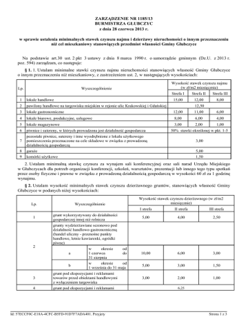 ZARZĄDZENIE NR 1185/13 BURMISTRZA GŁUBCZYC z dnia 28 czerwca 2013 r. w sprawie ustalenia minimalnych stawek czynszu najmu i dzierżawy nieruchomości o innym przeznaczeniu niż cel mieszkaniowy stanowiących przedmiot własności Gminy Głubczyce Na podstawie art.30 ust. 2 pkt 3 ustawy z dnia 8 marca 1990 r. o samorządzie gminnym (Dz.U. z 2013 r. poz. 594) zarządzam, co następuje: § 1. 1. Ustalam minimalne stawki czynszu najmu nieruchomości stanowiących własność Gminy Głubczyce o innym przeznaczeniu niż mieszkaniowy, z zastrzeżeniem ust. 2, w następujących wysokościach: Lp. Wysokość stawek czynszu najmu (w zł/m2 miesięcznie) Wyszczególnienie Strefa I Strefa II Strefa III 15,00 12,00 8,00 1 lokale handlowe 2 pawilony handlowe na targowisku miejskim w rejonie ulic Krakowskiej i Gdańskiej 3 lokale gastronomiczne 12,00 11,00 6,00 4 lokale biurowe, produkcyjne, usługowe 8,00 6,00 4,00 5 lokale magazynowe 3,00 2,00 1,00 6 piwnice i sutereny, w których prowadzona jest działalność gospodarcza 50% stawki określonej w pkt. 1-5 7 pozostałe piwnice, sutereny i inne wyodrębnione z lokalu użytkowego pomieszczenia przeznaczone na cele składowe w związku z prowadzoną działalnością gospodarczą 3,00 8 garaże 5,00 9 komórki użytkowe 1,50 12,50 2. Ustalam minimalną stawkę czynszu za wynajem sali konferencyjnej oraz sali narad Urzędu Miejskiego w Głubczycach dla potrzeb organizacji konferencji, szkoleń, warsztatów, prezentacji lub innego tego typu spotkań przez osoby fizyczne i prawne w związku z prowadzoną działalnością gospodarczą w wysokości 60 zł za 1 godzinę wynajmu. § 2. Ustalam wysokość minimalnych stawek czynszu dzierżawnego gruntów, stanowiących własność Gminy Głubczyce w podanych niżej wysokościach: Lp. 1 2 Wysokość stawek czynszu dzierżawnego (w zł/m2 miesięcznie) Wyszczególnienie grunt wykorzystywany do działalności gospodarczej innej niż rolnicza I strefa II strefa III strefa 5,00 4,00 2,50 10,00 6,00 3,00 5,00 3,00 1,50 3,00 2,00 1,00 grunty wydzierżawiane sezonowo pod działalność handlowo-gastronomiczną (handel uliczny - przenośne punkty handlowe, letnie kawiarenki, ogródki piwne) a w okresie 1 czerwca 31 sierpnia b w okresie od 1 września do 31 maja 3 grunt pod ekspozycjami i reklamami towarów przed obiektami handlowymi z wyłączeniem targowiska 4 grunt pod ekspozycjami i reklamami Id: 57ECCF0C-E18A-4CFC-B5FD-91D7F7ADA401. Przyjety od do 6,25 Strona 1 z 3 towarów przed obiektami handlowymi w obrębie targowiska miejskiego grunt zajęty pod cele składowe i magazynowe 5 a do 200 m2 b m2 c od 201 1,70 do 1000 powyżej 1000 1,10 0,60 50 % stawki określonej w pkt 5a m2 30 % stawki określonej w pkt 5a m2 6 grunt pod garażami 1,50 1,00 0,80 7 grunt pod komórkami gospodarczymi 1,00 0,60 0,30 ogródki przydomowe 8 a do 150 m2 b powyżej 150 m2 0,06 9,00 zł + 0,03 zł za każdy następny m2 powyżej 150 m2 9 tereny rekreacyjno-sportowe, w tym wykorzystywane na gry plenerowe 0,04 10 zagospodarowanie zielenią 0,06 11 pod schody, pochylnie, inne urządzenia niezbędne do prawidłowego funkcjonowania lokalu, dojazdy i dojścia do budynków, ciągi pieszo-jezdne 1,00 12 grunt wydzierżawiany na cele imprez widowisko-rozrywkowych, np. przedstawienia cyrkowe a b do 500 m2 powyżej 500 300,00 za 1 dzień 700,00 za 1 dzień m2 grunt wydzierżawiany pod urządzenia rozrywkowe - wesołe miasteczko 13 a do 7 dni 300,00 b powyżej 14 dni c powyżej 14 dni 7 dni do 600,00 900,00 14 grunty oddane w dzierżawę przeznaczone do użytkowania rolniczego, z wyłączeniem gruntów o których mowa w punkcie 8 3% wartości gruntów rolnych w stosunku rocznym wyrażonej w q żyta według cen stosowanych przy sprzedaży gruntów stanowiących własność Skarbu Państwa 15 pozostałe cele 16 dzierżawa gruntu dla potrzeb zamieszczenia reklamy z wyłączeniem gruntów zajętych pod pas drogowy - iloczyn liczby metrów kwadratowych powierzchni gruntu zajętego przez rzut poziomy powierzchni reklamy, liczby dni zajmowania gruntu oraz stawki czynszu za 1 m kw. 15,00 17 opłata za używanie terenu bez tytułu prawnego (bezumowne korzystanie z gruntu) lub samowolną zmianę przeznaczenia terenu 200% stawek czynszu dzierżawnego 3,00 2,00 1,50 § 3. Jeżeli stawka czynszu najmu/dzierżawy obowiązująca przed dniem wejścia w życie niniejszego zarządzenia ustalona została w trybie przetargu lub negocjacji i stawka ta jest niższa aniżeli stawka minimalna ustalona w § 1 i w § 2 wysokość nowej stawki oblicza się wskaźnikiem wzrostu stawki minimalnej obowiązującej w dniu przetargu/negocjacji do stawki wprowadzonej niniejszym zarządzeniem. § 4. Do ustalonych stawek czynszowych dolicza się podatek VAT według obowiązujących stawek. Id: 57ECCF0C-E18A-4CFC-B5FD-91D7F7ADA401. Przyjety Strona 2 z 3 § 5. Ustalam wysokość kaucji gwarancyjnej pobieranej przy wydzierżawianiu gruntów na cele imprez widowiskowo-rozrywkowych, np. przedstawienia cyrkowe oraz pod urządzenia rozrywkowe - wesołe miasteczko w wysokości 600,00 zł. § 6. Podział miasta na strefy ustalony jest odrębnym zarządzeniem. § 7. Zarządzenie nie ma zastosowania do stawek czynszu przy organizacji festynów, jarmarków i innych imprez okolicznościowych. § 8. Traci moc zarządzenie Nr 951/09 Burmistrza Głubczyce z dnia 29 kwietnia 2009 r. w sprawie ustalenia minimalnych stawek czynszu najmu i dzierżawy nieruchomości o innym przeznaczeniu niż cel mieszkaniowy stanowiących przedmiot własności Gminy Głubczyce, zmienione zarządzeniami Nr 983/09 z dnia 29 maja 20089 r., Nr 1056/09 z dnia 25 sierpnia 2009 r. oraz Nr 1140/09 z dnia 20 października 2009 r. § 9. Zarządzenie wchodzi w życie z dniem 1 lipca 2013 roku. Burmistrz Jan Krówka Id: 57ECCF0C-E18A-4CFC-B5FD-91D7F7ADA401. Przyjety Strona 3 z 3
