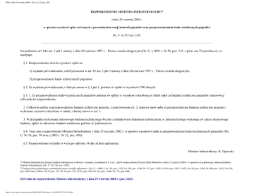 RMI z dnia 29 wrze•nia 2004 r. Dz.U.nr 223 poz.2261 ROZPORZ•DZENIE MINISTRA INFRASTRUKTURY1) z dnia 29 wrze•nia 2004 r. w sprawie wysoko•ci opłat zwi•zanych z prowadzeniem stacji kontroli pojazdów oraz przeprowadzaniem bada• technicznych pojazdów Dz. U. nr 223 poz. 2261 Na podstawie art. 84a ust. 1 pkt 3 ustawy z dnia 20 czerwca 1997 r. - Prawo o ruchu drogowym (Dz. U. z 2003 r. Nr 58, poz. 515, z pó•n. zm.2)) zarz•dza si•, co nast•puje: § 1. Rozporz•dzenie okre•la wysoko•• opłat za: 1) wydanie po•wiadczenia, o którym mowa w art. 83 ust. 3 pkt 5 ustawy z dnia 20 czerwca 1997 r. - Prawo o ruchu drogowym; 2) przeprowadzanie bada• technicznych pojazdów. § 2. Za wydanie po•wiadczenia, o którym mowa w § 1 pkt 1, pobiera si• opłat• w wysoko•ci 700 złotych. § 3. 1. Za przeprowadzenie bada• technicznych pojazdów pobiera si• opłaty w wysoko•ci okre•lonej w tabeli opłat za badania techniczne pojazdów stanowi•cej zał•cznik do rozporz•dzenia. 2. Całkowita opłata za przeprowadzone badanie techniczne pojazdu, z zastrze•eniem ust. 3, stanowi sum• opłat za przeprowadzone badania techniczne pojazdu i wykonane czynno•ci okre•lone w tabeli, o której mowa w ust. 1. 3. W przypadku wykonania okresowego badania technicznego ł•cznie z dodatkowym badaniem technicznym, w zakresie którego wykonuje si• zakres okresowego badania, opłat• za okresowe badanie techniczne pobiera si• jednorazowo. § 4. Traci moc rozporz•dzenie Ministra Infrastruktury z dnia 25 stycznia 2002 r. w sprawie wysoko•ci opłat za przeprowadzenie bada• technicznych pojazdów (Dz. U. Nr 10, poz. 98 oraz z 2003 r. Nr 52, poz. 458). § 5. Rozporz•dzenie wchodzi w •ycie po upływie 14 dni od dnia ogłoszenia. Minister Infrastruktury: K. Opawski 1) Minister Infrastruktury kieruje działem administracji rz•dowej - transport, na podstawie § 1 ust. 2 pkt 4 rozporz•dzenia Prezesa Rady Ministrów z dnia 11 czerwca 2004 r. w sprawie szczegółowego zakresu działania Ministra Infrastruktury (Dz. U. Nr 134, poz. 1429). 2) Zmiany tekstu jednolitego wymienionej ustawy zostały ogłoszone w Dz. U. z 2003 r. Nr 124, poz. 1152, Nr 130, poz. 1190, Nr 137, poz. 1302, Nr 149, poz. 1451 i 1452, Nr 162, poz. 1568, Nr 200, poz. 1953 i Nr 210, poz. 2036 oraz z 2004 r. Nr 29, poz. 257, Nr 54, poz. 535, Nr 92, poz. 884, Nr 121, poz. 1264 i Nr 173, poz.1808. Zał•cznik do rozporz•dzenia Ministra Infrastruktury z dnia 29 wrze•nia 2004 r. (poz. 2261) http://www.stacja.com.pl/prawo/2004/2261/2261.htm (1 of 4)2007-07-24 12:30:46 RMI z dnia 29 wrze•nia 2004 r. Dz.U.nr 223 poz.2261 Tabela opłat za badania techniczne pojazdów Lp. Wyszczególnienie 1 2 1 Okresowe badanie techniczne: 1.1 - motocykl, ci•gnik rolniczy - samochód osobowy, autobus przeznaczony do przewozu nie wi•cej ni• 15 osób ł•cznie z kierowc•, samochód 1.2 1 ci••arowy i specjalny do 3,5 t d.m.c., pojazd trójkołowy powy•ej 0,4 t m.w. ) 1.3 - samochód ci••arowy i specjalny, ci•gnik samochodowy siodłowy powy•ej 3,5 t do 16 t d.m.c. - samochód ci••arowy i specjalny, ci•gnik samochodowy siodłowy powy•ej 16 t d.m.c., ci•gnik samochodowy 1.4 balastowy 1.5 - autobus przeznaczony do przewozu wi•cej ni• 15 osób ł•cznie z kierowc• 1.6 - przyczepa ci••arowa rolnicza do 1,5 t d.m.c. 1.7 - przyczepa ci••arowa rolnicza powy•ej 1,5 t do 6 t d.m.c. 1.8 - przyczepa ci••arowa rolnicza powy•ej 6 t d.m.c. 1.9 - przyczepa (naczepa) ci••arowa i specjalna do 3,5 t d.m.c. 1.10 - przyczepa (naczepa) ci••arowa i specjalna powy•ej 3,5 t do 16 t d.m.c. 1.11 - przyczepa (naczepa) ci••arowa i specjalna powy•ej 16 t d.m.c. 1.12 - pojazd przeznaczony do przewozu materiałów niebezpiecznych (za badanie specjalistyczne) 1.13 - taksówka osobowa lub baga•owa (za warunki dodatkowe) 1.14 - pojazd uprzywilejowany (za warunki dodatkowe) 1.15 - pojazd przystosowany do zasilania gazem (za badanie specjalistyczne) 1.16 - pojazd przystosowany do nauki jazdy lub do przeprowadzania egzaminu pa•stwowego (za warunki dodatkowe) 1.17 - tramwaj - wagon silnikowy 1.18 - tramwaj - wagon przegubowy 1.19 - tramwaj - wagon doczepny czynny 1.20 - tramwaj - wagon doczepny bierny Opłata w zł (zawiera podatek od towarów i usług VAT) 3 62,00 98,00 153,00 176,00 199,00 40,00 50,00 70,00 78,00 163,00 177,00 85,00 42,00 50,00 63,00 48,00 330,00 395,00 250,00 110,00 115,00 1.21 - trolejbus - badania elektryczne 2) Ponowne sprawdzenie mechanizmów i zespołów w poje•dzie, w którym stwierdzono usterki w trakcie bada• technicznych w 2 zakresie: 2.1 - skuteczno•ci i równomierno•ci działania hamulców 20,00 2.2 - skuteczno•ci działania hamulców tramwaju 120,00 2.3 - skuteczno•ci działania hamulca elektrodynamicznego trolejbusu 50,00 2.4 - ustawienia i nat••enia •wiateł drogowych i •wiateł mijania 14,00 2.5 - poł•cze• układu kierowniczego oraz jałowego ruchu koła kierownicy, luzów w zawieszeniu 20,00 2.6 - toksyczno•ci spalin 14,00 2.7 - poziomu hałasu 20,00 2.8 - geometrii kół jednej osi 36,00 2.9 - działania amortyzatorów jednej osi 14,00 2.10 - wszystkich innych usterek ł•cznie 20,00 Pierwsze badanie techniczne pojazdu zarejestrowanego po raz pierwszy za granic• (dotyczy równie• jednej sztuki pojazdu 3 zwolnionego z bada• homologacyjnych): 3.1 - motocykl, motorower, ci•gnik rolniczy 116,00 http://www.stacja.com.pl/prawo/2004/2261/2261.htm (2 of 4)2007-07-24 12:30:46 RMI z dnia 29 wrze•nia 2004 r. Dz.U.nr 223 poz.2261 3.2 3.3 3.4 3.5 3.6 3.7 3.8 3.9 3.10 3.11 4 4.1 4.2 4.3 5 - samochód osobowy, autobus przeznaczony do przewozu nie wi•cej ni• 15 osób ł•cznie z kierowc•, samochód 169,00 ci••arowy i specjalny do 3,5 t d.m.c., pojazd trójkołowy powy•ej 0,4 t m.w. 232,00 - samochód ci••arowy i specjalny, ci•gnik samochodowy siodłowy powy•ej 3,5 t do 16 t d.m.c. - samochód ci••arowy 