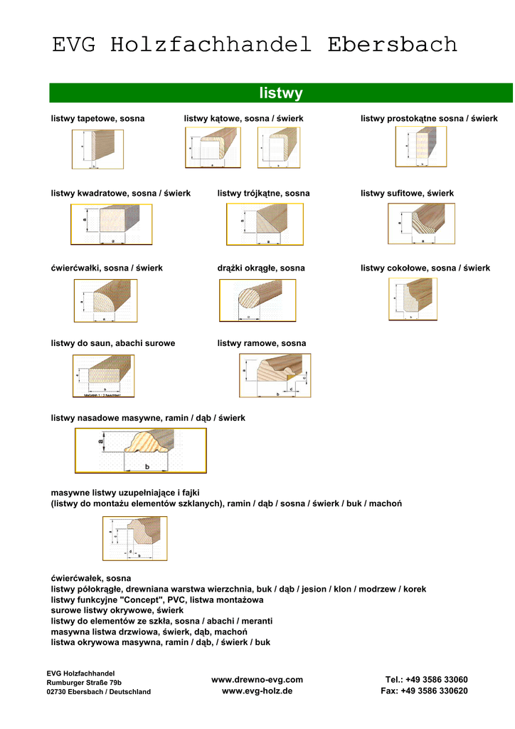 EVG Holzfachhandel Ebersbach listwy listwy tapetowe, sosna listwy kątowe, sosna / świerk listwy prostokątne sosna / świerk listwy kwadratowe, sosna / świerk listwy trójkątne, sosna listwy sufitowe, świerk ćwierćwałki, sosna / świerk drąŜki okrągłe, sosna listwy cokołowe, sosna / świerk listwy do saun, abachi surowe listwy ramowe, sosna listwy nasadowe masywne, ramin / dąb / świerk masywne listwy uzupełniające i fajki (listwy do montaŜu elementów szklanych), ramin / dąb / sosna / świerk / buk / machoń ćwierćwałek, sosna listwy półokrągłe, drewniana warstwa wierzchnia, buk / dąb / jesion / klon / modrzew / korek listwy funkcyjne "Concept", PVC, listwa montaŜowa surowe listwy okrywowe, świerk listwy do elementów ze szkła, sosna / abachi / meranti masywna listwa drzwiowa, świerk, dąb, machoń listwa okrywowa masywna, ramin / dąb, / świerk / buk EVG Holzfachhandel Rumburger Straße 79b 02730 Ebersbach / Deutschland www.drewno-evg.com www.evg-holz.de Tel.: +49 3586 33060 Fax: +49 3586 330620