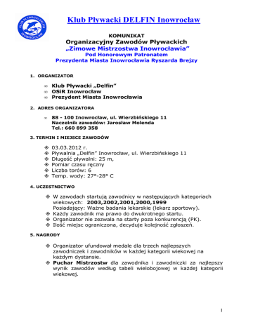 Klub Pływacki DELFIN Inowrocław KOMUNIKAT Organizacyjny Zawodów Pływackich „Zimowe Mistrzostwa Inowrocławia” Pod Honorowym Patronatem Prezydenta Miasta Inowrocławia Ryszarda Brejzy 1. ORGANIZATOR • • • Klub Pływacki „Delfin” OSiR Inowrocław Prezydent Miasta Inowrocławia 2. ADRES ORGANIZATORA • 88 - 100 Inowrocław, ul. Wierzbińskiego 11 Naczelnik zawodów: Jarosław Molenda Tel.: 660 899 358 3. TERMIN I MIEJSCE ZAWODÓW 03.03.2012 r. Pływalnia „Delfin” Inowrocław, ul. Wierzbińskiego 11 Długość pływalni: 25 m, Pomiar czasu ręczny Liczba torów: 6 Temp. wody: 27°-28° C 4. UCZESTNICTWO W zawodach startują zawodnicy w następujących kategoriach wiekowych: 2003,2002,2001,2000,1999 Posiadający: Ważne badania lekarskie (lekarz sportowy). Każdy zawodnik ma prawo do dwukrotnego startu. Organizator nie zezwala na starty poza konkurencją (PK). Ilość miejsc ograniczona, decyduje kolejność zgłoszeń. 5. NAGRODY Organizator ufundował medale dla trzech najlepszych zawodniczek i zawodników w każdej kategorii wiekowej na każdym dystansie. Puchar Mistrzostw dla zawodnika i zawodniczki za najlepszy wynik zawodów według tabeli wielobojowej w każdej kategorii wiekowej. 1 6. ZGŁOSZENIE DO ZAWODÓW Zgłoszenie należy przesłać w terminie do 01.03.2012 r. wg. Edytora zgłoszeń do pobrania na www.omegatiming.pl pocztą elektroniczną na adres: email: [email protected] 7. ZASADY FINANSOWANIA Koszty organizacji zawodów ponosi organizator imprezy. Koszty uczestnictwa ponoszą kluby (płatne gotówką w biurze zawodów na basenie). Opłata startowa wynosi 25 PLN. Od zgłoszonego zawodnika. Opłata klubowa wynosi 25 PLN płatna przed zawodami. 8. POSTANOWIENIA KOŃCOWE Podczas zawodów obowiązują przepisy PZP. W sprawach nieobjętych regulaminem oraz komunikatem organizacyjnym decyduje Sędzia Główny w porozumieniu z Naczelnikiem zawodów. Odprawa techniczna odbędzie się 03.03.2012 r. o godz. 9.15 na terenie pływalni ( Sala gimnastyczna ). Na pływalni i trybunach obowiązuje obuwie zastępcze! 9. PROGRAM ZAWODÓW Rozgrzewka 9.00 Uroczyste otwarcie zawodów godz. 9.50 Dziewczęta 1. 3. 5. 7. 9. 11. 13. 15. Chłopcy 50 m st. dowolnym 50 m st. motylkowym 50 m st. grzbietowym 50 m st. klasycznym 100 m st. dowolnym 100 m st. motylkowym 100 m st. grzbietowym 100 m st. klasycznym 2. 4. 6. 8. 10. 12. 14. 16. 50 m st. dowolnym 50 m st. motylkowym 50 m st. grzbietowym 50 m st. klasycznym 100 m st. dowolnym 100 m st. motylkowym 100 m st. grzbietowym 100 m st. klasycznym Ze sportowym pozdrowieniem Prezes KP „Delfin" Joanna Molenda 2