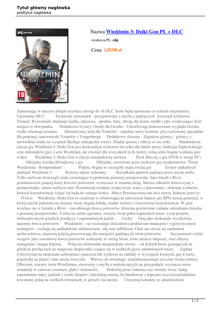 Tytuł główny nagłówka podtytuł nagłówka Nazwa Wiedźmin 3: Dziki Gon PL + DLC wydawca PL: cdp Cena: 129.90 zł Zamawiając w naszym sklepie uzyskasz dostęp do 16 DLC, które będą ujawniane co tydzień od premiery. Ujawnione DLC: Trymerski rynsztunek - przygotowany z myślą o najlepszych rycerzach królestwa Temerii. Rynsztunek obejmuje kurtkę, rękawice, spodnie, buty, zbroję dla konia, siodło i juki zwiększające ilość miejsca w ekwipunku. Dodatkowe fryzury i brody dla Geralta - Umożliwiają dostosowanie wyglądu Geralta wedle własnego uznania. Alternatywny strój dla Yennefer - zupełnie nowy kostium, przyszykowany specjalnie dla potężnej czarowniczki Yennefer z Vengerbergu Dodatkowe zlecenie - Zaginieni górnicy - górnicy z niewielkiej osady na wyspach Skellige znikają bez wieści. Zbadaj sprawę i odkryj co się stało. Standardowa edycja gry Wiedźmin 3: Dziki Gon jest doskonałym wyborem nie tylko dla fanów prozy Andrzeja Sapkowskiego oraz miłośników gier z serii Wiedźmin, ale również dla wszystkich tych, którzy cenią sobie bogate wydania gier wideo. Wiedźmin 3: Dziki Gon w edycji standardowej zawiera: Dysk Blu-ray z grą (DVD w wersji PC) Oficjalna ścieżka dźwiękowa z gry Oficjalne, stworzone przez twórców gry wydawnictwo "Świat Wiedźmina - Kompendium" Piękna, bogata w szczegóły mapa świata gry Zestaw unikalnych naklejek Wiedźmin 3 Stylowy rękaw ochronny . Kawalkada upiorów pędząca przez nocne niebo. Tylko nieliczni dostrzegli znaki zwiastujące wypełnienie prastarej przepowiedni. Jako Geralt z Rivii, przedstawiciel ginącej kasty łowców potworów, wyruszasz w ostatnią misję. Musisz odnaleźć dziewczynę z przepowiedni, zanim zrobią to inni. Przemierzaj rozdarty wojną świat, walcz z potworami, i dokonuj wyborów, których konsekwencje ścigać cię będą do samego końca. Miecz Przeznaczenia ma dwa ostrza. Jednym jesteś ty. O Grze Wiedźmin: Dziki Gon to osadzona w olśniewającym uniwersum fantasy gra RPG nowej generacji, w której nacisk położono na otwarty świat, bogatą fabułę, trudne wybory i rzeczywiste konsekwencje. W grze wcielasz się w Geralta z Rivii – zawodowego łowcę potworów, któremu powierzono zadanie odszukania dziecka z prastarej przepowiedni.. Czeka na ciebie ogromny, otwarty świat pełen kupieckich miast, wysp piratów, niebezpiecznych górskich przełęczy i zapomnianych jaskiń.. Cechy: Graj jako doskonale wyszkolony najemny łowca potworów Wiedźmini – od wczesnego dzieciństwa poddawani mutacjom i rygorystycznym treningom – cechują się nadludzkimi zdolnościami, siłą oraz refleksem. Choć nie cieszą się zaufaniem społeczeństwa, stanowią jedyną przeciwwagę dla mnogości gnębiących świat potworów. Siej postrach wśród wrogów jako zawodowy łowca potworów uzbrojony w szereg broni, które możesz ulepszać, oraz eliksiry mutagenne i magię bojową. Poluj na różnorodne niespotykane stwory – od dzikich bestii grasujących na górskich przełęczach po magiczne drapieżniki czające się w zaułkach gęsto zaludnionych miast. Zapłatę wykorzystuj na ulepszanie uzbrojenia i pancerza lub wydawaj na zakłady w wyścigach konnych, grę w karty, pojedynki na pięści i inne nocne rozrywki. Wkrocz do otwartego, niejednoznacznego etycznie świata fantasy Olbrzymi, otwarty świat Wiedźmina, stworzony z myślą o niekończących się przygodach, wyznacza nowe standardy w zakresie rozmiaru, głębi i złożoności. Podróżuj przez fantastyczny otwarty świat: badaj zapomniane ruiny, jaskinie i wraki okrętów; odwiedzaj miasta, by handlować z kupcami oraz krasnoludzkimi kowalami; poluj na wielkich równinach, w górach i na morzu. Utrzymuj kontakty ze zdradzieckimi 1/3 Tytuł główny nagłówka podtytuł nagłówka generałami, przebiegłymi wiedźmami i zepsutymi członkami rodzin królewskich, by otrzymywać zlecenia na swe mroczne usługi. Dokonuj wyborów wykraczających poza prosty podział na dobro i zło, a następnie mierz się z daleko idącymi konsekwencjami. Podążaj tropem dziecka z przepowiedni Przyjmij najważniejsze w życiu zlecenie i spróbuj odnaleźć dziecko z przepowiedni, które może uratować świat lub pogrążyć go w ruinie. Przemierzaj ogarnięty wojną świat tropem żywej broni, dziecka ze starożytnej elfiej legendy. Stań do nierównej walki z okrutnymi władcami, duchami dziczy, a nawet grozą z innego wymiaru. Wybierz własną drogę w świecie, który być może nie zasługuje na ratunek. Pełne wykorzystanie potencjału systemów nowej generacji Zaprojektowany wyłącznie z myślą o systemach nowej generacji silnik REDengine 3 budzi do życia wielobarwny, szczegółowy i naturalnie wyglądający świat fantasy. Dynamiczne zmiany pogody oraz cykl dnia i nocy wpływają na zachowanie mieszkańców miast i potworów w dziczy. Zarówno wątek główny, jak i poboczne przygody postawią przed tobą wiele trudnych wyborów – będziesz mieć większy wpływ na otoczenie, niż kiedykolwiek przedtem. 2/3 Tytuł główny nagłówka podtytuł nagłówka Nazwa Wartość Wydawca PL CDP.pl / CD Projekt Data premiery 19.05.2015 Producent Tryb gry Kategoria wiekowa Wersja językowa Format CD Projekt Red Studio Single Player 18+ PL DVD 3/3
