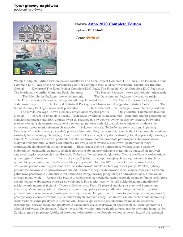 Tytuł główny nagłówka podtytuł nagłówka Nazwa Anno 2070 Complete Edition wydawca PL: Ubisoft Cena: 49.90 zł Wersja Complete Edition zawiera pakiet dodatków: The Eden Project Complete DLC Pack, The Financial Crisis Complete DLC Pack oraz The Nordamark Conflict Complete Pack a także rozszerzenie Tajemnicza Błękitna Głębia! Zawartość The Eden Project Complete DLC Pack, The Financial Crisis Complete DLC Pack oraz The Nordamark Conflict Complete Pack obejmuje: The Keeper Package - nowe technologie i ulepszenia The Eden Series Package - nowe technologie The Development Package - dwie nowe misje The Distrust Series Package - dziesięć dodatkowych budynków The Crisis Response Package - dwie dodatkowe misje The Central Statistical Package - odblokowanie dostępu do Statistic Center The Silent Running Package - nowa łódź podwodna The Nordamark Line Package - nowe elementy ozdobne The E.V.E. Package - nowe elementy zmieniające wygląd profilu Opis dodatku Tajemnicza Błękitna Głębia: Ukryci od lat na dnie oceanu, Techsowie uwalniają ostateczną moc - generator energii geotermalnej. Największa potęga roku 2070 zmusza świat do rozszerzenia swych wpływów na głębiny oceanu. Podwodne płaskowyże stają się centrum rozgrywki zawierającym nowe budynki oraz złożone łańcuchy produkcyjne, utworzone z poprzednio nieznanych zasobów. Sukcesy wynoszą Techsów na nowy poziom: Populację Geniuszy. Ci z kolei ruszają na podbój powierzchni mórz. Potężne pomniki, nowe budynki i zapotrzebowanie na zasoby tylko umacniają ich pozycję. Gracz może efektywnie wykorzystać podwodny świat poprzez dyplomację i handel. Musi ustanowić nowe, podwodne szlaki handlowe, podbić pozostałe płaskowyże i zbudować nowe budynki oraz pomniki. Wzrost ekonomiczny ma swoją cenę: awarie w elektrowni geotermalnej mogą doprowadzić do niszczycielskiego tsunami. Eksploracja głębin i konieczność wykorzystania zasobów podwodnych oznaczają, że musisz znaleźć nowe sposoby na pozyskiwanie materiałów, nauczyć się nowych zagrywek dyplomatycznych i handlowych. To będzie Twoja broń, dzięki której Twoja cywilizacja rozkwitnie w tym wrogim środowisku. To już piąta część jednej z najpopularniejszych strategii ekonomicznych na rynku. Akcja przeniesiona została w niedaleką przyszłość. Do roku 2070 zmiany klimatu spowodowały drastyczne podniesienie się poziomu wód, co zafundowało ludzkości biblijny wręcz potop. W takiej sytuacji postanowiono wrócić do sprawdzonych metod i wzorem Noego wybudowano Arki, mające zapewnić naszemu gatunkowi przetrwanie i umożliwić mu odbudowę swojej dawnej potęgi na tych skrawkach lądu, które wciąż wystają ponad wodę. Rozgrywka bazuje w większości na mechanizmach doskonale znanych fanom serii, które zostały jednak wzbogacone o szereg nowych opcji. Po raz pierwszy w historii cyklu dostajemy możliwość pokierowania trzema frakcjami - Tycoons, Echoes oraz Tech. Ci pierwsi stawiają na przemysł i agresywną ekspansję. Za nic mają dobro środowiska, zamiast tego priorytetem jest dla nich osiąganie dużych zysków i gromadzenie surowców w najkrótszym możliwym czasie. Drugie z tych stronnictw preferuje wolniejszy rozwój przemysłowy i koncentrowanie się na odnawialnych źródłach energii, co umożliwia mu zachowanie naturalnego środowiska w stanie praktycznie nietkniętym. Ostatnia społeczność jest ukierunkowana na nowoczesne technologie i rozwój badań nad praktycznie każdą sferą życia. Podstawą jej egzystencji są liczne laboratoria i ośrodki badawcze. Co ciekawe, frakcje nie są sobie wrogie i gra wcale nie zmusza nas do wybrania jednej z nich. Zamiast tego są po prostu ścieżkami rozwoju, które możemy swobodnie wykorzystywać i łączyć dla realizacji 1/3 Tytuł główny nagłówka podtytuł nagłówka naszych celów. Wszystkie stronnictwa mają inne budynki, technologie oraz mieszkańców z unikalnymi potrzebami. 2/3 Tytuł główny nagłówka podtytuł nagłówka Nazwa Wartość Wydawca PL Ubisoft Data premiery 25-go kwietnia 2013 Producent Tryb gry Kategoria wiekowa Wersja językowa Wymagania sprzętowe Format Related Designs Single / Multiplayer 7+ PL (napisy) Core 2 Duo 2 GHz, 2 GB RAM (4 GB RAM - Vista/7), karta DVD 3/3