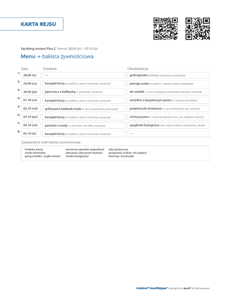 KART ARTA A REJSU REJSU Yachting Instant Plus 2. Termin 28.09 (śr) – 05.10 (śr) Menu + bakista bakista żywno wnośścio ciowa wa Data 1) 2) 3) 4) 5) 6) 7) 8) Śniadanie Obiadokolacja 28.09 (śr) --- grill/ognisko (kiełbaski, pieczywo, przyprawy) 29.09 (cz) kanapki/tosty (z wędliną i serem, konserwy, warzywa) pierogi ruskie (z patelni + okrasa smalcu ziołowego) 30.09 (pt) jajecznica z kiełbaską (+ pieczywo, warzywa) de volaille (+ sos czosnkowy, purée ziemniaczane, surówka) 01.10 (so) kanapki/tosty (z wędliną i serem, konserwy, warzywa) tortellini z bazyliowym pesto (+ suszone pomidory) 02.10 (nd) grillowane kiełbaski białe (+ sos musztardowy, pieczywo) polędwiczki drobiowe (+ sos śmietanowy, ryż, surówka) 03.10 (pn) kanapki/tosty (z wędliną i serem, konserwy, warzywa) chińszczyzna (+ warzywa, grzyby mun, sos, makaron ryżowy) 04.10 (wt) parówki z wody (+ pieczywo, ser żółty, warzywa) spaghetti bolognese (sos, mięso mielone wieprzowe, oliwki) 05.10 (śr) kanapki/tosty (z wędliną i serem, konserwy, warzywa) --- Zaopatrzenie stałe bakisty żywnościowej herbata, kawa woda mineralna gorące kubki / zupki instant konserwy (pasztet, paprykarz) pieczywo, pieczywo tostowe masło/margaryna olej spożywczy przyprawy (cukier, sól, pieprz) ketchup, musztarda