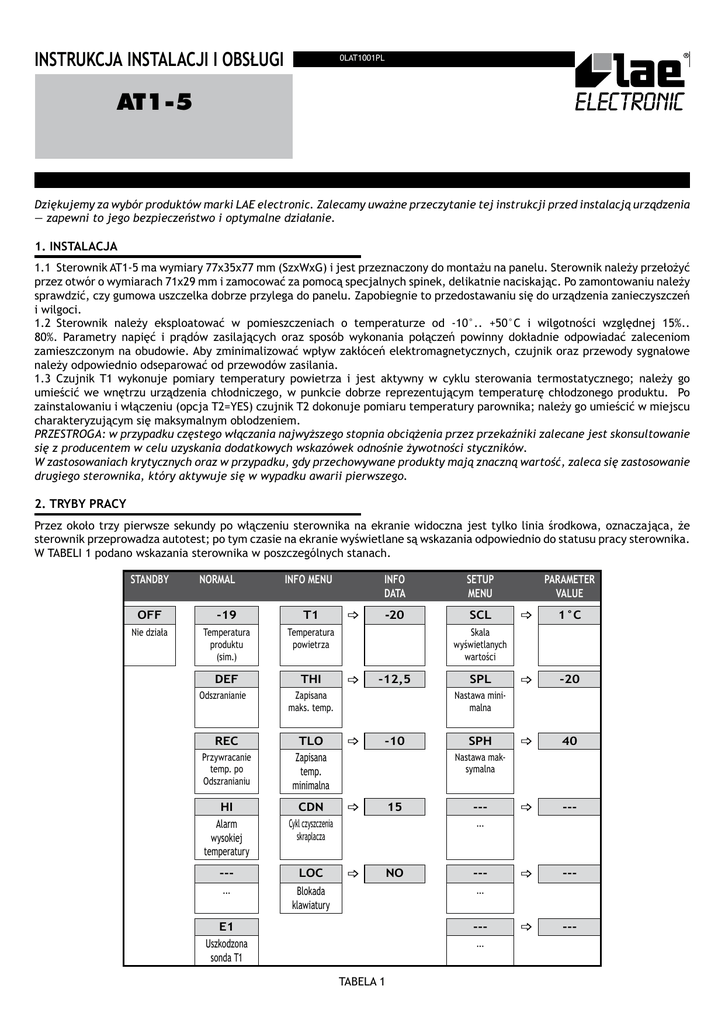 INSTRUKCJA INSTALACJI I OBSŁUGI 0LAT1001PL AT1-5 Dziękujemy za wybór produktów marki LAE electronic. Zalecamy uważne przeczytanie tej instrukcji przed instalacją urządzenia — zapewni to jego bezpieczeństwo i optymalne działanie. 1. INSTALACJA 1.1 Sterownik AT1-5 ma wymiary 77x35x77 mm (SzxWxG) i jest przeznaczony do montażu na panelu. Sterownik należy przełożyć przez otwór o wymiarach 71x29 mm i zamocować za pomocą specjalnych spinek, delikatnie naciskając. Po zamontowaniu należy sprawdzić, czy gumowa uszczelka dobrze przylega do panelu. Zapobiegnie to przedostawaniu się do urządzenia zanieczyszczeń i wilgoci. 1.2 Sterownik należy eksploatować w pomieszczeniach o temperaturze od -10°.. +50°C i wilgotności względnej 15%.. 80%. Parametry napięć i prądów zasilających oraz sposób wykonania połączeń powinny dokładnie odpowiadać zaleceniom zamieszczonym na obudowie. Aby zminimalizować wpływ zakłóceń elektromagnetycznych, czujnik oraz przewody sygnałowe należy odpowiednio odseparować od przewodów zasilania. 1.3 Czujnik T1 wykonuje pomiary temperatury powietrza i jest aktywny w cyklu sterowania termostatycznego; należy go umieścić we wnętrzu urządzenia chłodniczego, w punkcie dobrze reprezentującym temperaturę chłodzonego produktu. Po zainstalowaniu i włączeniu (opcja T2=YES) czujnik T2 dokonuje pomiaru temperatury parownika; należy go umieścić w miejscu charakteryzującym się maksymalnym oblodzeniem. PRZESTROGA: w przypadku częstego włączania najwyższego stopnia obciążenia przez przekaźniki zalecane jest skonsultowanie się z producentem w celu uzyskania dodatkowych wskazówek odnośnie żywotności styczników. W zastosowaniach krytycznych oraz w przypadku, gdy przechowywane produkty mają znaczną wartość, zaleca się zastosowanie drugiego sterownika, który aktywuje się w wypadku awarii pierwszego. 2. TRYBY PRACY Przez około trzy pierwsze sekundy po włączeniu sterownika na ekranie widoczna jest tylko linia środkowa, oznaczająca, że sterownik przeprowadza autotest; po tym czasie na ekranie wyświetlane są wskazania odpowiednio do statusu pracy sterownika. W TABELI 1 podano wskazania sterownika w poszczególnych stanach. STANDBY NORMAL INFO MENU OFF -19 T1 Nie działa Temperatura produktu (sim.) Temperatura powietrza _ DEF THI Zapisana maks. temp. REC TLO Zapisana temp. minimalna _ CDN _ HI Alarm wysokiej temperatury Cykl czyszczenia skraplacza --- LOC ... Blokada klawiatury SETUP MENU -20 SCL PARAMETER VALUE _ 1°C _ -20 _ 40 _ --- _ --- _ --- Skala wyświetlanych wartości Odszranianie Przywracanie temp. po Odszranianiu INFO DATA _ -12,5 SPL Nastawa minimalna -10 SPH Nastawa maksymalna 15 --... _ NO --... E1 Uszkodzona sonda T1 --... TABELA 1 INSTRUKCJA INSTALACJI I OBSŁUGI na 3 sekundy umożliwia przełączenie sterownika AT1-5 w stan gotowości 2.1Standby (Tryb gotowości). Naciśnięcie przycisku lub wznowienie sterowania sygnałem wyjściowym (wyłącznie pod warunkiem że parametr SB ma wartość YES). Wskazanie OFF na ekranie informuje, że sygnały wyjściowe zostały wyłączone na stałe. 2.2Normal (Normalny). Podczas zwykłej pracy ma ekranie wyświetlana jest wartość temperatury zmierzona przez sondę T1, zaprezentowana w najlepszy możliwy sposób. Parametr SCL umożliwia wybór wyświetlanego zakresu zgodnie z tabelą poniżej: SCL 1°C (tylko w przypadku INP=SN4) 2°C °F Zakres -50/-9.9.. +19.9/+80 -50.. +120 -55.. +240 Temperaturę zmierzoną przez sondę T1 można poddać korekcji o stałą wartość, przypisując parametrowi OS1 wartość różną od zera. Podobnie można poddawać korekcji o stałą wartość pomiar z sondy T2 — w takim wypadku należy zmienić parametr OS2. Wartość temperatury T1 jest ponadto, jeszcze przed wyświetleniem, poddawana działaniu algorytmu umożliwiającego symulację bezwładności temperaturowej bezpośrednio proporcjonalnej do wartości SIM. Efektem działania algorytmu są mniejsze wahania wyświetlanej wartości. powoduje niezwłoczną aktywację 2.3INFO Menu (Menu Informacje). Naciśnięcie i natychmiastowe zwolnienie przycisku menu wyboru informacji. Menu to umożliwia wyświetlenie: chwilowych wartości temperatur T1 i T2; zapisanych wartości temperatury maksymalnej (THI) i minimalnej (TLO); łącznego czasu pracy skraplacza od chwili jego ostatniego czyszczenia (CND) oraz statusu klawiatury (LOC). Żądane informacje do wyświetlenia na ekranie można wybrać, naciskając kilkakrotnie lub w szybszy sposób, naciskając przyciski i w celu przewinięcia zawartości menu. Opuszczenie menu przycisk umożliwia przycisk X ; ponadto menu wyłącza się automatycznie po upływie 6 sekund, o ile w tym czasie nie zostanie naciśnięty żaden przycisk. W trybie INFO możliwe jest również wyzerowanie zarejestrowanych wartości parametrów THI i TLO oraz licznika godzin CND. + X , gdy odpowiedni parametr jest wyświetlany na ekranie. W tym celu należy jednocześnie nacisnąć przyciski przez co 2.4Setpoint (Nastawy). Wartość nastawy jest wyświetlana po naciśnięciu i przytrzymaniu naciśniętego przycisku najmniej pół sekundy. Nastawę można zaprogramować za pomocą przycisków + lub , wybierając wartość mieszczącą się w zakresie między dolną (SPL) a górną (SPH) wartością graniczną. Po zwolnieniu przycisku zapisywana jest nowo zaprogramowana wartość. 2.5Keypad lock (Blokada klawiatury). Blokada klawiatury pozwala uniknąć niepożądanych i potencjalnie groźnych w skutkach i manipulacji, jeśli sterownik jest zainstalowany w miejscu ogólnie dostępnym. W trybie INFO za pomocą przycisków możliwe jest przypisanie wartości YES lub NO parametrowi LOC. Ustawienie wartości YES dla parametru LOC powoduje zablokowanie wszystkich poleceń dostępnych z klawiatury. Aby wznowić działanie klawiatury, należy ustawić parametr LOC na wartość NO. 2.6Defrosting (Odszranianie). Przypisanie parametrowi DDY wartości większej od zera po