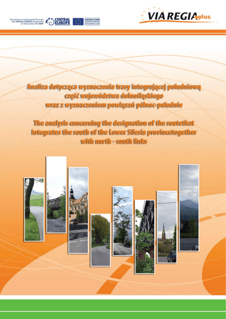 Szanowni Państwo! Dear Sir/ Madam Mam przyjemność przedstawić Państwu wyniki prac nad opracowaniem planistycznym pod nazwą: „Analiza dotycząca wyznaczenia drogowej trasy integrującej południowy obszar województwa dolnośląskiego wraz z wyznaczeniem powiązań północ - południe”. Opracowanie to kładzie nacisk na restytucję wysokiej jakości połączeń drogowych pobudzających rozwój społeczno – gospodarczy tej części regionu. Obszar Sudetów i Przedgórza Sudeckiego, z jego historycznie ukształtowaną siecią osadniczą, w zderzeniu z współczesnymi trendami gospodarczymi narażony jest na procesy peryferyzacji i degradacji. Bez sprawnie funkcjonującej sieci transportowej (drogowej, a w perspektywie kolejowej) niemożliwy jest zrównoważony rozwój regionu oraz jego społeczna i gospodarcza aktywizacja. Dzięki właściwym powiązaniom z drogami o przebiegu północ – południe, trasa wiążąca obszar województwa pomiędzy Zgorzelcem a Paczkowem, wpływać będzie znacząco na poprawę dostępności transportowej i przepływy ludzi, dóbr, usług oraz kapitału. I am pleased to present to you the results of works on a planning study under the name: “An analysis regarding drafting of a road route integrating southern region of Lower Silesia together with links North - South”. This study puts an emphasis on the restoration of high quality road links that stimulate socio-economic development of this part of the region. Grzegorz Roman Członek Zarządu Województwa Dolnośląskiego Grzegorz Roman Member of the Board of Lower Silesia The area of the Sudetenland and the Sudeten Foreland with its historically shaped settlement network is exposed to the processes of peripheralisation and degradation in the face of contemporary economic trends. Without a well functioning transport network (road, and rail in long term) sustainable development of the region and its social and economic mobilisation are not possible. With the right road links running north–south, the route connecting the area of the province between Zgorzelec and Paczkow, will have a significant affect on the improvements of transport accessibility and inflows of people, goods, services and capital. Analizowana sieć na tle multimodalnych powiązań transportowych (drogi, koleje, lotniska) The analyzed network on the background of multi-modal transport links (roads, railways, airports) Wojewódzkie Biuro Urbanistyczne we Wrocławiu, odpowiadając na rosnącą potrzebę aktywizacji regionu, zleciło wykonanie opracowania, którego realizacja ma zintensyfikować rozwój społeczno – gospodarczy południowej części województwa, a w znaczeniu europejskim – przyczynić się do wzmocnienia spójności terytorialnej i wewnętrznej integralności regionów. Opracowanie pt.: „Analiza dotycząca wyznaczenia drogowej trasy integrującej południowy obszar województwa dolnośląskiego wraz z wyznaczeniem powiązań północ-południe” zostało sporządzone przez ekspercką firmę EKKOM Sp. z o.o. w październiku 2010r., w ramach międzynarodowego projektu Via Regia Plus i współfinansowane przez Program dla Europy Środkowej - Europejskiej Współpracy Terytorialnej (EWT). Regional Bureau of Spatial Planning in Wroclaw, in reply to a growing need for mobilisation of the region, has commissioned a development study, which upon completion is to intensify socio-economic development of the southern part of the province, and in the European context - to contribute to the strengthening of territorial cohesion and internal integrity of the regions. A study titled : “An analysis regarding drafting of a road route integrating southern region of Lower Silesia together with links North - South” was drawn up by an expert company EKKOM Sp. z.o.o. in 2010 under the project Via Regia Plus and co-financed by Central European Programme – European Territorial Cooperation (ETC). OBSZAR OPRACOWANIA STUDY AREA Opracowanie objęło szeroko pojęty korytarz komunikacyjny, położony w ciągu dróg krajowych i wojewódzkich trzydziestu ośmiu gmin (dwunastu powiatów) województwa dolnośląskiego oraz jednej gminy województwa opolskiego. The study covered a broadly defined transport corridor, located along the national and provincial roads of thirty-eight municipalities (twelve counties) of the Lower Silesia province and one municipality of Opole province . WYBÓR WARIANTU W rezultacie przeprowadzonych obszernych i wnikliwych analiz wyznaczono trzy rozwiązania przebiegów: 1. wariant północny (Zgorzelec – Lubań – Jelenia Góra – Bolków – Świdnica – Dzierżoniów – Paczków), 2. wariant południowy (Zgorzelec – Lubań – Jelenia Góra – Kamienna Góra – Nowa Ruda - Kłodzko – Paczków), 3. wariant prośrodowiskowy, północno-południowy (Zgorzelec – Lubań – Jelenia Góra – Kamienna Góra – Czarny Bór Świdnica – Dzierżoniów – Paczków). Zaproponowane warianty poddano eksperckiej ocenie, przeprowadzonej za pomocą Metody Wielokryterialnego Wspomagania Decyzji, zwanej także Metodą Analizy Hierarchii (AHP – ang. Analityc Hierarch Process), w wyniku czego, za najbardziej odpowiadający przyjętym założeniom uznano WARIANT PROŚRODOWISKOWY. Czynnikiem istotnym podczas wyboru wariantu była możliwość poprowadzenia korytarza drogowego przy wykorzystaniu w jak największym procencie istniejącej sieci drogowej. Wariant prośrodowiskowy, łącząc najważniejsze ośrodki gospodarcze i turystyczne, w najmniejszym stopniu oddziałuje na obszary cenne przyrodniczo, jest także zoptymalizowany pod względem ekonomicznym, co zwiększa jego realne szanse na realizację. Przebieg proponowanych wariantów na tle sieci drogowej The courses of the proposed alternatives on the background of the existing road network CHOICE OF VARIANT As a result of the comprehensive and thorough analysis performed three route solutions were identified: 1. northern variant (Zgorzelec – Lubań 