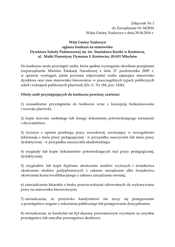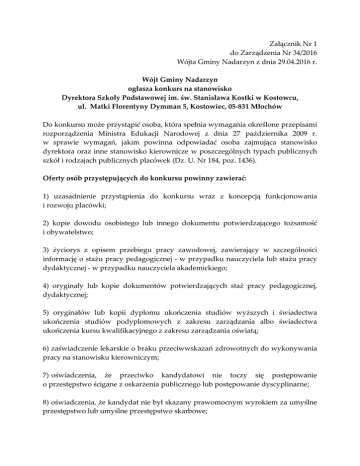 Załącznik Nr 1 do Zarządzenia Nr 34/2016 Wójta Gminy Nadarzyn z dnia 29.04.2016 r. Wójt Gminy Nadarzyn ogłasza konkurs na stanowisko Dyrektora Szkoły Podstawowej im. św. Stanisława Kostki w Kostowcu, ul. Matki Florentyny Dymman 5, Kostowiec, 05-831 Młochów Do konkursu może przystąpić osoba, która spełnia wymagania określone przepisami rozporządzenia Ministra Edukacji Narodowej z dnia 27 października 2009 r. w sprawie wymagań, jakim powinna odpowiadać osoba zajmująca stanowisko dyrektora oraz inne stanowisko kierownicze w poszczególnych typach publicznych szkół i rodzajach publicznych placówek (Dz. U. Nr 184, poz. 1436). Oferty osób przystępujących do konkursu powinny zawierać: 1) uzasadnienie przystąpienia do konkursu wraz z koncepcją funkcjonowania i rozwoju placówki; 2) kopie dowodu osobistego lub innego dokumentu potwierdzającego tożsamość i obywatelstwo; 3) życiorys z opisem przebiegu pracy zawodowej, zawierający w szczególności informację o stażu pracy pedagogicznej - w przypadku nauczyciela lub stażu pracy dydaktycznej - w przypadku nauczyciela akademickiego; 4) oryginały lub kopie dokumentów potwierdzających staż pracy pedagogicznej, dydaktycznej; 5) oryginałów lub kopii dyplomu ukończenia studiów wyższych i świadectwa ukończenia studiów podyplomowych z zakresu zarządzania albo świadectwa ukończenia kursu kwalifikacyjnego z zakresu zarządzania oświatą; 6) zaświadczenie lekarskie o braku przeciwwskazań zdrowotnych do wykonywania pracy na stanowisku kierowniczym; 7) oświadczenia, że przeciwko kandydatowi nie toczy się postępowanie o przestępstwo ścigane z oskarżenia publicznego lub postępowanie dyscyplinarne; 8) oświadczenia, że kandydat nie był skazany prawomocnym wyrokiem za umyślne przestępstwo lub umyślne przestępstwo skarbowe; 9) oświadczenia, że kandydat nie był karany zakazem pełnienia funkcji związanych z dysponowaniem środkami publicznymi, o którym mowa w art. 31 ust. 1 pkt 4 ustawy z dnia 17 grudnia 2004 r. o odpowiedzialności za naruszenie dyscypliny finansów publicznych (t.j. Dz. U. 2013, poz. 168); 10) oświadczenia o dopełnieniu obowiązku, o którym mowa w art. 7 ust. 1 i ust. 3a ustawy z dnia 18 października 2006 r. o ujawnianiu informacji o dokumentach organów bezpieczeństwa państwa z lat 1944-1990 oraz treści tych dokumentów (t.j. Dz.U. 2013, poz. 1388 ze zm.); 11) oryginału lub kopii aktu nadania stopnia nauczyciela mianowanego lub dyplomowanego; 12) oryginału lub kopii karty oceny pracy lub oceny dorobku zawodowego; 13) oświadczenia, że kandydat nie był karany karą dyscyplinarną, o której mowa w art. 76 ust. 1 ustawy z dnia 26 stycznia 1982 r. - Karta Nauczyciela (t.j. Dz. U. 2014, poz. 191 ze zm.) lub w art. 140 ust. 1 ustawy z dnia 27 lipca 2005 r. - Prawo o szkolnictwie wyższym (t.j. Dz. U. 2012, poz. 572 ze zm.) 14) oświadczenia, że kandydat ma pełną zdolność do czynności prawnych i korzysta z pełni praw publicznych - w przypadku osoby niebędącej nauczycielem; 15) oświadczenia, że kandydat wyraża zgodę na przetwarzanie danych osobowych zgodnie z ustawą z dnia 29 sierpnia 1997 r. o ochronie danych osobowych (t.j. Dz. U. 2015, poz. 2135 ze zm.) w celach przeprowadzenia konkursu na stanowisko dyrektora. 2. Złożone kopie dokumentów powinny być poświadczone za zgodność z oryginałem. Informujemy, iż na żądanie kandydaci zobowiązani są do przedstawienia oryginałów dokumentów z pkt 2, 4, 5, 11, 12 niniejszego ogłoszenia. 3. Oferty należy składać w zamkniętych kopertach z podanym adresem zwrotnym i dopiskiem "Konkurs na stanowisko dyrektora Szkoły Podstawowej im. św. Stanisława Kostki w Kostowcu”, (w terminie 14 dni od dnia ukazania się ogłoszenia tj. do 13 maja 2016 r., do godz. 15.00, na: - stronie internetowej Urzędu Gminy Nadarzyn, tablicy ogłoszeń Urzędu Gminy Nadarzyn. Adres: Urząd Gminy Nadarzyn, ul. Mszczonowska 24, 05-830 Nadarzyn. Konkurs przeprowadzi Komisja Konkursowa powołana przez Wójta Gminy Nadarzyn. O terminie i miejscu przeprowadzenia postępowania konkursowego kandydaci zostaną powiadomieni indywidualnie.