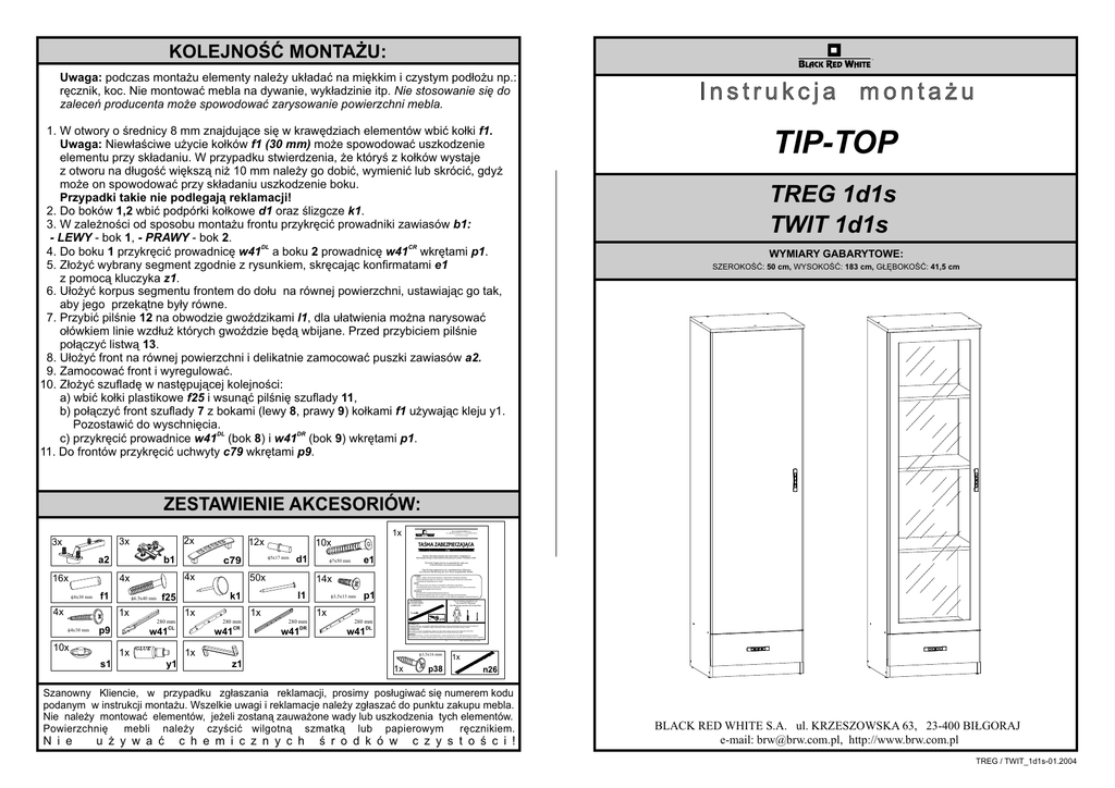 KOLEJNOŒÆ MONTA¯U: Uwaga: podczas monta¿u elementy nale¿y uk³adaæ na miêkkim i czystym pod³o¿u np.: rêcznik, koc. Nie montowaæ mebla na dywanie, wyk³adzinie itp. Nie stosowanie siê do zaleceñ producenta mo¿e spowodowaæ zarysowanie powierzchni mebla. 1. W otwory o œrednicy 8 mm znajduj¹ce siê w krawêdziach elementów wbiæ ko³ki f1. Uwaga: Niew³aœciwe u¿ycie ko³ków f1 (30 mm) mo¿e spowodowaæ uszkodzenie elementu przy sk³adaniu. W przypadku stwierdzenia, ¿e któryœ z ko³ków wystaje z otworu na d³ugoœæ wiêksz¹ ni¿ 10 mm nale¿y go dobiæ, wymieniæ lub skróciæ, gdy¿ mo¿e on spowodowaæ przy sk³adaniu uszkodzenie boku. Przypadki takie nie podlegaj¹ reklamacji! 2. Do boków 1,2 wbiæ podpórki ko³kowe d1 oraz œlizgcze k1. 3. W zale¿noœci od sposobu monta¿u frontu przykrêciæ prowadniki zawiasów b1: - LEWY - bok 1, - PRAWY - bok 2. DL CR 4. Do boku 1 przykrêciæ prowadnicê w41 a boku 2 prowadnicê w41 wkrêtami p1. 5. Z³o¿yæ wybrany segment zgodnie z rysunkiem, skrêcaj¹c konfirmatami e1 z pomoc¹ kluczyka z1. 6. U³o¿yæ korpus segmentu frontem do do³u na równej powierzchni, ustawiaj¹c go tak, aby jego przek¹tne by³y równe. 7. Przybiæ pilœnie 12 na obwodzie gwoŸdzikami l1, dla u³atwienia mo¿na narysowaæ o³ówkiem linie wzd³u¿ których gwoŸdzie bêd¹ wbijane. Przed przybiciem pilœnie po³¹czyæ listw¹ 13. 8. U³o¿yæ front na równej powierzchni i delikatnie zamocowaæ puszki zawiasów a2. 9. Zamocowaæ front i wyregulowaæ. 10. Z³o¿yæ szufladê w nastêpuj¹cej kolejnoœci: a) wbiæ ko³ki plastikowe f25 i wsun¹æ pilœniê szuflady 11, b) po³¹czyæ front szuflady 7 z bokami (lewy 8, prawy 9) ko³kami f1 u¿ywaj¹c kleju y1. Pozostawiæ do wyschniêcia. DL DR c) przykrêciæ prowadnice w41 (bok 8) i w41 (bok 9) wkrêtami p1. 11. Do frontów przykrêciæ uchwyty c79 wkrêtami p9. Instrukcja monta¿u TIP-TOP TREG 1d1s TWIT 1d1s WYMIARY GABARYTOWE: SZEROKOŒÆ: 50 cm, WYSOKOŒÆ: 183 cm, G£ÊBOKOŒÆ: 41,5 cm ZESTAWIENIE AKCESORIÓW: 2x 3x 3x 12x 1x 10x BLACK RED WHITE S.A. UL. KRZESZOWSKA 63, 23-400 BI£GORAJ www.brwsa.com.pl R BLACK RED WHITE TAŒMA ZABEZPIECZAJ¥CA THE ANTI-TOPPLE DEVICE / DAS SICHERUNGSBAND a2 16x b1 4x 4x f8x30 mm f1 4x c79 f6.5x40 mm 1x 280 mm f4x30 mm p9 w41 w41 CR e1 f7x50 mm Taœma zabezpieczaj¹ca jest elementem niezbêdnym dla bezpiecznego u¿ytkowania zakupionych przez Pañstwa mebli. This Anti-Topple device is essential for safe use of the furniture you have purchased. Das Sicherungsband ist ein unentbehrliches Element zur sicheren Benutzung der von Ihnen eingekauften Möbel. 14x l1 1x 280 mm CL d1 50x k1 f25 1x f5x17 mm Uwaga: Taœmê nale¿y zamocowaæ zgodnie z zaleceniami niniejszej instrukcji. Taœma zabezpieczaj¹ca nie mo¿e byæ stosowana jako zamiennik elementów standardowo do³¹czanych do mebli. Note: f3,5x13 mm The device has to be fixed in accordance with these instructions. The anti-topple device cannot be used as a supplement for any other accessories customarily supplied with furniture. p1 Hinweis: Das Band laut Gebrauchsanweisung fixieren. Das Sicherungsband darf nicht zu anderen Zwecken benutzt werden. Es darf nicht als Ersatzteil der anderen, zu den Möbeln beigefügten Elemente dienen. 1x 280 mm w41 DR Do monta¿u potrzebne s¹: You need for fitting-up: Zur Montage werden Sie brauchen: AKCESORIA: ACCESSORIES: ZUBEHÖR: 1x n26 1x 280 mm w41 f3,5x16 mm p38 INFORMACJA! Szanowny Kliencie, w przypadku zg³aszania reklamacji, prosimy pos³ugiwaæ siê numerem kodu podanym w instrukcji monta¿u. Wszelkie uwagi i reklamacje nale¿y zg³aszaæ do punktu zakupu mebla. INFORMATION! Dear client, in case of complaining, please use the code number given in the assembly instruction. Any comments and complaints should be reported at the furniture purchase outlet. HINWEIS! Sehr geehrte Kunden, im Falle einer Reklamation, geben Sie bitte die in der Montageeinleitung erwähnte Code-Nummer an. Mit allen diesbezüglichen Fragen und Reklamationen wenden Sie sich bitte an ihren Verkäufer. DL 1/4 10x 1x s1 1x y1 f3,5x16 mm z1 1x p38 TAŒMA ZABEZPIECZAJ¥CA 08.2001 1x n26 Szanowny Kliencie, w przypadku zg³aszania reklamacji, prosimy pos³ugiwaæ siê numerem kodu podanym w instrukcji monta¿u. Wszelkie uwagi i reklamacje nale¿y zg³aszaæ do punktu zakupu mebla. Nie nale¿y montowaæ elementów, je¿eli zostan¹ zauwa¿one wady lub uszkodzenia tych elementów. Powierzchniê mebli nale¿y czyœciæ wilgotn¹ szmatk¹ lub papierowym rêcznikiem. N i e u ¿ y w a æ c h e m i c z n y c h œ r o d k ó w c z y s t o œ c i ! BLACK RED WHITE S.A. ul. KRZESZOWSKA 63, 23-400 BI£GORAJ e-mail: [email protected], http://www.brw.com.pl TREG / TWIT_1d1s-01.2004 Symbol elementu 1 2 3 4 5 6 7 8 9 10 11 12 13 14 15 s1 e1 3 12 f1 f1 12 13 5 d1 Wymiary 1806x387 1806x387 500x408 467x387 467x360 467x80 495x165 350x120 350x120 417x120 428x348 1756x246 1724x14 1574x495 1574x495 Kod SW1-105 SW1-106 SW1-203 SW1-306 SW1-307 SW1-402 SW1-006 SW1-501 SW1-502 SW1-503 SW1-904 SW1-906 lh-1724 SW1-003 SW1-005 1 p1 w41 10 y1 2 1 y1 7 y1 8 p1 f1 p1 2 b1 DR 9 11 7 b1 w41CR 1 p1 5 p1 b1 w41DL f25 y1 2 PRAWY f25 d1 5 OPCJE LEWY y1 Regulacja frontów a2 y1 f1 4 14 15 6 6 cm 2-3 s1 e1 f1 f1 s1 e1 f1 s1 e1 k1 7 7 TREG / TWIT_1d1s-01.2004