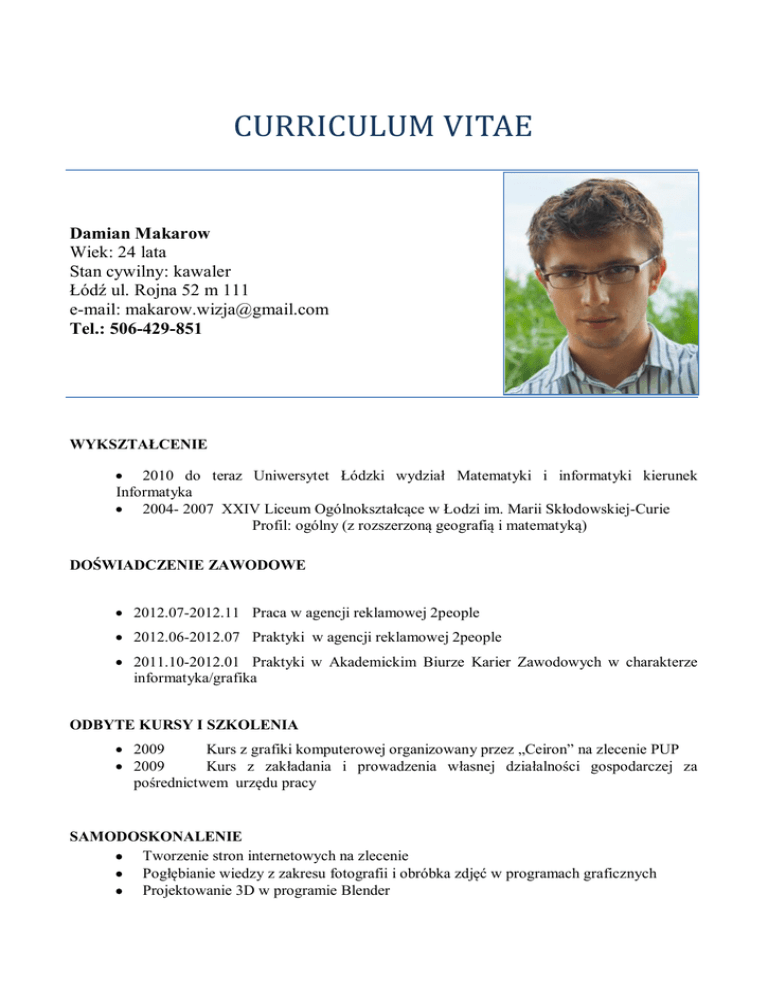 CURRICULUM VITAE Damian Makarow Wiek: 24 lata Stan cywilny: kawaler Łódź ul. Rojna 52 m 111 e-mail: [email protected] Tel.: 506-429-851 WYKSZTAŁCENIE 2010 do teraz Uniwersytet Łódzki wydział Matematyki i informatyki kierunek Informatyka 2004- 2007 XXIV Liceum Ogólnokształcące w Łodzi im. Marii Skłodowskiej-Curie Profil: ogólny (z rozszerzoną geografią i matematyką) DOŚWIADCZENIE ZAWODOWE 2012.07-2012.11 Praca w agencji reklamowej 2people 2012.06-2012.07 Praktyki w agencji reklamowej 2people 2011.10-2012.01 Praktyki w Akademickim Biurze Karier Zawodowych w charakterze informatyka/grafika ODBYTE KURSY I SZKOLENIA 2009 Kurs z grafiki komputerowej organizowany przez „Ceiron” na zlecenie PUP 2009 Kurs z zakładania i prowadzenia własnej działalności gospodarczej za pośrednictwem urzędu pracy SAMODOSKONALENIE Tworzenie stron internetowych na zlecenie Pogłębianie wiedzy z zakresu fotografii i obróbka zdjęć w programach graficznych Projektowanie 3D w programie Blender UMIEJĘTNOŚCI Znajomość języków obcych: język angielski: dobra język niemiecki: dostateczna Znajomość obsługi komputera i urządzeń biurowych: Programy biurowe: MS Office, Open Office Programy graficzne: Illustrator, Photoshop, InDesign, Flash, Blender Języki programowania: C#, Ada, JavaScript, PHP Systemy operacyjne: Ubuntu, Unix, Windows XP, Windows 7 Obsługa CMS Urządzenia biurowe: drukarki, skanery, ksero, aparat fotograficzny Prawo jazdy: kategorii B. ZAINTERESOWANIA Grafika komputerowa Fotografia Rysunek Psychologia Sport (piłka nożna, boks) Dobre kino znanych reżyserów Literatura fantastyczno-naukowa Kulinaria DODATKOWE ATUTY Sumienność, uczynność, zaradność Wyobraźnia, kreatywność Umiejętność bezwzrokowego pisania na klawiaturze Dobra prezencja, otwartość Posiadam lustrzankę cyfrową Posiadam tablet graficzny firmy Wacom CELE Podjęcie pracy na stanowisku programisty Otworzenie własnej działalności gospodarczej „ Wyrażam zgodę na przetwarzania moich danych osobowych zawartych w tym dokumencie dla potrzeb niezbędnych do realizacji procesu rekrutacji (zgodnie z ustawą z dnia 29.08. 1997 o Ochronie Danych Osobowych, Dz. U. Nr 133, poz 888)”.