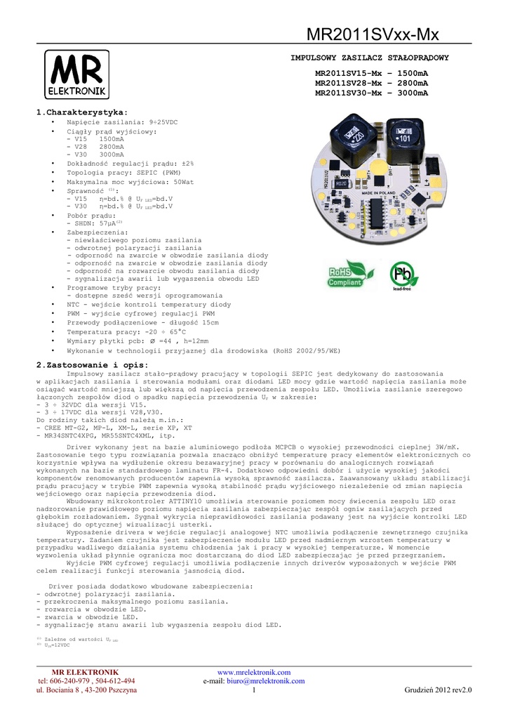 MR2011SVxx-Mx IMPULSOWY ZASILACZ STAŁOPRĄDOWY MR2011SV15-Mx – 1500mA MR2011SV28-Mx – 2800mA MR2011SV30-Mx – 3000mA 1.Charakterystyka: • • • • • • • • • • • • • • • Napięcie zasilania: 9÷25VDC Ciągły prąd wyjściowy: - V15 1500mA - V28 2800mA - V30 3000mA Dokładność regulacji prądu: ±2% Topologia pracy: SEPIC (PWM) Maksymalna moc wyjściowa: 50Wat Sprawność (1): - V15 η=bd.% @ UF LED=bd.V - V30 η=bd.% @ UF LED=bd.V Pobór prądu: - SHDN: 57µA(2) Zabezpieczenia: - niewłaściwego poziomu zasilania - odwrotnej polaryzacji zasilania - odporność na zwarcie w obwodzie zasilania diody - odporność na zwarcie w obwodzie zasilania diody - odporność na rozwarcie obwodu zasilania diody - sygnalizacja awarii lub wygaszenia obwodu LED Programowe tryby pracy: - dostępne sześć wersji oprogramowania NTC - wejście kontroli temperatury diody PWM - wyjście cyfrowej regulacji PWM Przewody podłączeniowe - długość 15cm Temperatura pracy: -20 ÷ 65°C Wymiary płytki pcb: ø =44 , h=12mm Wykonanie w technologii przyjaznej dla środowiska (RoHS 2002/95/WE) 2.Zastosowanie i opis: Impulsowy zasilacz stało-prądowy pracujący w topologii SEPIC jest dedykowany do zastosowania w aplikacjach zasilania i sterowania modułami oraz diodami LED mocy gdzie wartość napięcia zasilania może osiągać wartość mniejszą lub większą od napięcia przewodzenia zespołu LED. Umożliwia zasilanie szeregowo łączonych zespołów diod o spadku napięcia przewodzenia UF w zakresie: - 3 ÷ 32VDC dla wersji V15. - 3 ÷ 17VDC dla wersji V28,V30. Do rodziny takich diod należą m.in.: - CREE MT-G2, MP-L, XM-L, serie XP, XT - MR34SNTC4XPG, MR55SNTC4XML, itp. Driver wykonany jest na bazie aluminiowego podłoża MCPCB o wysokiej przewodności cieplnej 3W/mK. Zastosowanie tego typu rozwiązania pozwala znacząco obniżyć temperaturę pracy elementów elektronicznych co korzystnie wpływa na wydłużenie okresu bezawaryjnej pracy w porównaniu do analogicznych rozwiązań wykonanych na bazie standardowego laminatu FR-4. Dodatkowo odpowiedni dobór i użycie wysokiej jakości komponentów renomowanych producentów zapewnia wysoką sprawność zasilacza. Zaawansowany układu stabilizacji prądu pracujący w trybie PWM zapewnia wysoką stabilność prądu wyjściowego niezależenie od zmian napięcia wejściowego oraz napięcia przewodzenia diod. Wbudowany mikrokontroler ATTINY10 umożliwia sterowanie poziomem mocy świecenia zespołu LED oraz nadzorowanie prawidłowego poziomu napięcia zasilania zabezpieczając zespół ogniw zasilających przed głębokim rozładowaniem. Sygnał wykrycia nieprawidłowości zasilania podawany jest na wyjście kontrolki LED służącej do optycznej wizualizacji usterki. Wyposażenie drivera w wejście regulacji analogowej NTC umożliwia podłączenie zewnętrznego czujnika temperatury. Zadaniem czujnika jest zabezpieczenie modułu LED przed nadmiernym wzrostem temperatury w przypadku wadliwego działania systemu chłodzenia jak i pracy w wysokiej temperaturze. W momencie wyzwolenia układ płynnie ogranicza moc dostarczaną do diod LED zabezpieczając je przed przegrzaniem. Wyjście PWM cyfrowej regulacji umożliwia podłączenie innych driverów wyposażonych w wejście PWM celem realizacji funkcji sterowania jasnością diod. (1) (2) Driver posiada dodatkowo wbudowane zabezpieczenia: odwrotnej polaryzacji zasilania. przekroczenia maksymalnego poziomu zasilania. rozwarcia w obwodzie LED. zwarcia w obwodzie LED. sygnalizację stanu awarii lub wygaszenia zespołu diod LED. Zależne od wartości UF UIN=12VDC LED MR ELEKTRONIK tel: 606-240-979 , 504-612-494 ul. Bociania 8 , 43-200 Pszczyna www.mrelektronik.com e-mail: [email protected] 1 Grudzień 2012 rev2.0
