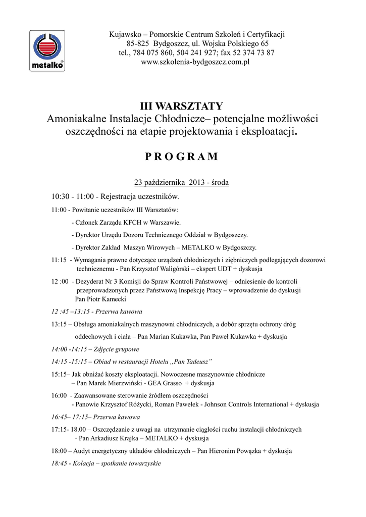 Kujawsko – Pomorskie Centrum Szkoleń i Certyfikacji 85-825 Bydgoszcz, ul. Wojska Polskiego 65 tel., 784 075 860, 504 241 927; fax 52 374 73 87 www.szkolenia-bydgoszcz.com.pl III WARSZTATY Amoniakalne Instalacje Chłodnicze– potencjalne możliwości oszczędności na etapie projektowania i eksploatacji. PROGRAM 23 października 2013 - środa 10:30 - 11:00 - Rejestracja uczestników. 11:00 - Powitanie uczestników III Warsztatów: - Członek Zarządu KFCH w Warszawie. - Dyrektor Urzędu Dozoru Technicznego Oddział w Bydgoszczy. - Dyrektor Zakład Maszyn Wirowych – METALKO w Bydgoszczy. 11:15 - Wymagania prawne dotyczące urządzeń chłodniczych i ziębniczych podlegających dozorowi technicznemu - Pan Krzysztof Waligórski – ekspert UDT + dyskusja 12 :00 - Dezyderat Nr 3 Komisji do Spraw Kontroli Państwowej – odniesienie do kontroli przeprowadzonych przez Państwową Inspekcję Pracy – wprowadzenie do dyskusji Pan Piotr Kamecki 12 :45 –13:15 - Przerwa kawowa 13:15 – Obsługa amoniakalnych maszynowni chłodniczych, a dobór sprzętu ochrony dróg oddechowych i ciała – Pan Marian Kukawka, Pan Paweł Kukawka + dyskusja 14:00 -14:15 – Zdjęcie grupowe 14:15 -15:15 – Obiad w restauracji Hotelu „Pan Tadeusz” 15:15– Jak obniżać koszty eksploatacji. Nowoczesne maszynownie chłodnicze – Pan Marek Mierzwiński - GEA Grasso + dyskusja 16:00 - Zaawansowane sterowanie źródłem oszczędności - Panowie Krzysztof Różycki, Roman Pawełek - Johnson Controls International + dyskusja 16:45– 17:15– Przerwa kawowa 17:15- 18.00 – Oszczędzanie z uwagi na utrzymanie ciągłości ruchu instalacji chłodniczych - Pan Arkadiusz Krajka – METALKO + dyskusja 18:00 – Audyt energetyczny układów chłodniczych – Pan Hieronim Powązka + dyskusja 18:45 - Kolacja – spotkanie towarzyskie 24 października 2013 – czwartek 8.30 – Odzysk ciepła z urządzeń chłodniczych – Pan Włodzimierz Nekanda Trepka 9:15 - Nowości w automatyce firmy Danfoss. Nowy system części zamiennych do zaworów Danfofoss - Pan Mikołaj Klenkiewicz – Danfoss Poland + dyskusja 10:00 – Wpływ temperatury i wilgotności powietrza oraz prędkości i ilości wymiany powietrza na skuteczność odprowadzania ciepła podczas wychładzania półtusz wołowych - Roman Krzesłowski + dyskusja 10:45 – 11.15 – Przerwa kawowa 11:15 – Problemy w eksploatacji urządzeń chłodniczych na przykładzie tunelu Frigoscandia 220W oraz wpływ właściwej obsługi technicznej i utrzymania ruchu na ich efektywne wykorzystanie - Mateusz Lisewski + dyskusja 12:00 – Chłodnictwo w produkcji piwa – Pan Krzysztof Żubkowski - GEA Grasso 12:45 – Obserwacje z eksploatacji urządzeń chłodniczych okiem serwisanta – Pan Tomasz Pellowski – współpracuje z firmą COLDEX Zakład Usług Przemysłowych 13:30 - Podsumowanie i zakończenie III Warsztatów (ankieta, zaświadczenia potwierdzające udział W III Warsztatach) 14:00 - Obiad