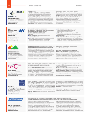 30 Digiprint PL Sp. k. ul. Kolejowa 5/7, 01-217 Warszawa tel.: 22 295 03 80, fax: 22 295 03 91 [email protected] www.digiprint.pl EFI Belgium bvba Brixtonlaan 9 B1930 Zaventem Belgium tel.: +32 2 749 9420 www.efi.com Kontakt: Reprograf SA Maciej Firlej +48 698 698 607 tel.: +48 (22) 539 40 63 [email protected] www.reprograf.com.pl EST DIFFUSION Michał Tombiński ul. Czajki 20, 34-511 Kościelisko tel./fax: 18 207 04 05, 18 207 07 01 e-mail: [email protected] www.tompak.pl SYSTEMY MIS/ERP DIGIPRINT PL – TWÓJ DOSTAWCA ROZWIĄZAŃ ESKO Firma Esko jest liderem na rynku dostawców naświetlarek CtP flekso, stołów wycinająco-bigujących Kongsberg oraz zintegrowanego i kompleksowego oprogramowania dla projektantów i producentów opakowań, studiów prepress, drukarni, wydawnictw oraz firm reprograficznych. W OFERCIE: znane i uznane oprogramowanie Esko Suite – m.in. Artios-Cad, ArtPro, PackEdge, EFI JEST ŚWIATOWYM LIDEREM W ZAKRESIE SYSTEMÓW MIS I WEB-TO-PRINT, KTÓRE SĄ UŻYTKOWANE PRZEZ BLISKO 26 TYSIĘCY DRUKARŃ: MIS/ERP: I EFI PrintSmith – kompletny system MIS dla małych drukarń I EFI Pace – elastyczny, zintegrowany system MIS do zarządzania posiadający wbudowane narzędzie do impozycji prac łączonych PROGRAM IMPACT firmy ARDENSOFTWARE LTD POZWALA ZAPROJEKTOWAĆ OPAKOWANIE (POS) z wolnej ręki, parametrycznie, z wykorzystaniem elementów standardowych, znajdujących się w bazie programu, lub przez modyfikację gotowych standardów FEFCO lub ECMA lub import plików klienta i projektowanie na podstawie otrzymanych danych. Import grafiki, nakładanie jej na projekt umożliwia tworzenie prezentacji gotowego produktu w różnych fazach składania, EYEC JEST WIODĄCYM DOSTAWCĄ W BRANŻY SYSTEMÓW DO INSPEKCJI WIZYJNEJ. EyeC Polska ul. Platynowa 20, 55-093 Kiełczów tel.: +48 512 354 354 [email protected] www.eyecpolska.pl Grafikus – Systemy Graficzne Sp. z o.o. ul. Daniszewska 2, 03-230 Warszawa Kontakt: tel.: 22 594 09 00 [email protected] www.grafikus.com.pl INFOSYSTEMS S.A. ul. Okrzei 1A, 03-715 Warszawa tel.: 22 333 83 50 fax: 22 333 83 75 www.infosystems.pl System PROOFILER GRAPHIC przeznaczony jest zarówno dla działu prepress drukarni, jak i jej klientów końcowych. Umożliwia szybką analizę zgodności plików PDF z drukarni z projektami klienta (PDF do PDF), a w późniejszym etapie PDF do montażu w procesie step&repeat oraz montaż do montażu, także wspólny (inne formaty plików GMG: colorProof – do produkcji cyfrowych wydruków próbnych; FlexoProof – do proofingu fleksograficznego; ProofControl – do określania odchylenia od norm w druku; colorServer – do konwertowania grafiki pomiędzy przestrzeniami barwnymi; dotProof – moduł do wydruku zrastrowanych proofów z 1-bitowych TIFF’ów, inkOptimizer – do obróbki plików PDF. REKLAMA Automation Engine, Color Engine, Imaging Engine, WebCenter. Portfolio uzupełniają programy dla projektantów i agencji reklamowych z pakietu Studio: Visualizer, Store Visualizer, Studio Designer, Studio for Boxes, Studio for Flexibles, Studio for Shrink Sleeve. Equinox – zdobywca nagrody Amerykańskiego Zrzeszenia Fleksografów – zestaw oprogramowania do konwersji kolorów (specjalnych, RGB, CMYK) do 5, 6 lub 7 kolorów procesowych. I EFI Monarch – inteligentny i w pełni zautomatyzowany system ERP dla wyspecjalizowanych drukarń I EFI Radius – zintegrowany system ERP dla branży opakowaniowej i produkcji etykiet. WEB-TO-PRINT: I EFI Digital StoreFront – interaktywna platforma e-commerce idealna zarówno dla druku offsetowego, jak również cyfrowego, spersonalizowanego, wielkiego formatu i druku danych zmiennych. z włożonym przedmiotem, postawionego na półkach sklepowych. PLOTERY LASERCOMB POZWALAJĄ NA WYCIĘCIE MODELU, sprawdzenie jego poprawności oraz na produkcję krótkich serii. Dodatkowe wyposażenie w przystawkę frezującą umożliwia wykonanie imitacji kanalika bigującego, a skaner paserów pozwala na skrócenie czasu wykonania serii opakowań z nadrukiem. to: ai, bmp, jpg, tiff). Zakres inspekcji pozwala na wykrywanie niepożądanych różnic na całym obszarze opakowania. EyeC wraz z firmą Digiprint przygotowały integrację pomiędzy Proofiler Graphic a modułem Esko Automation Engine, tworząc podwaliny pod nowy standard automatyzacji workflow, co pozwala na pełną automatyzację procesu inspekcji plików. Zapraszamy do współpracy! COLORGATE: Productionserver 7 (PS7) – uniwersalny RIP gwarantujący doskonałe zarządzanie barwą; Filmgate 7 – do świecenia na kliszach stosowanych do bezchemicznych, wysokojakościowych produkcji; Proofgate 7 – proofing cyfrowy. SISTRADE – oprogramowanie branżowe ERP dla przemysłu poligraficznego i opakowaniowego. X-RITE: NetProfiler 3 do wymiany danych spektralnych. INFOSYSTEMS SA TO JEDEN Z NAJWIĘKSZYCH W EUROPIE PRODUCENTÓW DEDYKOWANYCH ROZWIĄZAŃ INFORMATYCZNYCH DLA BRANŻY OPAKOWANIOWEJ. Dostarczamy rozwiązania usprawniające zoptymalizowaną produkcją etykiet i opakowań zarządzanie przedsiębiorstwami, od lat utrzymując iPackManager, wspomagający kadry kierownicze pozycję lidera w dziedzinie zintegrowanych w kompleksowym zarządzaniu procesami i zachosystemów zarządzania klasy Enterprise dla waniu stałej kontroli nad kosztami w przedsięproducentów opakowań giętkich, tekturowych oraz biorstwie opakowaniowym. Oprócz rozwiązań etykiet. Naszym klientom z branży opakowaniowej informatycznych swoim klientom oferujemy także oferujemy obecnie najnowszy produkt – zintegroskuteczną pomoc w pozyskaniu środków Unii wany system informatyczny do zarządzania Europejskiej na realizację projektów inwestycyjnych. SYSTEMY MIS/ERP MIS CICERO 9.0 – NOWE FUNKCJONALNOŚCI SYSTEMU DO ZARZĄDZANIA DRUKARNIĄ. 31 REKLAMA System MIS Cicero należący do jednej z największych grup software’owych na rynku czeskim o nazwie Stapro Group s.r.o. jest od 1995 r. oferowany dla przemysłu poligraficznego, gdzie niemal jako mon