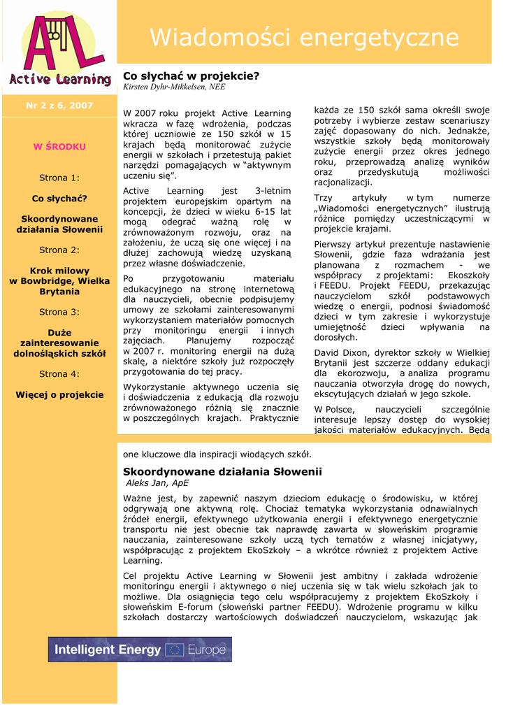 Wiadomości energetyczne Co słychać w projekcie? Kirsten Dyhr-Mikkelsen, NEE Nr 2 z 6, 2007 W ŚRODKU Strona 1: Co słychać? Skoordynowane działania Słowenii Strona 2: Krok milowy w Bowbridge, Wielka Brytania Strona 3: Duże zainteresowanie dolnośląskich szkół Strona 4: Więcej o projekcie W 2007 roku projekt Active Learning wkracza w fazę wdrożenia, podczas której uczniowie ze 150 szkół w 15 krajach będą monitorować zużycie energii w szkołach i przetestują pakiet narzędzi pomagających w “aktywnym uczeniu się”. Active Learning jest 3-letnim projektem europejskim opartym na koncepcji, że dzieci w wieku 6-15 lat mogą odegrać ważną rolę w zrównoważonym rozwoju, oraz na założeniu, że uczą się one więcej i na dłużej zachowują wiedzę uzyskaną przez własne doświadczenie. Po przygotowaniu materiału edukacyjnego na stronę internetową dla nauczycieli, obecnie podpisujemy umowy ze szkołami zainteresowanymi wykorzystaniem materiałów pomocnych przy monitoringu energii i innych zajęciach. Planujemy rozpocząć w 2007 r. monitoring energii na dużą skalę, a niektóre szkoły już rozpoczęły przygotowania do tej pracy. Wykorzystanie aktywnego uczenia się i doświadczenia z edukacją dla rozwoju zrównoważonego różnią się znacznie w poszczególnych krajach. Praktycznie każda ze 150 szkół sama określi swoje potrzeby i wybierze zestaw scenariuszy zajęć dopasowany do nich. Jednakże, wszystkie szkoły będą monitorowały zużycie energii przez okres jednego roku, przeprowadzą analizę wyników oraz przedyskutują możliwości racjonalizacji. numerze Trzy artykuły w tym „Wiadomości energetycznych” ilustrują różnice pomiędzy uczestniczącymi w projekcie krajami. Pierwszy artykuł prezentuje nastawienie Słowenii, gdzie faza wdrażania jest planowana z rozmachem we współpracy z projektami: Ekoszkoły i FEEDU. Projekt FEEDU, przekazując nauczycielom szkół podstawowych wiedzę o energii, podnosi świadomość dzieci w tym zakresie i wykorzystuje umiejętność dzieci wpływania na dorosłych. David Dixon, dyrektor szkoły w Wielkiej Brytanii jest szczerze oddany edukacji dla ekorozwoju, a analiza programu nauczania otworzyła drogę do nowych, ekscytujących działań w jego szkole. W Polsce, nauczycieli szczególnie interesuje lepszy dostęp do wysokiej jakości materiałów edukacyjnych. Będą one kluczowe dla inspiracji wiodących szkół. Skoordynowane działania Słowenii Aleks Jan, ApE Ważne jest, by zapewnić naszym dzieciom edukację o środowisku, w której odgrywają one aktywną rolę. Chociaż tematyka wykorzystania odnawialnych źródeł energii, efektywnego użytkowania energii i efektywnego energetycznie transportu nie jest obecnie tak naprawdę zawarta w słoweńskim programie nauczania, zainteresowane szkoły uczą tych tematów z własnej inicjatywy, współpracując z projektem EkoSzkoły – a wkrótce również z projektem Active Learning. Cel projektu Active Learning w Słowenii jest ambitny i zakłada wdrożenie monitoringu energii i aktywnego o niej uczenia się w tak wielu szkołach jak to możliwe. Dla osiągnięcia tego celu współpracujemy z projektem EkoSzkoły i słoweńskim E-forum (słoweński partner FEEDU). Wdrożenie programu w kilku szkołach dostarczy wartościowych doświadczeń nauczycielom, wskazując jak dokonać integracji monitoringu energii oraz innych działań aktywnego uczenia się z rocznymi planami nauczania, a także wskazać, jak formy tego działania mogą być modyfikowane. Informacje te mogą także być wykorzystane w tworzeniu bazy do stabilnej integracji tematyki i metod z programami nauczania. odnawialnych źródeł energii itp. Głównym tematem warsztatów dla nauczycieli były praktyczne przykłady. Przedstawiono istniejące i możliwe do przeprowadzenia w przyszłości w szkołach ćwiczenia, w których uczniowie uczestniczą aktywnie w zdobywaniu wiedzy o energii. Biorący udział w warsztatach nauczyciele wykazali duże zainteresowanie prowadzeniem prezentowanych ćwiczeń. Niektórzy z nich mają już doświadczenie w prowadzeniu podobnych zajęć, mogli więc podzielić się sugestiami z innymi. Dr Klimat – przykład ćwiczenia aktywnej metody uczenia się. Dyrektorzy szkół i inni zarządzający nimi oraz nauczyciele odgrywają kluczową rolę we wdrażaniu monitoringu zużycia energii i technik aktywnego uczenia się w swoich szkołach. Dlatego w listopadzie i grudniu 2006 roku zorganizowaliśmy we współpracy z Ekoszkołami i słoweńskim E-forum dwa warsztaty: Pierwszy - dla dyrektorów szkół oraz administratorów budynków szkolnych Drugi - dla nauczycieli. Celem obydwu warsztatów była promocja odnawialnych źródeł energii i efektywnego jej wykorzystania, a także prezentacja możliwości monitoringu energii i technik aktywnego uczenia się. Na warsztatach dla dyrektorów i administratorów, nacisk położony był na kwestie finansowe i techniczne. Dyskutowano możliwości efektywnego wykorzystania energii w szkołach, zarówno te niewymagające nakładów finansowych, jak i te związane z inwestycjami w wymianę okien, izolację budynku, „uzdrowienie” energii, wykorzystanie To ćwiczenie, zaproponowane przez słoweńskie E-forum, składa się z trzech części. W pierwszej, osoba przebrana za lekarza wchodzi do sali i prezentuje wykład na temat zmian w środowisku i wpływu człowieka na te zmiany. Ktoś jest chory i ma temperaturę, a tym chorym jest planeta Ziemia. W części drugiej uczniowie, jako detektywi energii, podzieleni na grupy, wykonują określone zadania. Chodzą po szkole, sprawdzając sytuację w budynku (mierzą temperaturę wnętrza, sprawdzają rury, światło itp.), a w oparciu o wyniki tego „śledztwa” uczą się możliwości poprawy sytuacji. W części trzeciej każda grupa przedstawia wnioski, po których następuje dyskusja możliwościach poprawy wykorzystania energii w szkole. Ćwiczenie może być też pr
