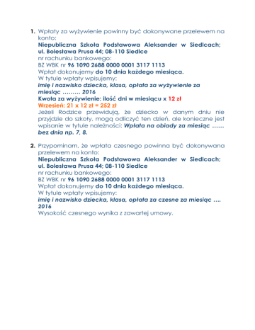 1. Wpłaty za wyżywienie powinny być dokonywane przelewem na konto: Niepubliczna Szkoła Podstawowa Aleksander w Siedlcach; ul. Bolesława Prusa 44; 08-110 Siedlce nr rachunku bankowego: BZ WBK nr 96 1090 2688 0000 0001 3117 1113 Wpłat dokonujemy do 10 dnia każdego miesiąca. W tytule wpłaty wpisujemy: imię i nazwisko dziecka, klasa, opłata za wyżywienie za miesiąc ……… 2016 Kwota za wyżywienie: ilość dni w miesiącu x 12 zł Wrzesień: 21 x 12 zł = 252 zł Jeżeli Rodzice przewidują, że dziecko w danym dniu nie przyjdzie do szkoły, mogą odliczyć ten dzień, ale konieczne jest wpisanie w tytule należności: Wpłata na obiady za miesiąc …… bez dnia np. 7, 8. 2. Przypominam, że wpłata czesnego powinna być dokonywana przelewem na konto: Niepubliczna Szkoła Podstawowa Aleksander w Siedlcach; ul. Bolesława Prusa 44; 08-110 Siedlce nr rachunku bankowego: BZ WBK nr 96 1090 2688 0000 0001 3117 1113 Wpłat dokonujemy do 10 dnia każdego miesiąca. W tytule wpłaty wpisujemy: imię i nazwisko dziecka, klasa, opłata za czesne za miesiąc …. 2016 Wysokość czesnego wynika z zawartej umowy.