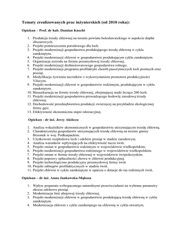 Tematy zrealizowanych prac inżynierskich (od 2010 roku): Opiekun – Prof. dr hab. Damian Knecht 1. Produkcja trzody chlewnej na terenie powiatu bolesławieckiego w aspekcie dopłat obszarowych. 2. Projekt pomieszczenia porodowego dla loch. 3. Projekt modernizacji gospodarstwa produkującego trzodę chlewną w cyklu zamkniętym. 4. Projekt modernizacji chlewni w gospodarstwie produkującym cyklu zamkniętym. 5. Organizacja rozrodu na fermie przemysłowej trzody chlewnej. 6. Projekt modernizacji drobnotowarowego gospodarstwa rolnego. 7. Projekt modernizacji programu profilaktyki chorób pasożytniczych loch prośnych oraz prosiąt. 8. Modyfikacja żywienia tuczników z wykorzystaniem promotora produkcyjności Vilocym. 9. Projekt modernizacji chlewni w gospodarstwie rodzinnym, produkującym w cyklu zamkniętym. 10. Bioasekuracja na fermie trzody chlewnej, obejmującej stado liczące 200 loch. 11. Projekt modernizacji gospodarstwa prowadzącego hodowlę zarodową trzody chlewnej. 12. Dochodowość przedsiębiorstwa produkcji zwierzęcej na przykładzie ekologicznej fermy gęsi. 13. Efektywność ekonomiczna stajni rekreacyjnej. Opiekun - dr inż. Jerzy Akińcza 1. Analiza wskaźników ekonomicznych w gospodarstwie utrzymującym trzodę chlewną. 2. Charakterystyka gospodarstw utrzymujących trzodę chlewną na terenie gminy Brzostek w woj. Podkarpackim. 3. Użytkowość rozpłodowa loch i odchów prosiąt w stadzie zarodowym. 4. Analiza warunków wpływających na efektywność tuczu świń. 5. Projekt zmian w gospodarstwie rodzinnym w województwie wielkopolskim. 6. Projekt modernizacji gospodarstwa rodzinnego w województwie wielkopolskim. 7. Projekt zmian w fermie trzody chlewnej w województwie świętokrzyskim. 8. Projekt poprawy opłacalności chowu w chlewni produkcyjnej. 9. Projekt technologiczno produkcyjny przemysłowej fermy świń. 10. Projekt zabiegów profilaktycznych w stadzie świń. 11. Projekt chlewni w cyklu zamkniętym w oparciu o dotacje do ras rodzimych świń. Opiekun – dr inż. Anna Jankowska-Mąkosa 1. Wpływ preparatu wzbogaconego naturalnymi przeciwciałami na wybrane parametry okresu odchowu prosiąt. 2. Modernizacja linii ubojowej trzody chlewnej. 3. Projekt modernizacji chlewni w gospodarstwie produkującą trzodę chlewną w cyklu zamkniętym. 4. Modernizacja chlewni z cyklu zamkniętego na chlewnię w cyklu otwartym.