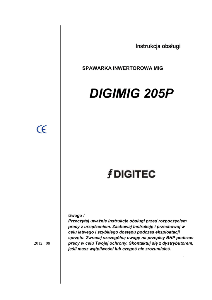 Instrukcja obsługi SPAWARKA INWERTOROWA MIG DIGIMIG 205P 2012. 08 Uwaga ! Przeczytaj uważnie Instrukcję obsługi przed rozpoczęciem pracy z urządzeniem. Zachowaj Instrukcję i przechowuj w celu łatwego i szybkiego dostępu podczas eksploatacji sprzętu. Zwracaj szczególną uwagę na przepisy BHP podczas pracy w celu Twojej ochrony. Skontaktuj się z dystrybutorem, jeśli masz wątpliwości lub czegoś nie zrozumiałeś. . 1. UWAGI OGÓLNE Uruchomienia i eksploatacji urządzenia można dokonać tylko po dokładnym zapoznaniu się z niniejszą Instrukcją Obsługi. Ze względu na ciągły rozwój techniczny urządzenia, pewne jego funkcje mogą ulegać modyfikacji i ich działanie może różnić się szczegółami od opisów w instrukcji. Nie jest to błędem urządzenia, lecz wynikiem postępu i ciągłych prac modyfikacyjnych urządzenia. Przed uruchomieniem urządzenia należy: • Sprawdzić stan połączeń elektrycznych i mechanicznych. Zabrania się używać uchwytów i przewodów prądowych o uszkodzonej izolacji. Niewłaściwa izolacja uchwytów i przewodów prądowych grozi porażeniem prądem elektrycznym • Zadbać o właściwe warunki pracy, tj. zapewnić właściwą temperaturę, wilgotność i wentylację w miejscu pracy. Poza pomieszczeniami zamkniętymi chronić przed opadami atmosferycznymi. • Umieścić prostownik w miejscu umożliwiającym jego łatwą obsługę. Osoby obsługujące spawarkę powinny: • posiadać uprawnienia do spawania elektrycznego metodą MIG/MAG • znać i przestrzegać przepisy BHP obowiązujące przy wykonywaniu prac spawalniczych • używać właściwego, specjalistycznego sprzętu ochronnego: rękawic, fartucha, butów gumowych, tarczy lub przyłbicy spawalniczej z odpowiednio dobranym filtrem. • znać treść niniejszej instrukcji obsługi i eksploatować spawarkę zgodnie z jej przeznaczeniem Należy stosować tylko atestowane butle z poprawnie działającym reduktorem. Butla powinna być transportowana i stać w pozycji pionowej. Chronić butle przed wpływem wysokiej temperatury, przewróceniem i uszkodzeniem. Wszelkie naprawy urządzenia mogą być dokonywane wyłącznie po odłączeniu wtyczki z gniazdka zasilającego. Gdy urządzenie jest podłączone do sieci niedozwolone jest dotykanie gołą ręką ani przez wilgotną odzież żadnych elementów tworzących obwód prądu spawania. Zabronione jest zdejmowanie osłon zewnętrznych przy urządzeniu włączonym do sieci. Wszelkie przeróbki prostownika we własnym zakresie są zabronione i mogą stanowić pogorszenie warunków bezpieczeństwa. Wszelkie prace konserwacyjne i remontowe mogą być przeprowadzane wyłącznie przez uprawnione osoby z zachowaniem warunków bezpieczeństwa pracy obowiązujących dla urządzeń elektrycznych. Zabrania się eksploatacji spawarki w pomieszczeniach zagrożonych wybuchem lub pożarem! Stanowisko spawalnicze wyposażone powinno być w sprzęt gaśniczy Po zakończeniu pracy przewód zasilający urządzenie należy odłączyć od sieci. Uszkodzenie urządzenia spowodowane niewłaściwą obsługą powoduje utratę uprawnień z tytułu gwarancji. Wszelkie przeróbki prostownika są zabronione i powodują utratę gwarancji. 2. PRZEZNACZENIE Spawarka DIGIMIG 205P służy do spawania ręcznego stali konstrukcyjnych niskowęglowych, stopowych i nierdzewnych, a także stopów miedzi i tytanu. Umożliwia spawanie metodą MMA (elektrodą otuloną) oraz w osłonie gazów ochronnych metodą MIG/MAG oraz TIG . Urządzenie wykorzystywane może być z powodzeniem do spawania rur, w przemyśle petrochemicznym, naprawy form, budownictwie, motoryzacji, rzemiośle itp. 3. WPROWADZENIE W projektowaniu i konstrukcji urządzenia DIGIMIG 205P wykorzystano najnowsze osiągnięcia w zakresie technologii PWM (modulacja szerokości impulsów) oraz modułów IGBT (tranzystory bipolarne z izolowaną bramką), mogące zmieniać częstotliwość pracy do wartości średnich, co skutkuje zamianą tradycyjnego, ciężkiego przetwornika częstotliwości na poręczny przetwornik o średniej częstotliwości, charakteryzujący się małymi rozmiarami i wagą, niskim poborem mocy itp. Urządzenie posiada synergiczne sterowanie prądem i napięciem spawania. Spawarka wyposażona jest w automatyczne zabezpieczenia termiczne, przeciążeniowe i nadprądowe. 3.1 Zasada pracy Zasada pracy urządzenia DIGIMIG 205P pokazana została na poniższym schemacie. Jednofazowe napięcie zasilające 230V o częstotliwości roboczej AC jest wyprostowane do DC (około 312V), następnie przetworzone do średniej częstotliwości AC (około 20kHz) w urządzeniu inwertorowym (moduł IGBT), po obniżeniu napięcia przez transformator pośredni (transformator główny) oraz wyprostowaniu przez prostownik średniej częstotliwości. (oparty na szybkich diodach FR), a następnie przetworzony jest przez wybrany moduł IGBT do postaci DC. W obwodzie zastosowano układ prądowego sprzężenia zwrotnego w celu zapewnienia stabilnej wartości prądu wyjściowego. W międzyczasie, prąd spawania może być regulowany krokowo w sposób ciągły w celu osiągnięcia założonej celu roboczego. 3.2 Charakterystyka napięciowo – prądowa DIGIMIG 205P ACDC posiada doskonałą charakterystykę napięciowo – prądową, której kształt pokazano na poniższym wykresie.. Zależność pomiędzy klasycznym znamionowym napięciem stanu jałowego U2 oraz klasycznym prądem spawania I2 pokazano poniżej: 3 3.3 Zasada spawania metodą MIG/MAG 3.4 Cykl pracy i przegrzanie Litera “X” określa cykl pracy , który jest określony jako stosunek czasu w którym urządzenie może pracować w sposób ciągły do określonego czasu cyklu (10 minut). Współczynnik cyklu rozumiany jest jako stosunek czasu ciągłej pracy do cyklu 10 minutowego, dla znamionowego prądu spawania. Jeśli urządzenie ulega przeciążeniu moduł IGBT jest chroniony przed przegrzaniem poprzez instalację ochronną, która wyłącza zasilanie