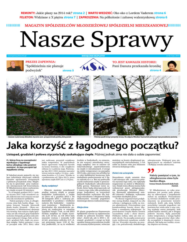 REMONTY: Jakie plany na 2014 rok? strona 2 | WARTO WIEDZIEĆ: Oko oko z Lordem Vaderem strona 6 FELIETON: Widziane z X piętra strona 7 | ZAPROSZENIA: Na półkolonie i zabawę walentynkową strona 6 magazyn spółdzielców młodzieżowej spółdzielni mieszkaniowej Nasze Sprawy MIESIĘCZNIK BEZPŁATNY [email protected] nr 42 | luty | 2014 PREZES ZAPEWNIA: TO JEST KAWAŁEK HISTORII: "Spółdzielnia nie planuje podwyżek" strona 5 Pani Danuta przekazała kronikę Fot. MSM Fot. Sławomir Kowalski strona 4 Jeszcze w pierwszej dekadzie stycznia aura przypominała polską złotą jesień Później spadł śnieg i przyszły mrozy. Na zdjęciu Wiesław Szymański pokazuje tuje posadzone jesienią Jaka korzyść z łagodnego początku? Listopad, grudzień i połowa stycznia były zaskakująco ciepłe. Później jednak zima nie dała o sobie zapomnieć Ci, którzy liczą na oszczędności wynikające z łagodnego końca ubiegłego roku powinni pamiętać, że jego początek był wyjątkowo zimny. W lokalnej prasie pojawiły się mylące informacje dotyczące niskich kosztów ogrzewania związanych z późnym przyjściem zimy. Mogłoby się to sprawdzić przy rozliczeniu miesięcznym lub kwartalnym. W Młodzieżowej okres rozliczeniowy ciepła wynosi 12 miesięcy. To, że listopad, grudzień 2013 r. i połowa stycznia 2014 r. były stosunkowo ciepłe, niekoniecznie musi oznaczać oszczędności dla mieszkańców spółdzielni. - Należy pamiętać o tym, że ubiegłoroczna zima była bardzo długa - wyjaśnia Ireneusz Tomasik, kierownik działu Analiz i Kontroli. - Okres rozliczeniowy w Młodzieżowej obejmuje trzy terminy. Stan zużycia ciepła spisywany jest dla różnych grup budynków na koniec listopada, grudnia (zdecydowana większość) i lutego. Fakt, że listopad i grudzień były ciepłe nie powoduje nadpłat. Należy pamiętać o tym, że początek roku 2013, który także jest rozliczany, przyniósł wyjątkowo niskie temperatury. W poprzednich latach ogrzewanie wyłączane bywało na koniec kwietnia, w ubr. wyjątkowo robiono to w połowie maja. Porównując lata 2013 i 2012 możemy zauważyć wzrost zużycia ciepła o 5,2 proc., natomiast kosztów o 11,2 proc. Wynika to z podniesienia od 1 lipca 2013 r. przez operatora ciepła EDF cen o 5,79 proc. Będą nadpłaty? - Obecnie możemy przedstawić analizę zużycia ciepła w grupie budynków rozliczanych z ciepła za okres od 1 grudnia 2012 r. do 30 listopada 2013 r. (odczyty podzielników w grudniu) i wielkości zużycia dla budynków - wyjaśnia nasz rozmówca. - Rozliczenia indywidualne dla mieszkańców pojawią się tradycyjnie w ostatnim tygodniu lutego. I tak, za rok 2013 średnia nadpłata za ciepło wynosiła 2,25 zł/m2, za rok 2012 była znacznie wyższa i wynosiła 5,26 zł/m2, przeciętna zaliczka 2,11 zł, zaś przeciętny koszt 1,92 zł. Należy podkreślić, że są to wielkości średnie w budynkach, co oznacza, że nie wszyscy mieszkańcy otrzymają nadpłaty. Jest to zależne od indywidualnego zapotrzebowania na ciepło w mieszkaniach. Z uwagi na niskie temperatury na początku 2013 roku, pierwszy raz od kilku lat w całej Spółdzielni konieczne było dodatkowo podwyższenie od 1 lipca zaliczki na c.o. Bez tej podwyżki wynik rozliczenia ciepła w poszczególnych budynkach zdecydowanie byłby gorszy. Natomiast nowe zaliczki, które będą obowiązywały od 1 marca tego roku (dla grudniowej grupy budynków) są oczywiście indywidualnie wyliczone dla każdego mieszkania i obejmować będą niekorzystne warunki pogodowe minionego okresu rozliczeniowego. Akcja zima W planie gospodarczo finansowym Spółdzielni zawsze są zaplanowane środki na pokrycie kosztów "akcji zima". Jeżeli tak, jak w 2013 r. (listopad- grudzień) z uwagi na brak opadów śniegu przewidziane środki nie zostaną wykorzystane, wówczas mniejsze są koszty eksploatacji poszczególnych nieruchomości, a ich saldo na koniec roku jest bilansem otwarcia kolejnego roku. Zieleń nie ucierpiała Stosunkowo ciepłe ostatnie dwa i pół miesiąca ubr. i pierwsza polowa stycznia tego roku, nie wpłynęły negatywnie na zieleń w Młodzieżowej. Dzięki temu dłużej można było wykonywać prace pielęgnacyjne. Jak przekonuje Wiesław Materna, kierownik administracji osiedli Lelewela i Kołłątaja, wykonano wszystkie niezbędne prace. - Po okresie wegetatywnym podjęliśmy szereg działań, mających na celu ochronę i pielęgnację roślin na terenie administracji. Przycinaliśmy oraz kształtowaliśmy korony drzew, dbaliśmy o nasadzenia niskopienne. Za pozwoleniem Urzędu Miasta Torunia wycinaliśmy suche i chore drzewa. Delikatne rośliny, takie jak róże zostały okryte. Na początku jesieni przy trasie średnicowej nasadzone zostało 280 tuj. Wszystkie drzewka się przyjęły i nie potrzebowały dodatkowego zabezpieczenia. Większość prac pielęgnacyjnych na osiedlach Lelewela i Kołłątaja została zakończona. Należy pamiętać o tym, że ubiegłoroczna zima była bardzo długa. Ireneusz Tomasik, kierownik działu Analiz i Kontroli. W Młodzieżowej, co roku przewidziana jest pewna pula pieniędzy na odtworzenie i uzupełnienie zieleni na osiedlach. Przewidziane są również dodatkowe środki przeznaczone na poszerzenie terenów zielonych. Jeżeli całą zimę byłyby przychylne warunki pogodowe nie powinno być wielu strat, a więc wiosną wydamy mniej pieniędzy. Jeśli jednak będzie zimniej, jak w drugiej połowie stycznia, będą panowały niskie temperatury, a śniegu będzie niewiele, mogą powstać duże szkody, szczególnie w skupinach i żywopłotach. Jak będą one wielkie, ocenimy dopiero na wiosnę. 2 luty 2014 [email protected] W tym roku, tak jak w latach poprzednich, na prace remontowe Młodzieżowa Spółdzielnia Mieszkaniowa przeznaczy około 8 mln złotych. spółdzielcami są możliwością żywej dyskusji na ten temat. - Ostatnim z czynników są potrzeby wynikające z bieżącej eksploatacji budynków. Początek roku t