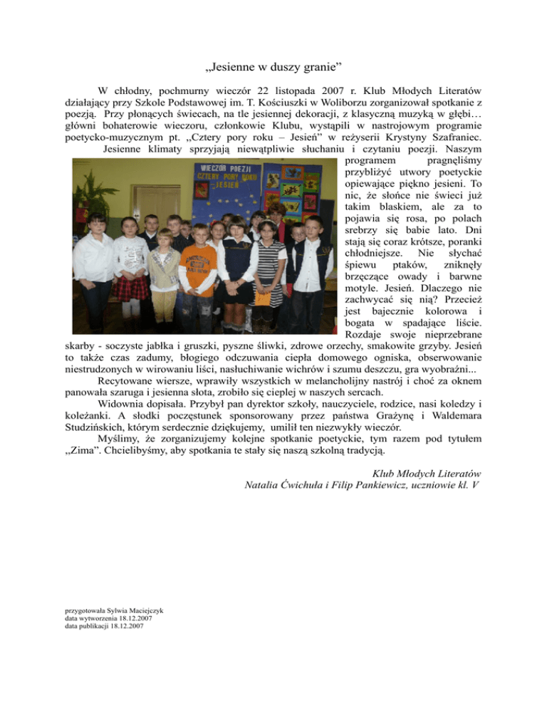 „Jesienne w duszy granie” W chłodny, pochmurny wieczór 22 listopada 2007 r. Klub Młodych Literatów działający przy Szkole Podstawowej im. T. Kościuszki w Woliborzu zorganizował spotkanie z poezją. Przy płonących świecach, na tle jesiennej dekoracji, z klasyczną muzyką w głębi… główni bohaterowie wieczoru, członkowie Klubu, wystąpili w nastrojowym programie poetycko-muzycznym pt. ,,Cztery pory roku – Jesień” w reżyserii Krystyny Szafraniec. Jesienne klimaty sprzyjają niewątpliwie słuchaniu i czytaniu poezji. Naszym programem pragnęliśmy przybliżyć utwory poetyckie opiewające piękno jesieni. To nic, że słońce nie świeci już takim blaskiem, ale za to pojawia się rosa, po polach srebrzy się babie lato. Dni stają się coraz krótsze, poranki chłodniejsze. Nie słychać śpiewu ptaków, zniknęły brzęczące owady i barwne motyle. Jesień. Dlaczego nie zachwycać się nią? Przecież jest bajecznie kolorowa i bogata w spadające liście. Rozdaje swoje nieprzebrane skarby - soczyste jabłka i gruszki, pyszne śliwki, zdrowe orzechy, smakowite grzyby. Jesień to także czas zadumy, błogiego odczuwania ciepła domowego ogniska, obserwowanie niestrudzonych w wirowaniu liści, nasłuchiwanie wichrów i szumu deszczu, gra wyobraźni... Recytowane wiersze, wprawiły wszystkich w melancholijny nastrój i choć za oknem panowała szaruga i jesienna słota, zrobiło się cieplej w naszych sercach. Widownia dopisała. Przybył pan dyrektor szkoły, nauczyciele, rodzice, nasi koledzy i koleżanki. A słodki poczęstunek sponsorowany przez państwa Grażynę i Waldemara Studzińskich, którym serdecznie dziękujemy, umilił ten niezwykły wieczór. Myślimy, że zorganizujemy kolejne spotkanie poetyckie, tym razem pod tytułem ,,Zima”. Chcielibyśmy, aby spotkania te stały się naszą szkolną tradycją. Klub Młodych Literatów Natalia Ćwichuła i Filip Pankiewicz, uczniowie kl. V przygotowała Sylwia Maciejczyk data wytworzenia 18.12.2007 data publikacji 18.12.2007