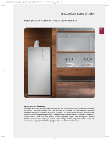 Prosp_EcoConBBK_E_pl.qxp:Prospekt_BBK_210x297 19-04-11 10:45 Page 1 EcoCondens Kompakt BBK Dobre połączenie: ochrona środowiska plus technika 03 Czysto, sprawnie, ekologicznie. Oszczędne wykorzystanie paliw kopalnianych odgrywa przy rozwoju naszych systemów grzewczych bardzo ważną rolę. Z tego powodu możecie być Państwo pewni, że urządzenie EcoCondens BBK tak jak to tylko możliwe jest przyjazne środowisku, o wysokiej sprawności, a przy tym oszczędza miejsce montażu. Dzięki kombinacji oszczędnego kotła gazowego i zintegrowanego podgrzewacza c.w.u. połączono optymalnie dopasowane do siebie urządzenia oferując Państwu wymierne korzyści. Teraz każdego dnia możecie Państwo rozkoszować się przyjaznym ciepłem i dzięki zintegrowanemu podgrzewaczowi ładującemu 95l równocześnie najwyższym komfortem przygotowania c.w.u. Szybko i niezawodnie. Prosp_EcoConBBK_E_pl.qxp:Prospekt_BBK_210x297 19-04-11 10:46 Page 2 Jakość produktu Urządzenia firmy BRÖTJE są kontrolowane zgodnie z surową normą zakładową i zgodnie z surowymi wymaganiami jakościowymi, znacznie wykraczającymi poza powszechnie obowiązujące normy. Już na etapie projektowania urządzeń stawia się na najwyższą jakość poszczególnych elementów składowych, którą się stale nadzoruje podczas ich powstawania i w procesie produkcyjnym, aż po kontrolę produktu finalnego. Gwarancja W okresie gwarancji, wynoszącym 5 lat od daty pierwszego uruchomienia, lecz nie później niż 6 miesięcy od daty zakupu urządzenia, firma BRÖTJE usunie w drodze bezpłatnej naprawy lub wymiany wadliwych elementów wszelkie usterki, które wystąpią w wyprodukowanych przez nią korpusach kotłów, podgrzewaczach c.w.u., grzejnikach, kolektorach słonecznych i wymiennikach ciepła wszystkich stojących i kondensacyjnych wiszących kotłów gazowych. Na wszystkie pozostałe wyprodukowane przez firmę BRÖTJE urządzenia i elementy wyposażenia dodatkowego firma BRÖTJE udziela gwarancji na okres dwóch lat od daty pierwszego uruchomienia, lecz nie później niż 6 miesięcy od daty zakupu urządzenia. Części wymieniane w ramach prac konserwacyjnych i części ulegające naturalnemu zużyciu objęte są 6 miesięcznym okresem gwarancyjnym. August Brötje GmbH · Postfach 13 54 · 26171 Rastede Telefon 04402 80-0 · Telefax 04402 80-583 · www.broetje.pl Dystrybutor –Hurtownia Instalacyjna Rejestr 5 – wersja 02.08 Jeżeli chodzi o rozwój innowacyjnej techniki grzewczej, to w głowach mamy tylko jedno: najlepsze rozwiązanie. Od ponad 90 lat stawiamy w naszych systemach na technikę zorientowaną w przyszłość, efektywne wykorzystanie wszystkich rodzajów energii oraz konsekwentne orientowanie się na indywidualne potrzeby klientów. I to z sukcesem. W ten sposób firma BRÖTJE wyrosła z biegiem lat na kompetentnego dostawcę systemów techniki grzewczej w zakresie gazowych i olejowych urządzeń kondensacyjnych, kotłów na pelety, pomp ciepła, kolektorów słonecznych i grzejników. Firma BRÖTJE jest członkiem grupy przedsiębiorstw BDR Thermea – jednej z grup wiodących na świecie producentów techniki grzewczej. Dzięki ścisłej współpracy w ramach grupy BDR Thermea w całej Europie firma BRÖTJE może także w przyszłości oferować innowacyjne rozwiązania w zakresie techniki grzewczej. Możliwość wprowadzania zmian technicznych i występowania błędów zastrzeżona. Dane wymiarowe nie są wiążące. EcoCondens Kompakt BBK/Z 08/12 Silna marka – mocny cel Prosp_EcoConBBK_E_pl.qxp:Prospekt_BBK_210x297 19-04-11 10:46 Page 3 EcoCondens Kompakt BBK Gazowa, kondensacyjna centrala cieplna Prosp_EcoConBBK_E_pl.qxp:Prospekt_BBK_210x297 19-04-11 10:47 Page 4 BRÖTJE Pewność jest naszą mocną stroną 02 Dlaczego? Ponieważ stawiamy na rozwój i indywidualne podejście do klienta. Do każdego rodzaju energii dysponujemy odpowiednimi rozwiązaniami w zakresie techniki grzewczej. W każdym naszym systemie grzewczym zawarty jest element rozwojowy ukierunkowany na przyszłość, na przykład w oszczędnych, gazowych i olejowych kotłach grzewczych firmy BRÖTJE, w inteligentnej technice pomp ciepła, przyjaznych dla środowiska urządzeniach grzewczych na pelety lub przyszłościowych systemach solarnych. Innowacyjne rozwiązania techniczne, które łączą zapewnienie indywidualnego komfortu cieplnego z odpowiednim traktowaniem środowiska naturalnego oprócz tego, że dają pewność komfortu użytkowa- nia są również perfekcyjnie dopasowane do Państwa domu, mieszkania i indywidualnego stylu życia oraz do potrzeb następnych pokoleń. Wszystko jedno, czy jest to olej, gaz, energie odnawialne lub energia słoneczna: dzięki naszemu, długoletniemu doświadczeniu potrafimy efektywnie wykorzystać poszczególne rodzaje energii, łącząc je z wysokorozwiniętą techniką firmy BRÖTJE. Tak powstają systemy grzewcze zorientowane na przyszłość, które zapewnią Państwu każdego dnia poczucie bezpieczeństwa i brak problemów oraz najwyższy poziom oszczędności energii i ekonomiczności. Odkryjcie Państwo wielość możliwości, które możecie zrealizować w partnerstwie z firmą BRÖTJE. Lepiej mieć pewność. Prosp_EcoConBBK_E_pl.qxp:Prospekt_BBK_210x297 19-04-11 10:48 Page 5 Kompetencja systemowa Duża wydajność na możliwie najmniejszej powierzchni Sprawna technika kondensacyjna Podczas gdy w zwykłych instalacjach energia ucieka poprzez komin, urządzenia kondensacyjne wykorzystują prawie całe ciepło zawarte w spalinach. To oznacza, że: powstające podczas spalania gazy spalinowe schładzają się, a zawarta w nich para wodna ulega kondensacji. W wyniku kondensacji odzyskiwana jest energia cieplna z pary wodnej, która następnie przekazywana jest do obiegu grzewczego. W ten sposób EcoCondens BBK osiąga normatywną sprawność rzędu 108%. Jednocześnie do minimum redukowany jest poziom emisji substancji szkodliwych w spalinach oraz uzyskuje się oszczędności kosztów