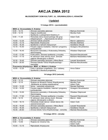 AKCJA ZIMA 2012 MŁODZIEŻOWY DOM KULTURY, UL. GRUNWALDZKA 5, KRAKÓW I tydzień 13 lutego 2012 r. (poniedziałek) MDK ul. Grunwaldzka 5, Kraków 9.00 – 12.15 Zimowe warsztaty gitarowe 9.00 – 12.15 Zajęcia świetlicowe. Spotkanie z policjantami Dzielnicy II 9.50 – 11.25 Warsztaty tańca towarzyskiego dla grup integracyjnych – „Zaproszenie do tańca” 10.00 – 12.25 Zimowa szkoła piosenki 10.00 – 13.15 Rękodzieło Artystyczne 15.00 – 16.35 Spotkania z tańcem klasycznym 13.15 – 15.40 Feryjne zajęcia medialne. Internet i programy komputerowe 13.30 – 16.45 Muzyczne warsztaty z Krakowską Orkiestrą Staromiejską 13.45 – 17.00 Forte piano. Zimowe spotkania z muzyką 14.00 – 17.15 W zdrowym ciele zdrowy duch. Zimowe zajęcia rekreacyjne w siłowni 16.30 – 19.45 Zimowe warsztaty jazzowe z Aferą Band 16.45 – 20.00 Zimowa Szkoła Tańca Współczesnego warsztaty Pracownia Artystyczna MDK, ul. Widok 4, Kraków 10.00 – 12.25 Ferie z językiem angielskim. Gry i zabawy. Spotkania z literaturą angielską. Mariusz Kominiak Monika Ćwik Adam Ćwik Marcin Jajkiewicz Renata Zielińska Swietłana Olszak Grzegorz Struzikiewicz Wiesław Olejniczak Ryszard Kleczkowski Barbara Niedzielska-Adler Leszek Nowotarski Mariola Kleczkowska Anna Gabor 14 lutego 2012 (wtorek) MDK ul. Grunwaldzka 5, Kraków 9.00 – 12.15 Zimowe warsztaty gitarowe 9.00 – 12.15 Wyjście do Muzeum Sztuki Współczesnej „Spotkanie ze sztuką współczesną” 10.00 – 12.25 Ikona – warsztaty artystyczne 12.30 – 14.55 Feryjne zajęcia medialne. Internet i programy komputerowe 13.30 – 15.55 Muzyczne warsztaty z Krakowską Orkiestrą Staromiejską 13.45 – 17.00 Forte piano. Zimowe spotkania z muzyką 9.00 – 12.15 W zdrowym ciele zdrowy duch. Zimowe zajęcia rekreacyjne w siłowni 15.00 – 18.15 Warsztaty break-dance i street dance dla zaawansowanych 16.30 – 19.45 Zimowe warsztaty jazzowe z Aferą Band 15.00 – 16.35 Spotkania z tańcem klasycznym Zimowa Szkoła Tańca Współczesnego - warsztaty 16.45 – 20.00 Mariusz Kominiak Monika Ćwik Adam Ćwik Renata Zielińska Grzegorz Struzikiewicz Wiesław Olejniczak Ryszard Kleczkowski Marcin Adler Adam Ćwik Leszek Nowotarski Swietłana Olszak Mariola Kleczkowska 15 lutego 2012 r. (środa) MDK ul. Grunwaldzka 5, Kraków 9.00 – 12.15 Zimowe warsztaty gitarowe 9.50 – 13.05 Wyjście do Cinema City 10.00 – 13.15 Rękodzieło Artystyczne Mariusz Kominiak Monika Ćwik Adam Ćwik Renata Zielińska 10.00 – 12.25 15.00 – 16.35 13.15 – 15.40 Zimowa szkoła piosenki Spotkania z tańcem klasycznym Feryjne zajęcia medialne. Internet i programy komputerowe 13.30 – 16.45 Muzyczne warsztaty z Krakowską Orkiestrą Staromiejską 13.45 – 17.00 Forte piano. Zimowe spotkania z muzyką 13.15 – 17.20 W zdrowym ciele zdrowy duch. Zimowe zajęcia rekreacyjne w siłowni 16.30 – 19.45 Zimowe warsztaty jazzowe z Aferą Band 16.45 – 20.00 Zimowa Szkoła Tańca Współczesnego warsztaty Pracownia Artystyczna MDK, ul. Widok 4, Kraków 10.00 – 12.25 Ferie z językiem angielskim. Gry i zabawy. Spotkania z literaturą angielską. Marcin Jajkiewicz Swietłana Olszak Grzegorz Struzikiewicz Wiesław Olejniczak Ryszard Kleczkowski Barbara Niedzielska-Adler Leszek Nowotarski Mariola Kleczkowska Anna Gabor 16 lutego 2012 r. (czwartek) MDK ul. Grunwaldzka 5, Kraków 9.00 – 11.25 Zimowe warsztaty gitarowe 9.00 – 12.15 Zajęcia świetlicowe – bal karnawałowy „Zimowy bal” 9.50 – 11.25 Warsztaty tańca towarzyskiego dla grupy integracyjnej 10.00 – 12.25 Ikona – warsztaty artystyczne 13.30 – 15.55 Muzyczne warsztaty z Krakowską Orkiestrą Staromiejską 13.45 – 17.00 Forte piano. Zimowe spotkania z muzyką 9.00 -13.05 W zdrowym ciele zdrowy duch. Zimowe zajęcia rekreacyjne w siłowni 16.30 – 18.55 Zimowe warsztaty jazzowe z Aferą Band 16.45 – 20.00 Zimowa Szkoła Tańca Współczesnego warsztaty Mariusz Kominiak Monika Ćwik Adam Ćwik Renata Zielińska Wiesław Olejniczak Ryszard Kleczkowski Marcin Adler Leszek Nowotarski Mariola Kleczkowska 17 lutego 2012 r. (piątek) MDK ul. Grunwaldzka 5, Kraków 9.00 – 11.25 Zimowe warsztaty gitarowe 9.50 – 11.25 Turniej tańca Karaoke 10.00 – 13.15 Rękodzieło Artystyczne 10.00 – 12.25 Zimowa szkoła piosenki 10.40 – 12.15 Festiwal Piosenki Zimowej 12.15 – 16.25 Zajęcia świetlicowe. Teatr, gry i zabawy. 13.30 – 15.55 Muzyczne warsztaty z Krakowską Orkiestrą Staromiejską 14.35 – 17.00 Zimowe warsztaty jazzowe z Aferą Band 15.00 – 16.35 Zimowa Szkoła Tańca Współczesnego warsztaty 15.00 – 16.35 Forte piano. Zimowe spotkania z muzyką 16.45 – 20.00 Spotkania z tańcem klasycznym Pracownia Artystyczna MDK, ul. Widok 4, Kraków 10.00 – 12.25 Ferie z językiem angielskim. Gry i zabawy. Spotkania z literaturą angielską. Mariusz Kominiak Adam Ćwik Renata Zielińska Marcin Jajkiewicz Monika Ćwik Agata Rusin Wiesław Olejniczak Leszek Nowotarski Mariola Kleczkowska Ryszard Kleczkowski Swietłana Olszak Anna Gabor AKCJA ZIMA 2012 MŁODZIEŻOWY DOM KULTURY, UL. GRUNWALDZKA 5, KRAKÓW II tydzień 20 lutego 2012 r. (poniedziałek) MDK ul. Grunwaldzka 5, Kraków 9.00 – 13.05 Zajęcia świetlicowe 10.00 – 13.15 Rękodzieło Artystyczne 10.00 – 12.25 Zimowa szkoła piosenki 12.15 – 15.30 Melodie popularne – warsztaty muzyczne na keyboardach 13.30 – 16.45 Muzyczne warsztaty z Krakowską Orkiestrą Staromiejską 13.45 – 17.00 Forte piano. Zimowe spotkania z muzyką 14.30 – 16.55 Feryjne zajęcia medialne. Internet i programy komputerowe 14.00 – 17.15 W zdrowym ciele zdrowy duch. Zimowe zajęcia rekreacyjne w siłowni 16.45 – 20.00 Zimowa Szkoła Tańca Współczesnego warsztaty Pracownia Artystyczna MDK, ul. Widok 4, Kraków 10.00 – 13.15 Ferie w Pracowni Artystycznej: - ceramika, - plastyka, - Klub Gier Planszowych Agata Rusin Renata Zielińska Marcin Jajkiewicz Halina Pianowska Wiesław Olejniczak Ryszard Kleczkowski Grzegorz Struzikiewicz Barbara Niedzi