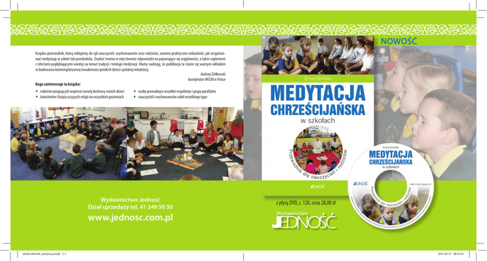 NOWOŚĆ Książka-przewodnik, którą oddajemy do rąk nauczycieli, wychowawców oraz rodziców, zawiera praktyczne wskazówki, jak zorganizować medytację w szkole lub przedszkolu. Znaleźć można w niej również odpowiedzi na pojawiające się wątpliwości, a także suplement z tekstami pogłębiającymi wiedzę na temat tradycji i teologii medytacji. Mamy nadzieję, że publikacja ta stanie się ważnym wkładem w budowaniu kontemplatywnej świadomości polskich dzieci i polskiej młodzieży. Andrzej Ziółkowski koordynator WCCM w Polsce Kogo zainteresuje ta książka: rodziców pragnących wspierać rozwój duchowy swoich dzieci katechetów i księży uczących religii na wszystkich poziomach osoby prowadzące wszelkie wspólnoty i grupy parafialne nauczycieli i wychowawców szkół wszelkiego typu Wydawnictwo Jedność Dział sprzedaży tel. 41 349 50 50 z płytą DVD, s. 120, cena 28,00 zł www.jednosc.com.pl ulotka160x160_medytacja.indd 2-3 2012-09-27 08:53:44 Medytacja chrześcijańska w twojej szkole Doświadczenie i obietnica dwudniowa konferencja i warsztaty 31.01.2013 – 01.02.2013 Collegium Bobolanum, Warszawa Konferencja i warsztaty „Medytacja chrześcijańska w twojej szkole” podejmą jedno z najważniejszych zadań stojących przedwspółczesnymi rodzicami i wychowawcami: Jak zapewnić zdrowy i pełny rozwój następującemu po nas pokoleniu? Badania naukowe i doświadczenie wielu tradycji duchowych udowadniają, że dzieci posiadają naturalną skłonność do medytacji. Sprawia im ona przyjemność i przynosi bardzo dobre owoce. Czy nasze systemy edukacyjne doceniają wagę tego faktu? Jak możemy udostępnić dzieciom tę uniwersalną praktykę duchową i w ten sposób pomóc im w lepszym radzeniu sobie z wyzwaniami, jakie przed nimi stoją? Wykorzystując bogate doświadczenie nauczania medytacji chrześcijańskiej w wielu krajach, Światowa Wspólnota Medytacji Chrześcijańskiej (The World Community for Christian Meditation) zaprasza nauczycieli, katechetów i dyrektorów wszelkich szkół na dwudniową konferencję i warsztaty. Podczas zajęć udzielimy praktycznych wskazówek, jak rozpocząć nauczanie medytacji. Cathy Day i Ernie Christie zdobyli międzynarodowe uznanie w swej pionierskiej pracy nauczania medytacji w katolickich szkołach Australii, Indonezji, na Filipinach, w Singapurze i w Wielkiej Brytanii. Opowiedzą o swych doświadczeniach i poprowadzą zajęcia praktyczne. Bogdan Białek przybliży nam psychologiczne aspekty medytacji i jej wpływ na proces zdrowienia. Ojciec Laurence Freeman OSB zapozna nas z tradycją medytacji chrześcijańskiej i wprowadzi uczestników w jej praktykę stosowną dla naszego pluralistycznego świata. ulotka160x160_medytacja.indd 4-5 Seminarium skupi się w szczególności na następujących zagadnieniach: Medytacja chrześcijańska jako forma modlitwy bez względu na wiek, płeć i wykształcenie. Medytacja chrześcijańska tworzy równowagę psychiczną i duchową dziecka i w ten sposób wspiera jego pełen rozwój. Dlaczego jest sprawą ważną uczyć dzieci i młodzież medytacji chrześcijańskiej? Co mówią dzieci, rodzice i nauczyciele szkół, w których dzieci objęte są programem nauczania medytacji chrześcijańskiej? J ak mogę w mojej szkole uczyć medytować dzieci, odkryć obecny w nich potencjał i przekazać tę naukę dalej? Prowadzenie: Dr Cathy Day Dyrektorka Biura Edukacji Katolickiej Diecezji Townsville w Australii. Pod jej kierownictwem stworzono i wdrożono pierwszy na świecie program Medytacji Chrześcijańskiej dla wszystkich szkół katolickich w całej diecezji. Jej zainteresowania skupiają się na badaniach ułatwiających budowanie zdrowych zasad edukacyjnych z uwzględnieniem rozwoju duchowości w miejscu pracy. Ernie Christie Wicedyrektor Biura Edukacji Katolickiej Diecezji Townsville w Australii. Koordynuje program Medytacji Chrześcijańskiej w regionie North Queensland. Skupia się na pracy z uczniami od wieku przedszkolnego do 12 roku życia. Ma pod swoją opieką 31 szkół, 15000 uczniów i 1200 nauczycieli. Ukończył studia teologiczne oraz pedagogiczne. Jest autorem książki „Medytacja chrześcijańska w szkołach” (ang. Teaching Christian Meditation to Children: Coming Home) O. Laurence Freeman OSB Zakonnik Oliwetańskiej Kongregacji Benedyktyńskiej. Nowicjat odbył pod kierunkiem ojca Johna Maina OSB. Wraz z nim w 1977 roku założył klasztor w Montrealu, który zainspirował jeden z nurtów odnowy kontemplacyjnej w Kościele. Kieruje Światową Wspólnotą Medytacji Chrześcijańskiej (The World Community for Christian Meditation – WCCM). Bogdan Białek Psycholog, dziennikarz, wydawca. Redaktor naczelny miesięcznika „Charaktery”, kwartalnika „Psychologia w szkole” oraz pisma poświęconego duchowości i psychologii „Medytacja”. Wiceprzewodniczący Polskiej Rady Chrześcijan i Żydów. Zapisy i dalsze informacje: Charaktery • Psychologia w Szkole www.charaktery.eu/psychologia_w_szkole Światowa Wspólnota Medytacji Chrześcijańskiej (WCCM) w Polsce www.wccm.pl Organizatorzy: Patronat: Program: 31.01.2013 08.30 – 09.00 Rejestracja uczestników 09.00 – 09.10Powitanie: Andrzej Ziółkowski, koordynator WCCM w Polsce 09.10 – 09.30 Słowo wstępne: o. Andrzej Majewski, rektor Collegium Bobolanum 09.30 – 10.15Medytacja chrześcijańska: tradycja i praktyka - o. Laurence Freeman OSB 10.15 – 10.45 Wykład 1 - dr Cathy Day, Ernie Christie 10.45 – 11.15 Przerwa kawowa 11.15 – 12.00 Wykład 2 - dr Cathy Day, Ernie Christie 12.00 – 12.30Medytacja - o. Laurence Freeman OSB 12.30 – 13.30 Przerwa na obiad 13.30 – 14.30Medytacja a zdrowie psychiczne Bogdan Białek 14.30 – 15.30 Wykład 3 - dr Cathy Day, Ernie Christie 15.30 – 16.00Reportaż filmowy „Medytacja chrześcijańska z dziećmi” 16.00 – 16.30 Przerwa kawowa 16.30 – 17.30 Pytania i odpowiedzi 17.30 Zakończenie Organizatorzy zastrzegają sobie prawo zmian w programie