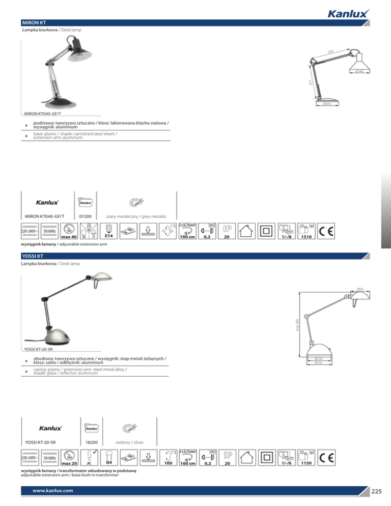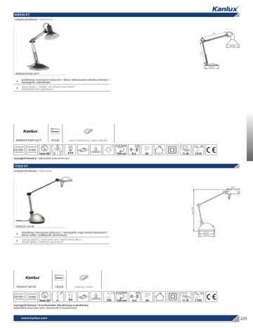MIRON KT Lampka biurkowa / Desk lamp 29 0 275 Ø140 Ø205 MIRON KT040-GF/T podstawa: tworzywo sztuczne / klosz: lakierowana blacha stalowa / wysięgnik: aluminium base: plastic / shade: varnished steel sheet / extension arm: aluminum MIRON KT040-GF/T 07200 szary metaliczny / grey metallic 2 x 0,75mm2 220-240V~ 50/60Hz max 40 190 cm 0,2 20 1/-/8 1510 wysięgnik łamany / adjustable extension arm YOSSI KT Lampka biurkowa / Desk lamp max 500 Ø93 YOSSI KT-20-SR obudowa: tworzywo sztuczne / wysięgnik: stop metali żelaznych / klosz: szkło / odbłyśnik: aluminium Ø120 Ø135 casing: plastic / extension arm: steel metal alloy / shade: glass / reflector: aluminum YOSSI KT-20-SR 18200 srebrny / silver 2 x 0,75mm2 220-240V~ 50/60Hz max 20 100 160 cm 0,2 20 1/-/6 1150 wysięgnik łamany / transformator wbudowany w podstawę adjustable extension arm / base built-in transformer www.kanlux.com 225