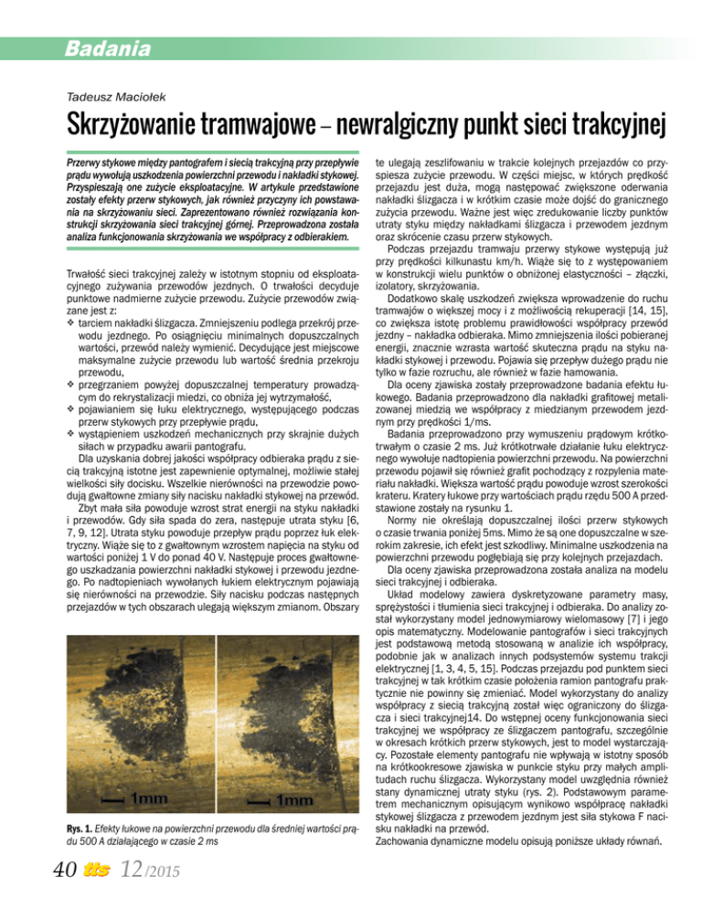 Badania Tadeusz Maciołek Skrzyżowanie tramwajowe – newralgiczny punkt sieci trakcyjnej Przerwy stykowe między pantografem i siecią trakcyjną przy przepływie prądu wywołują uszkodzenia powierzchni przewodu i nakładki stykowej. Przyspieszają one zużycie eksploatacyjne. W artykule przedstawione zostały efekty przerw stykowych, jak również przyczyny ich powstawania na skrzyżowaniu sieci. Zaprezentowano również rozwiązania konstrukcji skrzyżowania sieci trakcyjnej górnej. Przeprowadzona została analiza funkcjonowania skrzyżowania we współpracy z odbierakiem. Trwałość sieci trakcyjnej zależy w istotnym stopniu od eksploatacyjnego zużywania przewodów jezdnych. O trwałości decyduje punktowe nadmierne zużycie przewodu. Zużycie przewodów związane jest z: tarciem nakładki ślizgacza. Zmniejszeniu podlega przekrój przewodu jezdnego. Po osiągnięciu minimalnych dopuszczalnych wartości, przewód należy wymienić. Decydujące jest miejscowe maksymalne zużycie przewodu lub wartość średnia przekroju przewodu, przegrzaniem powyżej dopuszczalnej temperatury prowadzącym do rekrystalizacji miedzi, co obniża jej wytrzymałość, pojawianiem się łuku elektrycznego, występującego podczas przerw stykowych przy przepływie prądu, wystąpieniem uszkodzeń mechanicznych przy skrajnie dużych siłach w przypadku awarii pantografu. Dla uzyskania dobrej jakości współpracy odbieraka prądu z siecią trakcyjną istotne jest zapewnienie optymalnej, możliwie stałej wielkości siły docisku. Wszelkie nierówności na przewodzie powodują gwałtowne zmiany siły nacisku nakładki stykowej na przewód. Zbyt mała siła powoduje wzrost strat energii na styku nakładki i przewodów. Gdy siła spada do zera, następuje utrata styku [6, 7, 9, 12]. Utrata styku powoduje przepływ prądu poprzez łuk elektryczny. Wiąże się to z gwałtownym wzrostem napięcia na styku od wartości poniżej 1 V do ponad 40 V. Następuje proces gwałtownego uszkadzania powierzchni nakładki stykowej i przewodu jezdnego. Po nadtopieniach wywołanych łukiem elektrycznym pojawiają się nierówności na przewodzie. Siły nacisku podczas następnych przejazdów w tych obszarach ulegają większym zmianom. Obszary Rys. 1. Efekty łukowe na powierzchni przewodu dla średniej wartości prądu 500 A działającego w czasie 2 ms 40 12 /2015 te ulegają zeszlifowaniu w trakcie kolejnych przejazdów co przyspiesza zużycie przewodu. W części miejsc, w których prędkość przejazdu jest duża, mogą następować zwiększone oderwania nakładki ślizgacza i w krótkim czasie może dojść do granicznego zużycia przewodu. Ważne jest więc zredukowanie liczby punktów utraty styku między nakładkami ślizgacza i przewodem jezdnym oraz skrócenie czasu przerw stykowych. Podczas przejazdu tramwaju przerwy stykowe występują już przy prędkości kilkunastu km/h. Wiąże się to z występowaniem w konstrukcji wielu punktów o obniżonej elastyczności – złączki, izolatory, skrzyżowania. Dodatkowo skalę uszkodzeń zwiększa wprowadzenie do ruchu tramwajów o większej mocy i z możliwością rekuperacji [14, 15], co zwiększa istotę problemu prawidłowości współpracy przewód jezdny – nakładka odbieraka. Mimo zmniejszenia ilości pobieranej energii, znacznie wzrasta wartość skuteczna prądu na styku nakładki stykowej i przewodu. Pojawia się przepływ dużego prądu nie tylko w fazie rozruchu, ale również w fazie hamowania. Dla oceny zjawiska zostały przeprowadzone badania efektu łukowego. Badania przeprowadzono dla nakładki grafitowej metalizowanej miedzią we współpracy z miedzianym przewodem jezdnym przy prędkości 1/ms. Badania przeprowadzono przy wymuszeniu prądowym krótkotrwałym o czasie 2 ms. Już krótkotrwałe działanie łuku elektrycznego wywołuje nadtopienia powierzchni przewodu. Na powierzchni przewodu pojawił się również grafit pochodzący z rozpylenia materiału nakładki. Większa wartość prądu powoduje wzrost szerokości krateru. Kratery łukowe przy wartościach prądu rzędu 500 A przedstawione zostały na rysunku 1. Normy nie określają dopuszczalnej ilości przerw stykowych o czasie trwania poniżej 5ms. Mimo że są one dopuszczalne w szerokim zakresie, ich efekt jest szkodliwy. Minimalne uszkodzenia na powierzchni przewodu pogłębiają się przy kolejnych przejazdach. Dla oceny zjawiska przeprowadzona została analiza na modelu sieci trakcyjnej i odbieraka. Układ modelowy zawiera dyskretyzowane parametry masy, sprężystości i tłumienia sieci trakcyjnej i odbieraka. Do analizy został wykorzystany model jednowymiarowy wielomasowy [7] i jego opis matematyczny. Modelowanie pantografów i sieci trakcyjnych jest podstawową metodą stosowaną w analizie ich współpracy, podobnie jak w analizach innych podsystemów systemu trakcji elektrycznej [1, 3, 4, 5, 15]. Podczas przejazdu pod punktem sieci trakcyjnej w tak krótkim czasie położenia ramion pantografu praktycznie nie powinny się zmieniać. Model wykorzystany do analizy współpracy z siecią trakcyjną został więc ograniczony do ślizgacza i sieci trakcyjnej14. Do wstępnej oceny funkcjonowania sieci trakcyjnej we współpracy ze ślizgaczem pantografu, szczególnie w okresach krótkich przerw stykowych, jest to model wystarczający. Pozostałe elementy pantografu nie wpływają w istotny sposób na krótkookresowe zjawiska w punkcie styku przy małych amplitudach ruchu ślizgacza. Wykorzystany model uwzględnia również stany dynamicznej utraty styku (rys. 2). Podstawowym parametrem mechanicznym opisującym wynikowo współpracę nakładki stykowej ślizgacza z przewodem jezdnym jest siła stykowa F nacisku nakładki na przewód. Zachowania dynamiczne modelu opisują poniższe układy równań. Badania + C (Y − Y ) + C (Y − Y ) + MsY s n s n s s p + K n (Ys − Yn ) + K s (Ys − Yp ) + M s g = 0 (1) gdzie: g – przyspieszenie ziemskie, Ms – masa ślizgacza, Ks – sztywn