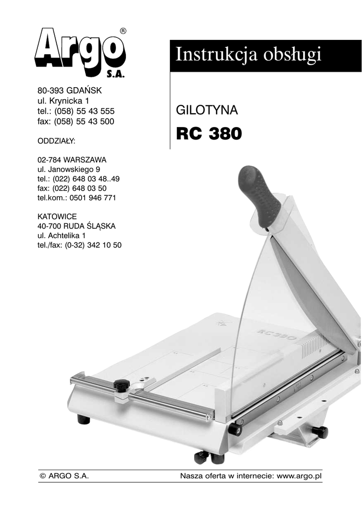 Instrukcja obsługi 80-393 GDAŃSK ul. Krynicka 1 tel.: (058) 55 43 555 fax: (058) 55 43 500 ODDZIAŁY: GILOTYNA RC 380 02-784 WARSZAWA ul. Janowskiego 9 tel.: (022) 648 03 48..49 fax: (022) 648 03 50 tel.kom.: 0501 946 771 KATOWICE 40-700 RUDA ŚLĄSKA ul. Achtelika 1 tel./fax: (0-32) 342 10 50 © ARGO S.A. Nasza oferta w internecie: www.argo.pl © ARGO S.A. Nasza oferta w internecie: www.argo.pl MONTAŻ 1. Odkręcić dwie śrubki (4) na obudowie (2) oraz zerwać plastik (papier) zabezpiecza -jący z osłony plexiglasowej (1). Osłonę umieścić pomiędzy obudową (2) i rączką gilotyny (3), a następnie przykręcić ją dwoma śrubkami (4) do obudowy. Należy unikać zbyt mocnego przykręcania śrubek; w przeciwnym wypadku może dojść do uszkodzenia osłony plexiglasowej. 2. Wkręcić śrubę w otwór położony wyżej na rączce, przykręcając ją jednocześnie okrągłą dużą metalową podkładką, tak aby osłona z plexi znalazła się pomiędzy podkładką, a rączką gilotyny* (rys.A). W przypadku nie zachowania tego warunku gilotyna nie będzie cięła albo będzie cięła żle. UWAGA! Przed użyciem gilotyny, należy założyć osłonę z plexi. Osłony tej nie wolno zdejmować! Jeżeli gilotyna nie jest używana, jej ostrze powinno znajdować się na dole,tj. w pozycji poziomej. OBSŁUGA Ustawić gilotynę poziomo na czterech gumowych nóżkach. Podnieść ostrze do góry do oporu, tak aby równocześnie maksymalnie uniósł się automatyczny docisk papieru. Umieścić papier w gilotynie, układając go wzdłuż poziomej prowadnicy (5), i jeżeli to konieczne - przy użyciu ruchomej pionowej prowadnicy (6) dopasować do żądanego wymiaru. Łatwiejsze przesuwanie ruchomej prowadnicy wskazuje rys B. Ujednolicone formaty papieru narysowane są na blacie. Docisk papieru następuje automatycznie z chwilą upuszczania ostrza gilotyny i działa przez cały czas wykonywania cięcia. UŻYTKOWANIE 1. W przypadku cięcia jednorazowo ilości kartek zbliżonych do ilości maksymalnych zaleca się cięcie również małych ilości kartek, co pozwoli na samoostrzenie się noża poprzez kontakt ostrza z przeciwostrzem. 2. We wszystkich gilotynach z nożem łukowatym występuje zasada, że im większa ilość kartek ciętych jednorazowo, tym jakość cięcia jest mniejsza. 3. Istnieje możliwość indywidualnego ustawienia dokładności kąta prostego pomiędzy ostrzem, a listwą prowadzącą (z podziałką centymetrową), w tym celu należy poluzować 2 śruby mocujące tę listewkę, ustawić kąt i dokręcić śruby. KONSERWACJA Gilotynę można czyścić suchą szmatką i pokrywać woskiem samochodowym. Nie używaj w żadnym wypadku rozpuszczalników i wody. Od czasu do czasu posmaruj ostrze olejem silikonowym lub płynną wazeliną, używając szmatki. To zapewni gładką pracę noży i ochroni stal przed rdzewieniem. © ARGO S.A. Nasza oferta w internecie: www.argo.pl DANE TECHNICZNE Gilotyna RC 380 SP Długość cięcia ...................................... Wymiary blatu ....................................... Wymiary ................................................ Tnie maksymalnie do ............................ Docisk ręczny. 380 mm. 330x420 mm. 530x410x440. 30 arkuszy 70g/m2. Gilotyna RC 380 SE Długość cięcia ...................................... Wymiary blatu ....................................... Wymiary ................................................ Tnie maksymalnie do ............................ Docisk ręczny. 380 mm. 430x420 mm. 530x410x440. 40 arkuszy 70g/m2. Gilotyna RC 380 SC Długość cięcia ...................................... Wymiary blatu ....................................... Wymiary ................................................ Tnie maksymalnie do ............................ Docisk automatyczny. 380 mm. 430x420 mm. 530x410x440. 40 arkuszy 70g/m2. Gilotyna RC 380 C Długość cięcia ...................................... Wymiary blatu ....................................... Wymiary ................................................ Tnie maksymalnie do ............................ Docisk automatyczny. Podpórka do papieru. © ARGO S.A. 380 mm. 430x420 mm. 530x410x440. 50 arkuszy 70g/m2. Nasza oferta w internecie: www.argo.pl