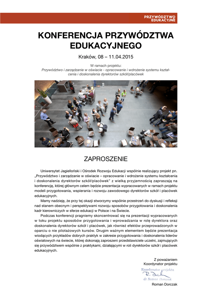 KONFERENCJA PRZYWÓDZTWA EDUKACYJNEGO Kraków, 08 – 11.04.2015 W ramach projektu: Przywództwo i zarządzanie w oświacie - opracowanie i wdrożenie systemu kształcenia i doskonalenia dyrektorów szkół/placówek ZAPROSZENIE Uniwersytet Jagielloński i Ośrodek Rozwoju Edukacji wspólnie realizujący projekt pn. „Przywództwo i zarządzanie w oświacie – opracowanie i wdrożenie systemu kształcenia i doskonalenia dyrektorów szkół/placówek” z wielką przyjemnością zapraszają na konferencję, której głównym celem będzie prezentacja wypracowanych w ramach projektu modeli przygotowania, wspierania i rozwoju zawodowego dyrektorów szkół i placówek edukacyjnych. Mamy nadzieję, że przy tej okazji stworzymy wspólnie przestrzeń do dyskusji i refleksji nad stanem obecnym i perspektywami rozwoju sposobów przygotowania i doskonalenia kadr kierowniczych w sferze edukacji w Polsce i na Świecie. Podczas konferencji pragniemy skoncentrować się na prezentacji wypracowanych w toku projektu sposobów przygotowania i wprowadzania w rolę dyrektora oraz doskonalenia dyrektorów szkół i placówek, jak również efektów przeprowadzonych w oparciu o nie pilotażowych kursów. Drugim ważnym elementem będzie prezentacja wiodących przykładów dobrych praktyk w zakresie przygotowania i doskonalenia liderów oświatowych na świecie, której dokonają zaproszeni przedstawiciele uczelni, zajmujących się przywództwem wspólnie z praktykami, działającymi w roli dyrektorów szkół i placówek edukacyjnych. Z poważaniem Koordynator projektu Roman Dorczak Idea konferencji Chcemy zapewnić czas i przestrzeń na rozmowy o miejscu przywództwa edukacyjnego w szkole, polskim systemie oświatowym, a także lokalnym i globalnym kontekście, określającym kształt procesów uczenia się i rozwoju. Zapraszamy do uczestnictwa wszystkich, którzy uważają, że to ważne sprawy i czują się za nie odpowiedzialni Znaczenie przywództwa w edukacji Przywództwo jest kluczowym czynnikiem, określającym rozwój szkół i systemów edukacyjnych oraz poprawę jakości procesów uczenia się. Sprostanie temu wyzwaniu stojącemu przed przywództwem edukacyjnym wymaga po pierwsze dobrego określenia sposobu rozumienia przywództwa, adekwatnego do potrzeb edukacji, opartego o wartości ważne dla tej sfery. Drugim ważnym elementem jest określenie zbioru różnorodnych kompetencji kluczowych dla współczesnego przywództwa edukacyjnego. Trzecim wreszcie warunkiem wzrostu znaczenia przywództwa w edukacji jest znalezienie nowych, bardziej odpowiadających wymogom współczesności form kształcenia i doskonalenia kompetencji przywódczych przyszłych i funkcjonujących już w praktyce kadr przywódczych oświaty. Istniejące w Polsce sposoby kształcenia kadr kierowniczych w edukacji wymagają refleksji i zmiany, umożliwiającej kształcenie liderów oświaty bardziej zdolnych do stawienia czoła wyzwaniom stojącym przed szkołami i placówkami edukacyjnymi. Dyskutując podczas kongresu o naszych osiągnięciach i koniecznych w najbliższej przyszłości zmianach w systemie przygotowania i kształcenia kadr przywódczych w edukacji będziemy wspólnie budować zbiór pomysłów, inspiracji i przykładów dobrych praktyk z założeniem, że poprowadzi nas to do rozwoju przywództwa edukacyjnego w Polsce. Zasady uczestnictwa w kongresie W kongresie uczestniczyć będzie około 300 gości - przedstawicieli instytucji kształcących i doskonalących dyrektorów szkół/placówek w Polsce, eksperci krajowi i zagraniczni. Kongres odbędzie się w Krakowie. Udział w kongresie jest bezpłatny natomiast, jako organizatorzy, oczekujemy, że zgłaszać się będą osoby, które w sposób aktywny uczestniczyć będą w wszystkich sesjach (wykładach i warsztatach), będą pokazywać własne działania i aktywności, a po kongresie będą popularyzować dyskutowane zagadnienia i dzielić się zdobytymi doświadczeniami w swoim środowisku. Warunki uczestnictwa w konferencji a) wypełnienie formularza zgłoszenia na konferencję. Formularz można wypełnić od 20 stycznia 2015r. do 28 lutego 2015r . Formularz składa się z dwóch części. W pierwszej prosimy o uzupełnienie danych teleadresowych, a w drugiej o opis, w jaki sposób wykorzystają Państwo wiedzę zdobytą na kongresie we własnej praktyce (w zakresie kształcenia kandydatów oraz początkujących i doświadczonych szkół/placówek). FORMULARZ Po zakwalifikowaniu się do grona uczestników, wymaga się od Państwa: b) udziału we wszystkich zajęciach od początku do końca konferencji, c) złożenia deklaracji podjęcia działań popularyzujących treści i zagadnienia poruszane na konferencji, a pół roku po konferencji przekazanie informacji o działaniach podjętych w wyniku uczestniczenia w konferencji oraz przesłanie sprawozdania po realizacji tych działań. Zachęcamy do odwiedzania naszej strony internetowej, na której będą pojawiały się informacje na temat konferencji. ODWIEDŹ Projekt współfinansowany przez Unię Europejską w ramach Europejskiego Funduszu Społecznego.