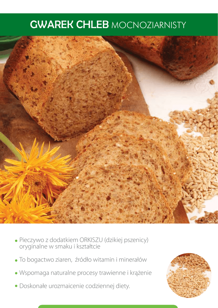 GWAREK CHLEB mocnoziarnisty Pieczywo z dodatkiem ORKISZU (dzikiej pszenicy) oryginalne w smaku i kształtcie To bogactwo ziaren, źródło witamin i minerałów Wspomaga naturalne procesy trawienne i krążenie Doskonałe urozmaicenie codziennej diety. GWAREK CHLEB mocnoziarnisty 50% mieszanka maczna Opis produktu: Mieszanka GWAREK zawiera dodatek ORKISZU jak i całe mnóstwo ziaren. Dzięki tak dużej zawartości ziaren (60%) pieczywo posiada wiele walorów zdrowotnych i odżywczych. Jego oryginalny kształt przyciągnie uwagę każdego klienta, a zapach i smak da pewność, że klient będzie w pełni usatysfakcjonowany. Receptura podstawowa: Chleb (kg) Składnik Mieszanka GWAREK Mąka pszenna Mąka żytnia Drożdże Woda RAZEM Bagietki (kg) Cena/kg ,, Wartosc 5 kg / 5 kg 3 kg / 5 kg 2 kg / 0,4 kg / 0,5 kg 6,5 kg / 6 kg 16,9 kg / 16,5 kg Cena 1 kg 1 szt. Sposób przygotowania: Mieszankę zalać letnią wodą (ok. 30ºC) i moczyć przez godzinę. Potem dodać wszystkie pozostałe składniki, wymieszać. Pozostawić na ok. 20 minut. Następnie ciasto przerobić. Podzielić na kęsy. Uformować, obtoczyć w ziarnach wg uznania. Pozostawić do końcowej fermentacji w zależności od wielkości naważki i warunków panujących w zakładzie. Następnie wypiekać. Parametry procesu Chleb (kg) Mieszanie wolne / szybkie Fermentacja wstępna / końcowa Wypiek (naważka chleba 0,35kg naważka bagietek 0,25 kg) Bagietki (kg) 3 - 4 minut 20 – 40 minut 30 / 20 minut 26-28 °C 35-40 °C 230-190/230 °C . Wazne: W workach mieszanki mącznej GWAREK znajdują się etykiety na chlebki, a na życzenie klienta dostępne są plakaty, stojaki i ulotki informacyjne. Eco Trade Sp. z o.o. 44-100 Gliwice, ul. Okrężna 8 tel. (32) 231 20 87-88 faks (32) 231 20 88 wew. 102 [email protected], www.ecotrade.pl