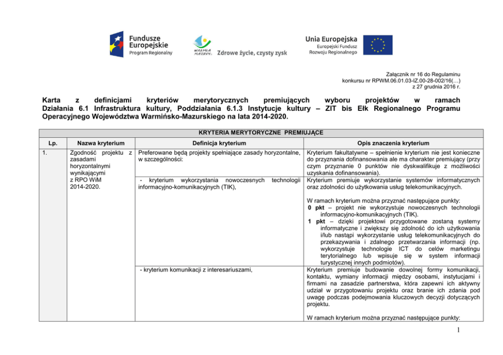Załącznik nr 16 do Regulaminu konkursu nr RPWM.06.01.03-IZ.00-28-002/16(…) z 27 grudnia 2016 r. Karta z definicjami kryteriów merytorycznych premiujących wyboru projektów w ramach Działania 6.1 Infrastruktura kultury, Poddziałania 6.1.3 Instytucje kultury – ZIT bis Ełk Regionalnego Programu Operacyjnego Województwa Warmińsko-Mazurskiego na lata 2014-2020. KRYTERIA MERYTORYCZNE PREMIUJĄCE Lp. 1. Nazwa kryterium Definicja kryterium Opis znaczenia kryterium Zgodność projektu z zasadami horyzontalnymi wynikającymi z RPO WiM 2014-2020. Preferowane będą projekty spełniające zasady horyzontalne, w szczególności: Kryterium fakultatywne – spełnienie kryterium nie jest konieczne do przyznania dofinansowania ale ma charakter premiujący (przy czym przyznanie 0 punktów nie dyskwalifikuje z możliwości uzyskania dofinansowania). Kryterium premiuje wykorzystanie systemów informatycznych oraz zdolności do użytkowania usług telekomunikacyjnych. - kryterium wykorzystania nowoczesnych informacyjno-komunikacyjnych (TIK), - kryterium komunikacji z interesariuszami, technologii W ramach kryterium można przyznać następujące punkty: 0 pkt – projekt nie wykorzystuje nowoczesnych technologii informacyjno-komunikacyjnych (TIK). 1 pkt – dzięki projektowi przygotowane zostaną systemy informatyczne i zwiększy się zdolność do ich użytkowania i/lub nastąpi wykorzystanie usług telekomunikacyjnych do przekazywania i zdalnego przetwarzania informacji (np. wykorzystuje technologie ICT do celów marketingu terytorialnego lub wpisuje się w system informacji turystycznej innych podmiotów). Kryterium premiuje budowanie dowolnej formy komunikacji, kontaktu, wymiany informacji między osobami, instytucjami i firmami na zasadzie partnerstwa, która zapewni ich aktywny udział w przygotowaniu projektu oraz branie ich zdania pod uwagę podczas podejmowania kluczowych decyzji dotyczących projektu. W ramach kryterium można przyznać następujące punkty: 1 - efektywne i racjonalne wykorzystywanie zasobów naturalnych oraz stosowanie rozwiązań przyjaznych środowisku, - kryterium stosowania klauzul społecznych w zamówieniach 0 pkt – Wnioskodawca i partnerzy (jeśli dotyczy) nie zapewnili komunikacji z interesariuszami projektu w powyższy sposób. 1 pkt – Wnioskodawca i partnerzy (jeśli dotyczy) zapewnili komunikację z interesariuszami projektu w powyższy sposób. Kryterium premiuje efektywne i racjonalne wykorzystywanie zasobów naturalnych oraz stosowanie rozwiązań przyjaznych środowisku. W ramach kryterium można przyznać następujące punkty: 0 pkt – w projekcie nie przewidziano działań efektywnie i racjonalnie wykorzystujących zasoby naturalne i stosujących rozwiązania przyjazne środowisku. 1 pkt– w projekcie przewidziano nowoczesne, energooszczędne rozwiązania techniczne i technologiczne zmniejszające koszty eksploatacyjne i wpływ na środowisko w tym wykorzystuje techniki architektury bioklimatycznej (np. stosowanie jak najmniej energii i niepowodowanie niepotrzebnych uszkodzeń środowiska naturalnego, minimalizowanie ilości odpadów, niestosowanie materiałów z zagrożonych gatunków lub obszarów, szczególne traktowanie zieleni i życia fauny, wykorzystania wód zewnętrznych (opadowych, roztopowych), likwidacja źródeł hałasu, wibracji) Kryterium premiuje założone we wniosku o dofinansowanie wykorzystanie przy wyborze oferentów – obok jakości i ceny – także kryteriów odnoszących się do kwestii społecznych (dopuszczonych przez prawo zamówień publicznych). W ramach kryterium można przyznać następujące punkty: 0 pkt – w zamówieniach realizowanych/ planowanych do realizacji w ramach projektu nie wskazano, czy wśród kryteriów wyboru oferentów będą kryteria odnoszące się do kwestii społecznych. 1 pkt – w zamówieniach realizowanych/ planowanych do realizacji w ramach projektu zobowiązano się do stosowania kryteriów odnoszących się do kwestii społecznych, w tym zatrudnienia osób z niepełnosprawnościami 2 2. Doświadczenie w realizacji podobnych projektów. Kryterium fakultatywne – spełnienie kryterium nie jest konieczne do przyznania dofinansowania ale ma charakter premiujący (przy czym przyznanie 0 punktów nie dyskwalifikuje z możliwości uzyskania dofinansowania). W ramach kryterium można przyznać następujące punkty: 0 pkt – wnioskodawca i partnerzy (jeśli dotyczy) nie posiadają doświadczenia w realizacji podobnych projektów lub przedsięwzięć, 1 pkt – wnioskodawca i/lub partnerzy (jeśli dotyczy) zrealizowali (zakończyli i rozliczyli) przynajmniej jeden podobny projekt lub przedsięwzięcie współfinansowane ze środków europejskich od roku 2007. Komplementarność projektu. Weryfikowana będzie komplementarność projektu z innymi przedsięwzięciami już zrealizowanymi, w trakcie realizacji lub wybranych do realizacji i współfinansowanych ze środków zagranicznych i polskich m.in. funduszy europejskich, kontraktów wojewódzkich, dotacji celowych itp. od 2007 roku. Premiowane będą tutaj również projekty realizowane w partnerstwach i innych formach współpracy (na mocy: porozumień, umów, listów intencyjnych), a także projekty kompleksowe (w osiąganiu celu w pełni i całkowitej likwidacji problemu na danym obszarze). Kryterium fakultatywne – spełnienie kryterium nie jest konieczne do przyznania dofinansowania ale ma charakter premiujący (przy czym przyznanie 0 punktów nie dyskwalifikuje z możliwości uzyskania dofinansowania). W ramach kryterium można przyznać następujące punkty (punkty sumują się do 6 pkt): 1 pkt – projekt jest realizowany w partnerstwie lub innej formie współpracy, 2 pkt – projekt jest końcowym elementem wypełniającym ostatnią lukę w istniejącej infrastrukturze na danym obszarze, 1 pkt – projekt bezpośrednio wykorzystuje produkty bądź rezultaty innego projektu, 1 pkt – projekt pełni łącznie z innymi projektami