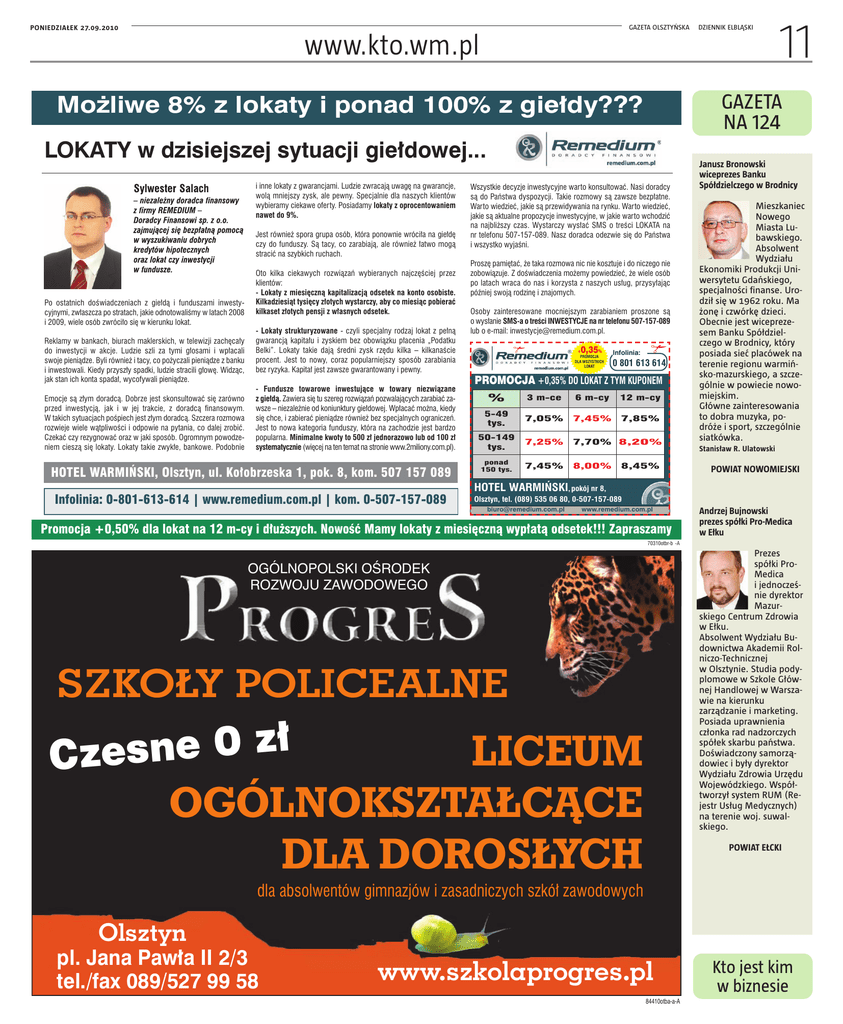PONIEDZIAŁEK 27.09.2010 GAZETA OLSZTYŃSKA www.kto.wm.pl LOKATY w dzisiejszej sytuacji giełdowej... Jest również spora grupa osób, która ponownie wróciła na giełdę czy do funduszy. Są tacy, co zarabiają, ale również łatwo mogą stracić na szybkich ruchach. Po ostatnich doświadczeniach z giełdą i funduszami inwestycyjnymi, zwłaszcza po stratach, jakie odnotowaliśmy w latach 2008 i 2009, wiele osób zwróciło się w kierunku lokat. Reklamy w bankach, biurach maklerskich, w telewizji zachęcały do inwestycji w akcje. Ludzie szli za tymi głosami i wpłacali swoje pieniądze. Byli również i tacy, co pożyczali pieniądze z banku i inwestowali. Kiedy przyszły spadki, ludzie stracili głowę. Widząc, jak stan ich konta spadał, wycofywali pieniądze. Emocje są złym doradcą. Dobrze jest skonsultować się zarówno przed inwestycją, jak i w jej trakcie, z doradcą finansowym. W takich sytuacjach pośpiech jest złym doradcą. Szczera rozmowa rozwieje wiele wątpliwości i odpowie na pytania, co dalej zrobić. Czekać czy rezygnować oraz w jaki sposób. Ogromnym powodzeniem cieszą się lokaty. Lokaty takie zwykłe, bankowe. Podobnie Oto kilka ciekawych rozwiązań wybieranych najczęściej przez klientów: - Lokaty z miesięczną kapitalizacją odsetek na konto osobiste. Kilkadziesiąt tysięcy złotych wystarczy, aby co miesiąc pobierać kilkaset złotych pensji z własnych odsetek. - Lokaty strukturyzowane - czyli specjalny rodzaj lokat z pełną gwarancją kapitału i zyskiem bez obowiązku płacenia „Podatku Belki”. Lokaty takie dają średni zysk rzędu kilka – kilkanaście procent. Jest to nowy, coraz popularniejszy sposób zarabiania bez ryzyka. Kapitał jest zawsze gwarantowany i pewny. - Fundusze towarowe inwestujące w towary niezwiązane z giełdą. Zawiera się tu szereg rozwiązań pozwalających zarabiać zawsze – niezależnie od koniunktury giełdowej. Wpłacać można, kiedy się chce, i zabierać pieniądze również bez specjalnych ograniczeń. Jest to nowa kategoria funduszy, która na zachodzie jest bardzo popularna. Minimalne kwoty to 500 zł jednorazowo lub od 100 zł systematycznie (więcej na ten temat na stronie www.2miliony.com.pl). HOTEL WARMIŃSKI, Olsztyn, ul. Kołobrzeska 1, pok. 8, kom. 507 157 089 Infolinia: 0-801-613-614 | www.remedium.com.pl | kom. 0-507-157-089 Wszystkie decyzje inwestycyjne warto konsultować. Nasi doradcy są do Państwa dyspozycji. Takie rozmowy są zawsze bezpłatne. Warto wiedzieć, jakie są przewidywania na rynku. Warto wiedzieć, jakie są aktualne propozycje inwestycyjne, w jakie warto wchodzić na najbliższy czas. Wystarczy wysłać SMS o treści LOKATA na nr telefonu 507-157-089. Nasz doradca odezwie się do Państwa i wszystko wyjaśni. Proszę pamiętać, że taka rozmowa nic nie kosztuje i do niczego nie zobowiązuje. Z doświadczenia możemy powiedzieć, że wiele osób po latach wraca do nas i korzysta z naszych usług, przysyłając później swoją rodzinę i znajomych. Osoby zainteresowane mocniejszym zarabianiem proszone są o wysłanie SMS-a o treści INWESTYCJE na nr telefonu 507-157-089 lub o e-mail: [email protected]. fi ® 0,35% + PROMOCJA DLA WSZYSTKICH LOKAT Infolinia: 11 GAZETA NA 124 Możliwe 8% z lokaty i ponad 100% z giełdy??? i inne lokaty z gwarancjami. Ludzie zwracają uwagę na gwarancje, wolą mniejszy zysk, ale pewny. Specjalnie dla naszych klientów wybieramy ciekawe oferty. Posiadamy lokaty z oprocentowaniem nawet do 9%. DZIENNIK ELBLĄSKI fi 0 801 613 614 PROMOCJA +0,35% DO LOKAT Z TYM KUPONEM % 3 m-ce 6 m-cy 12 m-cy 5-49 tys. 7,05% 7,45% 7,85% 50-149 tys. 7,25% 7,70% 8,20% ponad 150 tys. 7,45% 8,00% 8,45% Janusz Bronowski wiceprezes Banku Spółdzielczego w Brodnicy Mieszkaniec Nowego Miasta Lubawskiego. Absolwent Wydziału Ekonomiki Produkcji Uniwersytetu Gdańskiego, specjalności finanse. Urodził się w 1962 roku. Ma żonę i czwórkę dzieci. Obecnie jest wiceprezesem Banku Spółdzielczego w Brodnicy, który posiada sieć placówek na terenie regionu warmińsko-mazurskiego, a szczególnie w powiecie nowomiejskim. Główne zainteresowania to dobra muzyka, podróże i sport, szczególnie siatkówka. Stanisław R. Ulatowski POWIAT NOWOMIEJSKI HOTEL WARMIŃSKI, pokój nr 8, Olsztyn, tel. (089) 535 06 80, 0-507-157-089 [email protected] www.remedium.com.pl Promocja +0,50% dla lokat na 12 m-cy i dłuższych. Nowość Mamy lokaty z miesięczną wypłatą odsetek!!! Zapraszamy Andrzej Bujnowski prezes spółki Pro-Medica w Ełku 70310otbr-b -A Prezes spółki ProMedica i jednocześnie dyrektor Mazurskiego Centrum Zdrowia w Ełku. Absolwent Wydziału Budownictwa Akademii Rolniczo-Technicznej w Olsztynie. Studia podyplomowe w Szkole Głównej Handlowej w Warszawie na kierunku zarządzanie i marketing. Posiada uprawnienia członka rad nadzorczych spółek skarbu państwa. Doświadczony samorządowiec i były dyrektor Wydziału Zdrowia Urzędu Wojewódzkiego. Współtworzył system RUM (Rejestr Usług Medycznych) na terenie woj. suwalskiego. OGÓLNOPOLSKI OŚRODEK ROZWOJU ZAWODOWEGO SZKOŁY POLICEALNE ł z 0 e n s LICEUM Cze OGÓLNOKSZTAŁCĄCE DLA DOROSŁYCH POWIAT EŁCKI dla absolwentów gimnazjów i zasadniczych szkół zawodowych Olsztyn pl. Jana Pawła II 2/3 tel./fax 089/527 99 58 www.szkolaprogres.pl 84410otba-a-A Kto jest kim w biznesie