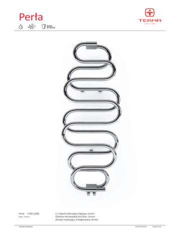 Perła Cr Perła 1760 x 600 kolor: chrom www.termaheat.pl kolor w cenie 2 x Zawór odcinający kątowy, chrom Głowica termostatyczna Slim, chrom Zestaw maskujący zintegrowany, chrom 20150714wolka strona 1 z 5 Perła Cr kolor w cenie projekt: Terma Podłączenia: Polecamy: f Zestaw maskujący zintegrowany Podkład cynkowy Wersja elektryczna na stronie 4. zinc primer Dostępne rozmiary: 960 x 500 ↕ 960 x 600 ↔ 1360 x 500 1360 x 600 1760 x 500 1760 x 600 Dane techniczne: Ciśnienie robocze: 1,0 MPa Maksymalna temperatura pracy: 95°C p v A B C1 75|65|20°C 55|45|20°C D E F ↕ ↔ [mm] [W] [W] [mm] [mm] [mm] [dm³] [kg] Kod produktu Kod konfiguracji s. 4 farba proszkowa 960 500 50 337 172 200 360 180 3,16 11,80 WGPER096050 960 600 50 371 189 230 360 180 3,47 12,50 WGPER096060 1360 500 50 478 244 160 600 340 4,41 13,17 WGPER136050 1360 600 50 528 269 220 600 340 4,88 14,29 WGPER136060 1760 500 50 630 321 200 600 540 5,75 16,40 WGPER176050 1760 600 50 704 359 290 600 540 6,45 18,09 WGPER176060 powłoka galwaniczna 960 500 50 229 117 200 360 180 3,16 11,80 WGPER096050 960 600 50 252 129 230 360 180 3,47 12,50 WGPER096060 1360 500 50 325 166 160 600 340 4,41 13,17 WGPER136050 1360 600 50 359 183 220 600 340 4,88 14,29 WGPER136060 1760 500 50 419 214 200 600 540 5,75 16,40 WGPER176050 1760 600 50 488 249 290 600 540 6,45 18,09 WGPER176060 W zestawie: Grzejnik c.o. sprzedawany wraz z dwoma zaworami odcinającymi kątowymi z gwintem zewnętrznym (białe i silver do swoich odpowiedników kolorystycznych, chromowane do pozostałych). Do zestawu dołączono głowicę termostatyczną NOBLE (biała i silver do swoich odpowiedników kolorystycznych, chromowaną do pozostałych), adaptery na instalację (alu-pex oraz miedź). www.termaheat.pl 20150714wolka strona 2 z 5 Perła Cr kolor w cenie 73 ÷ 88 ZX ZX C1 142 ÷ 157 73 ÷ 88 Cu 15 B 55 ÷ 70 D C1 Alupex 16x2 ▼▲ 142 ÷ 157 Alupex 16x2 ▼▲ Cu 15 B 55 ÷ 70 E A D F E A D/2 D/2 ▲▼ F 42 ÷ 57 ▲▼ 42 ÷ 57 2 3 A – wysokość B – szerokość C1-C5 – rozstaw podłączeń D – rozstaw konsol w poziomie E – rozstaw konsol w pionie, F – odległość od osi dolnej konsoli do dolnej krawędzi kolektora Profil: 2 3 www.termaheat.pl 20150714wolka strona 3 z 5 Perła Cr kolor w cenie W tabelach przy kartach technicznych produktów umieszczone są kody produktów, które dostarczają podstawowych informacji o produktach. W celu doprecyzowania właściwości produktu kody produktów należy uzupełnić o pełny kod konfiguracji. Kod konfiguracji należy umieścić w ciągu znaków po kodzie produktu jak w przykładzie poniżej: Budowa kodu konfiguracji grzejnika c.o. WGALE054030 K916SX KOD KARTOTEKI (umieszczony w tabeli przy produkcie) KOD KONFIGURACJI (uzupełniany ręcznie) Konfiguracja K 916 SX kod opakowania kod koloru kod podłączenia K - karton Proszkowy podkład cynkowy C – kod proszkowego podkładu cynkowego uzupełniany jest w kodzie nietypowości. WLALE054030 K916SX C www.termaheat.pl kod nietypowości 20150714wolka strona 4 z 5 Perła Cr kolor w cenie Legenda Cr Grzejnik dostępny także w wersji chromowanej. Grzejnik dostępny w wersji c.o. Grzejnik przystosowany do pracy jako grzejnik c.o. z podłączoną grzałką elektryczną. Grzejnik dostępny w wersji elektrycznej z przewodem grzejnym lub z czynnikiem grzewczym i grzałką. Produkt fabrycznie przetestowany i gotowy do użytku. Podstawowy wariant podłączenia grzejnika. Ikona wskazuje sposób zasilania oraz powrotu wody w danym podłączeniu oraz umiejscowienie wkładki termostatycznej oraz grzałki, jeśli istnieje możliwość ich zamontowania. Typ podłączenia opcjonalnego dla danego grzejnika. Moc grzejnika elektrycznego lub sugerowana moc grzałki przeznaczonej do grzejnika c.o. Waga. Pojemność. www.termaheat.pl 20150714wolka strona 5 z 5