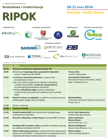 2. Ogólnopolska konferencja Rozbudowa i modernizacja 10-11 MAJA 2016 RIPOK Ostróda – ZUOK Rudno ORGANIZATOR PATRONAT HONOROWY WSPÓŁPRACA PARTNER STRATEGICZNY PARTNERZY GŁÓWNI PARTNERZY Program z dnia 28-04-2016 10 maja 2016 09:50 Otwarcie konferencji: zaproszeni goście VIP 10:05 Aktualizacja krajowego planu gospodarki odpadami – szanse i zagrożenia dla RIPOK 10:25 In-house a prywatne podmioty, czy grozi nam monopolizacja rynku? Na czym opierać założenia w zakresie rozbudowy i modernizacja RIPOK, na jaki akt się powoływać, czy obowiązują jakiekolwiek standardy? Wpływ aktualizacji wpgo na plany rozbudowy i modernizacji, jak skutecznie odwołać się od uchwały wpgo Powrót in-house w odpadach, na jakich warunkach gminna spółka będzie mogła obierać odpady 11:50 11:10 11:20 Pytania i dyskusja Przerwa na kawę 11:50 Projekt konkluzji BAT dla mechaniczno-biologicznego przetwarzania odpadów Kierunki rozbudowy i modernizacji instalacji MBP w Polsce 12:10 12:30 12:50 Tomasz Styś Instytut Sobieskiego Anna Specht-Schampera Kancelaria Prawna Schampera, Dubis, Zając i Wspólnicy Sp. k. Maciej Kiełbus Dr Krystian Ziemski & Partners Kancelaria Prawna Sp. K. dr inż. Piotr Manczarski Politechnika Warszawska Adam Jurkiewicz Marek Klimek Sutco Polska Sp. z o.o. Konkluzje BAT a polskie realia, jak polskie instalacje wpisują Marek Kundegórski się najlepsze dostępne techniki Sweco Consulting Sp. z o.o. Etapy modernizacji sortowni z wykorzystaniem separatorów Mariusz Rajca optycznych AUTOSORT z nastawieniem na zwiększenie ilości Tomra Sorting Solutions wydzielanych frakcji materiałowych do recyklingu. 13:10 13:25 13:45 Przykład: Zrealizowana inwestycja w Polsce – wyposażenie, nakłady i efekty Rozbudowa i modernizacja RIPOK – praktyczne aspekty transferu ryzyka zakładu Modernizacja RIPOK celem dostosowania do aktualnych trendów w gospodarce odpadami oraz wymogów prawnych 14:20 Zwiększenie efektywności procesu kompostowania przez zastosowanie profesjonalnych przerzucarek BACKHUS Stabilizacja beztlenowa jako niezbędny element kompleksowego i nowoczesnego RIPOK – efektywność i działanie zakładów fermentacji Pytania i dyskusja 14:30 Obiad 15:20 Kompleksowa analiza zakładu (aspekty prawne, bhp, dostępna technologia, optymalizacja procesu) 15:40 Technologiczno-prawne przesłanki budowy i modernizacji komponentów wchodzących w skład instalacji MBP Jak zwiększyć konkurencyjność rynkową z zakresie gospodarki odpadami Samorządowa Stacja Segregacji – rozbudowa zakładu – koszty i wyzwania 14:00 15:55 16:10 16:30 16:45 17:00 17:20 65% recyklingu: sterylizacja odpadów jako wsparcie istniejących instalacji MBP Dezodoryzacja obiektów RIPOK Czy warto inwestować w innowacyjne technologie? Rozbudowa instalacji sortowniczej, celem zwiększenia wydajność procesu odzysku odpadów – koszty doposażenia linii Rozbudowa zakładu, na co zwrócić uwagę aby instalacja była wydajna ekologicznie oraz ekonomicznie 17:40 Pytania i dyskusja 17:50 Zakończenie I dnia 18:1019:30 Rejs statkiem po jeziorze Drwęckim przy hotelu I grupa 60 osób rejs od 18:10-18:50 II grupa 60 osób rejs od 18:50-19:30 Hanna Rudolf EIB SA Leszek Rochowicz Zakład Unieszkodliwiania Odpadów Komunalnych RUDNO Sp. z o.o. Mirosław Kowalski EAB BACKHUS GmbH Andrzej Krzyśków proGeo Sp. z o.o. Wrocław Mariusz Piasecki Miejski Zakład Komunalny Sp. z o.o. w Stalowej Woli Łukasz Kubisz AK Nova Sp. z o.o. Radosław Michalec Profeko Sp. z o.o. Adam Galanek, Paweł Bałon Ostrołęckie Towarzystwo Budownictwa Społecznego Spółka z o.o. Michał Paca Bioelektra Group S.A. Marek Szatkowski Westrand Marian Wojtkowski Zakład Utylizacji Odpadów sp. z o.o., Elbląg Aneta Kamińska Zakład Utylizacji Odpadów Stałych Sp. z o.o., Tczew 20:3000:30 Kolacja z oprawą muzyczną oraz występem kabaretu „Smile” 11 maja 2016 10:00 10:15 11:0013:00 13:45 Zbiórka w recepcji hotelu Villa Port Wyjazd do ZUOK Rudno Wizytacja Zakładu Unieszkodliwiania Odpadów Komunalnych Rudno Sp. z o.o. w Rudnie k/Ostródy Ponad 60 mln PLN kosztowała inwestycja związana z rozbudową zakładu. Korzyści płynące z rozbudowy zakładu: 1. Zwiększenie odzysku surowców wtórnych – zamontowano 5 nowych sorterów, przepustowość sortowni 65.000 Mg/rok. 2. Zwiększenie zatrudnienia – obecnie Zakład zatrudnia 150 osób. 3. Możliwość dokonywania we własnym zakresie napraw samochodów i innych sprzętów – budowa budynku warsztatowo-garażowego wraz z wyposażeniem. 4. Kompleksowa obsługa gmin zrzeszonych w Związku Gmin Regionu Ostródzko-Iławskiego „Czyste Środowisko” – budowa trzech stacji przeładunkowych. 5. Zmniejszenie ilości składowanych odpadów (oszczędność miejsca na składowisku). 6. Kompostowanie, produkcja RDF. 6. Stabilizacja/kompostowanie frakcji organicznej wysegregowanej z odpadów komunalnych zmieszanych 27 000 Mg/rok z podziałem na sekcje produkcji kompostu gorszej jakości (stabilizatu) oraz produkcji kompostu wysokiej jakości z selektywnie zbieranych odpadów,. Powrót, obiad w hotelu Organizator: tel. 61 67 00 965 [email protected] www.ekorum.pl