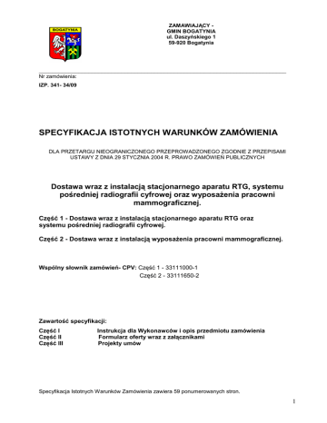 ZAMAWIAJĄCY GMIN BOGATYNIA ul. Daszyńskiego 1 59-920 Bogatynia ___________________________________________________________________________ Nr zamówienia: IZP. 341- 34/09 SPECYFIKACJA ISTOTNYCH WARUNKÓW ZAMÓWIENIA DLA PRZETARGU NIEOGRANICZONEGO PRZEPROWADZONEGO ZGODNIE Z PRZEPISAMI USTAWY Z DNIA 29 STYCZNIA 2004 R. PRAWO ZAMÓWIEŃ PUBLICZNYCH Dostawa wraz z instalacją stacjonarnego aparatu RTG, systemu pośredniej radiografii cyfrowej oraz wyposaŜenia pracowni mammograficznej. Część 1 - Dostawa wraz z instalacją stacjonarnego aparatu RTG oraz systemu pośredniej radiografii cyfrowej. Część 2 - Dostawa wraz z instalacją wyposaŜenia pracowni mammograficznej. Wspólny słownik zamówień- CPV: Część 1 - 33111000-1 Część 2 - 33111650-2 Zawartość specyfikacji: Część I Część II Część III Instrukcja dla Wykonawców i opis przedmiotu zamówienia Formularz oferty wraz z załącznikami Projekty umów Specyfikacja Istotnych Warunków Zamówienia zawiera 59 ponumerowanych stron. 1 CZĘŚĆ I INSTRUKCJA DLA WYKONAWCÓW 1. NAZWA ORAZ ADRES ZAMAWIAJĄCEGO Gmina Bogatynia adres : Urząd Miasta i Gminy w Bogatyni ul. Daszyńskiego 1 59-920 Bogatynia telefon - 075 77 33 961 wew. 54 fax. 075 77 33 961 wew.42, adres internetowy: www.bogatynia.pl 2. TRYB UDZIELENIA ZAMÓWIENIA Niniejsze postępowanie prowadzone jest w trybie przetargu nieograniczonego o wartości nie przekraczającej kwoty określonej w przepisach wydanych na podstawie art. 11 ust. 8 ustawy Prawo zamówień publicznych ( tj. Dz. U. z 2007 r. Nr 223, poz. 1655 ze zm. ) zwanej dalej „Ustawą”. 3. OPIS PRZEDMIOTU ZAMÓWIENIA 3.1. Przedmiotem zamówienia jest dostawa wraz z instalacją, przeszkoleniem personelu i serwisem w okresie trwania gwarancji, stacjonarnego aparatu RTG, systemu pośredniej radiografii cyfrowej oraz wyposaŜenia pracowni mammograficznej. Wymieniony wyŜej sprzęt naleŜy dostarczyć do Szpitala Gminnego SP ZOZ w Bogatyni przy ul. Szpitalnej 16 (aparat RTG oraz system pośredniej radiografii cyfrowej) oraz Przychodni Rejonowej SP ZOZ w Bogatyni przy ul. Wyczółkowskiego 15 (wyposaŜenie pracowni mammograficznej) Oferowany sprzęt musi być sprzętem fabrycznie nowym, nie uŜytkowanym (równieŜ do prezentacji) – rok produkcji 2009. Zamawiający dopuszcza złoŜenie ofert częściowych zgodnie poniŜszym podziałem: Część 1: Dostawa wraz z instalacją, przeszkoleniem personelu i serwisem, stacjonarnego aparatu RTG oraz systemu pośredniej radiografii cyfrowej. Część 2: Dostawa wraz z instalacją, przeszkoleniem personelu i serwisem wyposaŜenia pracowni mammograficznej. Zakres dostaw obejmuje równieŜ transport oraz rozładunek przedmiotu zamówienia. 3.2. PARAMETRY TECHNICZNE STACJONARNEGO APARATU RTG – CZĘŚĆ 1 Lp. Określenie urządzenia i jego parametrów 1 2 WARUNEK GRANICZNY - wartość wymagana/ jednostka 3 1. Wymagania ogólne 1.1. Zasilanie 3 x 400 /50 [V/Hz] 2. Generator 2.1 Generator wysokiej częstotliwości HF 2.2 Moc generatora TAK Min. 50 [kW] 2 2.3 Zakres regulacji napięcia anodowego 2.4 Zakres regulacji prądu anodowego 2.5 Zakres regulacji ładunku 2.6 Zakres regulacji czasu ekspozycji Automatyczna regulacja dawki ekspozycyjnej AEC dla stołu i statywu Ręczne ograniczenie maksymalnej dawki ekspozycyjnej dla stołu i 2.8 statywu przy pracy z układem AEC 2.7 min. 40 ÷ 150 [kV] min. 10 ÷ 630 [mA] min. 0.5 ÷ 1000 [mAs] min. 1÷ 6300 [msek] TAK TAK 2.9 Programy nastaw anatomicznych w polskiej wersji językowej TAK min. 700 programów 2.1 Autodiagnostyka urządzenia z sygnalizacją nieprawidłowości 0 TAK 2.1 MoŜliwość stosowania lamp rtg róŜnych producentów 1 TAK lampy min. trzech róŜnych producentów 3. Lampa rtg 3.1 Szybkość wirowania anody ( rzeczywista) 3.2 Wielkość małego ogniska lampy 3.3 Wielkość duŜego ogniska lampy 3.4 Pojemność cieplna anody lampy 3.5 Pojemność cieplna kołpaka lampy Moc małego ogniska lampy dla zadeklarowanej szybkości wirowania Moc duŜego ogniska lampy dla zadeklarowanej szybkości 3.7 wirowania Automatyka zabezpieczająca przed przegrzaniem z prezentacją 3.8 stopnia nagrzania lampy na konsoli generatora 3.6 min.8500 [obr/min] max. 0.6 [mm] max. 1.2 [mm] min. 400 [kHU] min. 1700 [kHU] min. 40 [kW] min. 80 [kW] TAK 4. Kolimator 4.1 4.2 4.3 4.4 Kolimator ręczny Halogenowy symulator pola Znacznik laserowy MoŜliwość obrotu kolimatora 5. Kolumna podłogowa lampy rtg 5.1 Konstrukcja podłogowa kolumny lampy RTG 5.2 WzdłuŜny ruch lampy RTG 5.3 Poprzeczny ( teleskopowy) ruch lampy RTG 5.4 Ruch pionowy lampy rtg 5.5 Minimalna odległość ogniska lampy do podłogi przy wykonywaniu zdjęć promieniem poziomym 5.6 Obrót lampy RTG wokół osi pionowej 5.7 Obrót kolumny RTG wokół osi poziomej 5.8 Cyfrowy wyświetlacz informacji o odległości SID TAK TAK TAK TAK TAK min. 240 [cm] min. 27 [cm] min.160 [cm] max 28 [cm] min. +90 / - 90 [°] Min. + 180 / -180 [°] TAK 3 5.9 Cyfrowy wyświetlacz informacji o kącie obrotu lampy 5.1 Hamulce elektromagnetyczne 0 TAK TAK 6. Stół do zdjęć kostnych 6.1 Długość blatu stołu 6.2 Szerokość blatu stołu 6.3 Zakres motorowej regulacji wysokości blatu stołu 6.4 Minimalna odległość blatu stołu od podłogi 6.5 Ruch wzdłuŜny blatu stołu 6.6 Ruch poprzeczny blatu stołu 6.7 Pochłanialność blatu stołu 6.8 MoŜliwe rozmiary kaset w zakresie Ruchoma kratka przeciwrozproszeniowa uruchamiana w czasie ekspozycji 6.1 Komora AEC trójpolowa 0 6.1 Zakres przesuwu panelu Bucky 1 6.1 ObciąŜalność płyty pacjenta bez ograniczeń ruchów 2 6.1 Uchwyty rąk pacjenta 3 6.1 Hamulce elektromagnetyczne 4 6.9 min. 220 [cm] min. 80 [cm] min. 30 [cm] max. 57 [cm] min. 102 [cm] min. 24 [cm] max. 0,8 [mm Al.] min. 18x24 ÷ 35x43 [cm] (Podać) TAK TAK min. 52 [cm] min. 280 [kg] TAK TAK 7. Statyw do zdjęć odległościowych 7.1 Ruch pionowy panelu Bucky 7.2 Minimalna odległość środka kasety umieszczonej w panelu Bucky od podłogi 7.3 MoŜliwe rozmiary kaset Ruchoma krat