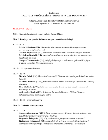 Konferencja TRADYCJA WSPÓŁCZEŚNIE – REPETYCJA CZY INNOWACJA? Katedra Antropologii Literatury i Badań Kulturowych UJ 20-21 stycznia 2012, Kraków, ul. Grodzka 64 20. 01. 2012 – piątek 9.00 – Otwarcie konferencji – prof. dr hab. Ryszard Nycz Blok I: Tradycja vs. pamięć kulturowa - spory wokół metodologii 9.15 – 11.15 Maria Kobielska (UJ), Nowa zabawka literaturoznawcy. Do czego jest nam potrzebna pamięć kulturowa? Aldona Kopkiewicz (UJ), Par coeur. Nieunikniona i niezobowiązująca tradycja Michalina Kmiecik (UJ), Antytradycjonalizm czy inna tradycja – o awangardowej redefinicji nowości Justyna Tabaszewska (UJ), Między kultywacją a wyborem – spór wokół pojęcia tradycji w polskim literaturoznawstwie 11.15-11.35 – przerwa kawowa 11.35 – 13.35 Natalia Palich (UJ), Wyzwoleni z tradycji? Literatura i krytyka postkolonialna wobec kanonu Mateusz Kotwica (UWr), Intertekstualność wobec metodologii - przemiany i zakresy zjawiska Ewa Zielińska (UW), Antykwaryczna uczta. Smakowanie tradycji w koncepcji Gianniego Vattimo Aleksander Kopka (UJ), O dialogu Jacques’a Derridy z Hélène Cixous – intertekstualność, inspiracje i wpływ 13.35 – 13.55 – przerwa kawowa Blok II: Praktyka i interpretacja 13.55. – 15.20 Justyna Gorzkowicz (KUL), Idea vanitas w sztuce Roberta Kuśmirowskiego jako przykład transdyscyplinarnej gry z tradycją Bogumiła Śniegocka (UJ), Czy popbanalizm jest powtórzeniem pop-artu? Katarzyna Szkaradnik (UŚ), „Odnaleźć się w tym, z czego się kiedyś uciekło”. Mieczysława Porębskiego hermetyczne spojrzenie na tradycję i cywilizację 15.20 - 16.25 – przerwa obiadowa 16.25 – 17.55 Ewa Wojciechowska (UJ), Dialektyka dopowiadania i doczytywania, albo romantyzm jako metodologia: Mochnacki, Brzozowski, Piwińska Klaudia Ordzowiały-Grzegorczyk (UJ), Julian Przyboś czyta Mickiewicza Marta Teresa Nowicka (UG), Od Słowackiego mistycznego do Słowackiego współczesnego 18.10-19.40 Małgorzata Szumna (UJ), Intelektualny rodowód „prywatnych obowiązków” Czesława Miłosza Michał Piętniewicz (UJ), Dialektyka całości i fragmentu na przykładzie „Widnokręgu” Wiesława Myśliwskiego 21.01. 2012 – sobota Blok III: Konstruowanie tradycji 8.30 - 10.00 Aleksandra Sowa-Zduńczyk (UŚ), Stanisława Barańczaka „Piosenki nieśpiewane Żonie...” w kontekście tradycji: odniesienie, zaprzeczenie, tworzenie nowego Anna Kasperek (UJ), Między nowatorstwem a tradycją – poszukiwanie współczesnego modelu powieści u prozaików pokolenia 1910 Piotr Gorliński-Kucik (UŚ), Tradycja literacka w „Lodzie” – między parodią a symulacją 10.00-13.00 – przerwa 13.00- 15.00 Emilia Prucia (UW), Przeszłość to dziś. Tradycja i nowoczesność w ponadczasowej oświeceniowej myśli filozoficznej Aleksandra Jastrzębska (UJ), Tradycja w lekturze nieznawców Krzysztof Jajko (UŁ), W poszukiwaniu tradycji gatunków filmowych Anna Jarmuszkiewicz (UJ), Kanon i tradycja w perspektywie literatury światowej 15.00 – 16.00 – przerwa obiadowa Blok IV: Nietradycyjne próby gry z tradycją 16.00 -18.00 Kamila Czaja (UŚ), Kanon(y) „poety-belfra" – Paweł Lekszycki wobec tradycji Katarzyna Kantner (UJ), „Podmiot mediumiczny” E.E. Olgi Tokarczuk a tradycja modernistycznej powieści psychologicznej Marta Górzna (UAM), Józef i jego bracia Tomasza Manna wobec mitu, tradycji i pamięci kulturowej Małgorzata Południak (UWr), „Zadziwiający Maurycy i jego edukowane gryzonie” Terry'ego Pratchetta jako przykład wykorzystania tradycji literackiej w fantasy 18.00 – 18.15 – przerwa kawowa 18.15 - 19.40 Katarzyna Grzegorek (UAM), Tradycja we współczesnym dyskursie politycznym Agnieszka Szpylma (UAM), Językowe kształtowanie wyobrażenia o przeszłości. Współczesna literatura popularna wobec tradycji Sienkiewiczowskiej (na przykładzie „Galeonów Wojny” Jacka Komudy) Arkadiusz Sylwester Mastalski (UP), Pogo i breakdance. Konstrukcja prozodyjna tekstów Marcina Świetlickiego i Leszka Kaźmierczaka jako element interpretacji tradycji 20. 00 – zamknięcie konferencji
