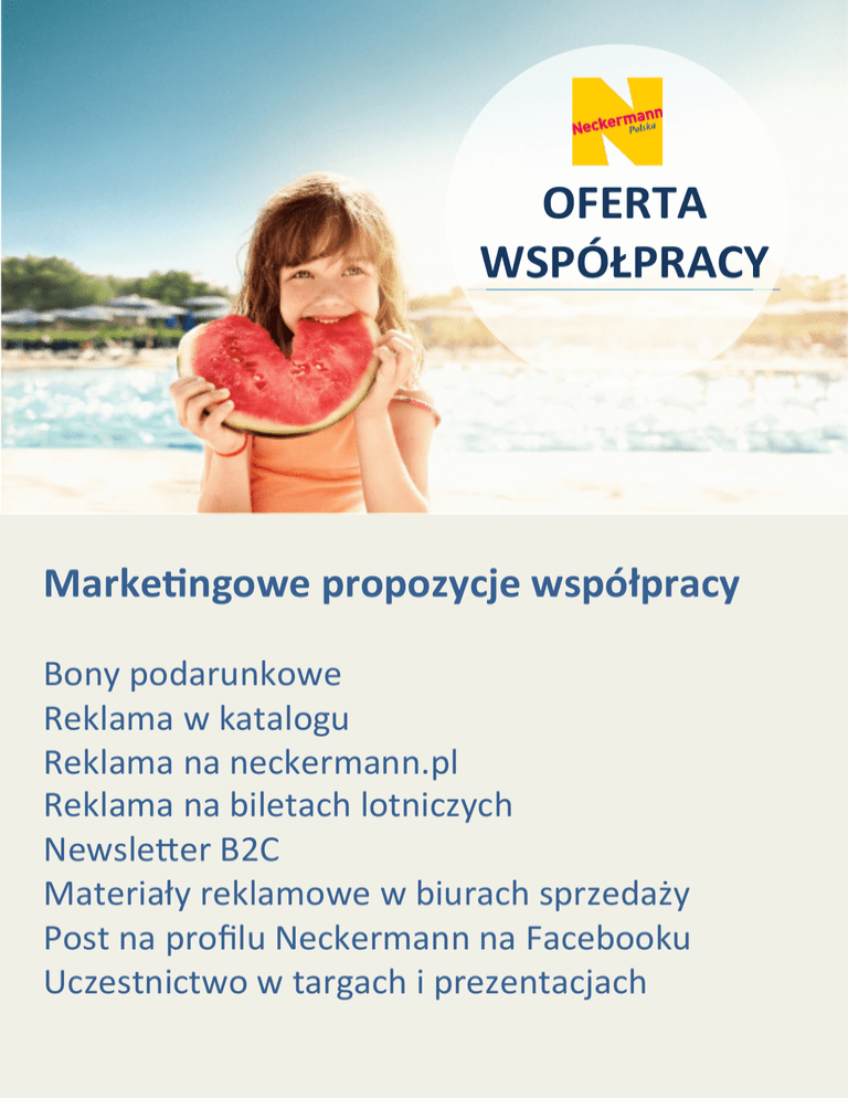 OFERTA WSPÓŁPRACY Marke4ngowe propozycje współpracy Bony podarunkowe Reklama w katalogu Reklama na neckermann.pl Reklama na biletach lotniczych Newsle;er B2C Materiały reklamowe w biurach sprzedaży Post na profilu Neckermann na Facebooku Uczestnictwo w targach i prezentacjach Bony podarunkowe Neckermann Polska oferuje sprzedaż bonów na preferencyjnych warunkach, elastyczne podejście oraz doradztwo w zakresie optymalizacji kosztów dystrybucji i obiegu bonów. DLA KOGO BONY PODARUNKOWE? KLIENCI DYSTRYBUCJA PRACOWNICY POPULARNOŚĆ BONÓW ROŚNIE! Na przestrzeni lat bony i karty podarunkowe stały się trwałym elementem systemu benefitów. Jak wynika z regularnie przeprowadzanych badań rynku stale wzrasta przekonanie, że bony są bardziej efektywne niż nagrody pieniężne. • Stanowią skuteczny mechanizm motywacyjny, • mobilizują do osiągania wyznaczonych celów jak również, • przywiązują do firmy zarówno pracowników jak i kontrahentów. Reklama w katalogu Neckermann Polska oferuje sprzedaż powierzchni w katalogach letnich i zimowych. Reklama w neckermann.pl Neckermann Polska oferuje sprzedaż powierzchni na skyscraperach, bannerach i sliderach na neckermann.pl Reklama na biletach lotniczych Neckermann Polska oferuje możliwość umieszczenia reklamy na elektronicznych dokumentach podróży, które otrzymują wszyscy Klienci Neckermanna. Newsle[er B2C Neckermann Polska oferuje możliwość wysłania specjalnego newsle;era do bazy Klientów Neckermanna. Materiały reklamowe w biurach sprzedaży Neckermann Polska oferuje możliwość umieszczenia w 20 własnych biurach sprzedaży na terenie Polski ulotek, plakatów, lama posterów, kalendarzy czy rollupów. Post na profilu Neckermanna na Facebooku Neckermann Polska oferuje możliwość umieszczenia promowanych postów na profilu Neckermanna na Facebooku. Uczestnictwo w targach i prezentacjach Neckermann Polska zaprasza do udziału w targach turystycznych oraz prezentacjach katalogów w charakterze Partnera. Specyfikacje poszczególnych produktów Rodzaj produktu Format Ilość Ilość biur Odbiorcy Bony Dowolna kwota, 210x110mm Dowolna ilość n/a n/a Reklama w katalogu 192x256 mm 1 Ca.1200 Reklama na neckermann.pl Skyscraper: 160x600px 1-‐2 Banner: 900x80px 1 n/a 400 000 UU w miesiącu Reklama na biletach elektronicznych 160x95mm 1 n/a ca. 3000 Klientów miesięcznie Newsle;er B2C Dowolny 1 n/a 82 000 Klientów Materiały reklamowe w biurach sprzedaży Ulotka: 150x110mm Plakat: 400x840mm Lama poster: 269x207mm Kalendarz: 315x770mm 6500 45 20 20 65 Post na profilu Neckermann na Facebooku Grafika 404x404px, 20% tekstu Treść posta 160 znaków 1 n/a Uczestnictwo w targach i prezentacjach W zależności od imprezy: stand, rollup, plakat, ulotki itd.. 1 n/a Ca. 32 000 fanów Zasięg ca. 200 000 użytkowników Skontaktuj się z nami Piotr Czorniej Brand Manager [email protected] (22) 536 98 62 Ewa Mielczarek Junior Brand Manager [email protected] (22) 536 98 68