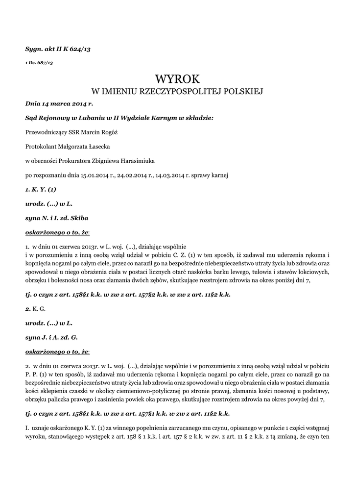 Sygn. akt II K 624/13 1 Ds. 687/13 WYROK W IMIENIU RZECZYPOSPOLITEJ POLSKIEJ Dnia 14 marca 2014 r. Sąd Rejonowy w Lubaniu w II Wydziale Karnym w składzie: Przewodniczący SSR Marcin Rogóż Protokolant Małgorzata Łasecka w obecności Prokuratora Zbigniewa Harasimiuka po rozpoznaniu dnia 15.01.2014 r., 24.02.2014 r., 14.03.2014 r. sprawy karnej 1. K. Y. (1) urodz. (...) w L. syna N. i I. zd. Skiba oskarżonego o to, że: 1. w dniu 01 czerwca 2013r. w L. woj. (...), działając wspólnie i w porozumieniu z inną osobą wziął udział w pobiciu C. Z. (1) w ten sposób, iż zadawał mu uderzenia rękoma i kopnięcia nogami po całym ciele, przez co naraził go na bezpośrednie niebezpieczeństwo utraty życia lub zdrowia oraz spowodował u niego obrażenia ciała w postaci licznych otarć naskórka barku lewego, tułowia i stawów łokciowych, obrzęku i bolesności nosa oraz złamania dwóch zębów, skutkujące rozstrojem zdrowia na okres poniżej dni 7, tj. o czyn z art. 158§1 k.k. w zw z art. 157§2 k.k. w zw z art. 11§2 k.k. 2. K. G. urodz. (...) w L. syna J. i A. zd. G. oskarżonego o to, że: 2. w dniu 01 czerwca 2013r. w L. woj. (...), działając wspólnie i w porozumieniu z inną osobą wziął udział w pobiciu P. P. (1) w ten sposób, iż zadawał mu uderzenia rękoma i kopnięcia nogami po całym ciele, przez co naraził go na bezpośrednie niebezpieczeństwo utraty życia lub zdrowia oraz spowodował u niego obrażenia ciała w postaci złamania kości sklepienia czaszki w okolicy ciemieniowo-potylicznej po stronie prawej, złamania kości nosowej u podstawy, obrzęku paliczka prawego i zasinienia powiek oka prawego, skutkujące rozstrojem zdrowia na okres powyżej dni 7, tj. o czyn z art. 158§1 k.k. w zw z art. 157§1 k.k. w zw z art. 11§2 k.k. I. uznaje oskarżonego K. Y. (1) za winnego popełnienia zarzucanego mu czynu, opisanego w punkcie 1 części wstępnej wyroku, stanowiącego występek z art. 158 § 1 k.k. i art. 157 § 2 k.k. w zw. z art. 11 § 2 k.k. z tą zmianą, że czyn ten kwalifikuje w zw. z art. 57a § 1 k.k. i za to na podstawie art. 158 § 1 k.k. w zw. z art. 57a § 1 k.k. w zw. z art. 11 § 3 k.k. wymierza mu karę 1 (jednego ) roku i 4 ( czterech) miesięcy pozbawienia wolności, II. uznaje oskarżonego K. G. za winnego popełnienia zarzucanego mu czynu, opisanego w punkcie 2 części wstępnej wyroku, stanowiącego występek z art. 158 § 1 k.k. i art. 157 § 1 k.k. w zw. z art. 11 § 2 k.k. z tą zmianą, że czyn ten kwalifikuje w zw. z art. 57a § 1 k.k. i za to na podstawie art. 157 § 1 k.k. w zw. z art. 57a § 1 k.k. w zw. z art. 11 § 3 k.k. wymierza mu karę 2 (dwóch) lat pozbawienia wolności, III. na podstawie art. 69 § 1 i 2 k.k. i art. 70 § 2 k.k. warunkowo zawiesza oskarżonemu K. Y. (1) wykonanie orzeczonej kary pozbawienia wolności na okres próby wynoszący 5 (pięć) lat, IV. na podstawie art. 46 § 1 k.k. orzeka wobec oskarżonego K. Y. (1) obowiązek naprawienia szkody poprzez zapłatę na rzecz pokrzywdzonego C. Z. (1) kwoty 1900 ( jeden tysiąc dziewięćset ) złotych tytułem odszkodowania oraz kwoty 2 000 ( dwa tysiące ) złotych tytułem zadośćuczynienia za doznaną krzywdę, V. na podstawie art. 46 § 1 k.k. orzeka wobec oskarżonego K. G. obowiązek naprawienia szkody poprzez zapłatę na rzecz pokrzywdzonego P. P. (2) kwoty 150 ( sto pięćdziesiąt ) złotych tytułem odszkodowania oraz kwoty 15 000 ( piętnaście tysięcy) złotych tytułem zadośćuczynienia za doznaną krzywdę, VI. na podstawie art. 73 § 2 k.k. oddaje oskarżonego K. Y. (1) w okresie próby pod dozór kuratora sądowego, VII. na podstawie art. 627 k.p.k. zasądza od oskarżonego K. Y. (1) na rzecz oskarżyciela posiłkowego C. Z. (1) kwotę 1 008 ( jeden tysiąc osiem złotych) tytułem zwrotu kosztów zastępstwa procesowego oskarżyciela posiłkowego, VIII. na podstawie art. 627 k.p.k. zasądza od oskarżonego K. G. na rzecz oskarżyciela posiłkowego P. P. (2) kwotę 1 008 ( jeden tysiąc osiem złotych) tytułem zwrotu kosztów zastępstwa procesowego oskarżyciela posiłkowego, IX. na podstawie art. 624 § 1 k.p.k. zwalania oskarżonych w całości od zapłaty kosztów sądowych obciążając nimi Skarb Państwa, a na podstawie art. 17 ust. 1 ustawy z dnia 23.06.1973 r. o opłatach w sprawach karnych (t.j.Dz.U.1983.49.223 z późn. zm.) nie wymierza im opłaty. UZASADNIENIE Sąd ustalił następujący stan faktyczny: W nocy z piątku 31 maja 2013 r. na sobotę 1 czerwca 2013 r. znajomi C. Z. (1), P. P. (1), M. K., K. K. oraz D. M. przebywali w lokalu I. H. przy ul. (...) w L.. Około godziny 2:00 z baru wyszedł M. K. i udał się do samochodu zaparkowanego w pobliżu sklepu (...), umiejscowionego po przeciwnej stronie ulicy. M. K. był trzeźwy. Kilka minut później lokal opuścili wspólnie C. Z. (2) oraz P. P. (3), którzy znajdowali się pod wpływem alkoholu. Idąc w kierunku samochodu śpiewali przyśpiewki klubu sportowego (...). Kiedy znajdowali się w odległości 3-4 m od samochodu od strony Alei (...) podeszła do nich grupa 6-7 osób. dowód: • zeznania pokrzywdzonego C. Z. (1) k.6, 117 • zeznania pokrzywdzonego P. P. (2) k.15v, 117, • zeznania świadka M. K. k.57, 112-113, • protokoły badania trzeźwości k.2, 3 W grupie tej znajdowali się K. Y. (1) (ubrany m.in. w bluzę z kapturem na długi rękaw) i K. G.. Obaj znajdowali się pod wpływem alkoholu. W sposób wulgarny, krótko skomentowali oni śpiew P. P. (2) i C. Z. (1). Następnie K. G. zaatakował P. P. (2) uderzając go pięścią w twarz. W tym samym czasie stojący obok K. Y. (2) zaatakował C. Z. (1) uderzając go pięścią w twarz. P. P. (1) upadł na ziemię. Wówczas K. G. zaczął kopać go w głowę, w tors i po nogach. W tym czasie do K. G. dołączył inny nieustalony napastnik. Całą sytuację obserwował w lusterku samochodu M. K., który wysiadł z auta i zaczął odciągać siłą K. G. oraz drugiego napastnika, od leżącego na parkingu