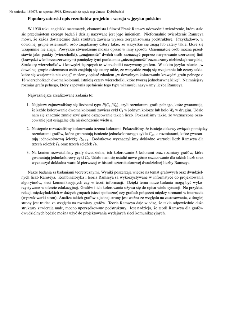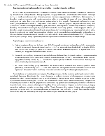 Nr wniosku: 186673, nr raportu: 5998. Kierownik (z rap.): mgr Janusz Dybizbański Popularyzatorski opis rezultatów projektu - wersja w j˛ezyku polskim W 1930 roku angielski matematyk, ekonomista i filozof Frank Ramsey udowodnił twierdzenie, które stało si˛e przedmiotem szeregu badań i dzisiaj nazywane jest jego imieniem. Nieformalnie twierdzenie Ramseya mówi, że każda dostatecznie duża struktura zawiera wysoce zorganizowana˛ podstruktur˛e. Przykładowo, w dowolnej grupie osiemnastu osób znajdziemy cztery takie, że wszystkie si˛e znaja˛ lub cztery takie, które si˛e wzajemnie nie znaja.˛ Powyższe stwierdzenie można opisać w inny sposób. Osiemnaście osób można przedstawić jako punkty (wierzchołki), „znajomość” dwóch osób zaznaczyć poprzez narysowanie czerwonej linii (kraw˛edzi w kolorze czerwonym) pomi˛edzy tymi punktami a „nieznajomość” zaznaczamy niebieska˛ kraw˛edzia.˛ Struktur˛e wierzchołków i kraw˛edzi łacz ˛ acych ˛ te wierzchołki nazywamy grafem. W takim j˛ezyku zdanie „w dowolnej grupie osiemnastu osób znajduja˛ si˛e cztery takie, że wszystkie znaja˛ si˛e wzajemnie lub cztery takie, które si˛e wzajemnie nie znaja” ˛ możemy opisać zdaniem „w dowolnym kolorowaniu kraw˛edzi grafu pełnego o 18 wierzchołkach dwoma kolorami, istnieja˛ cztery wierzchołki, które tworza˛ jednobarwna˛ klik˛e”. Najmniejszy rozmiar grafu pełnego, który zapewnia spełnienie tego typu własności nazywamy liczba˛ Ramseya. Najważniejsze zrealizowane zadania to: 1. Najpierw zajmowaliśmy si˛e liczbami typu R(C4 ,Wn ), czyli rozmiarami grafu pełnego, które gwarantuja,˛ że każde kolorowanie dwoma kolorami zawiera cykl C4 w jednym kolorze lub koło Wn w drugim. Udało nam si˛e znacznie zmniejszyć górne oszacowanie takich liczb. Pokazaliśmy także, że wyznaczone oszacowanie jest osiagalne ˛ dla nieskończenie wielu n. ˛ pomi˛edzy 2. Nast˛epnie rozważaliśmy kolorowania trzema kolorami. Pokazaliśmy, że istnieje ciekawy zwiazek rozmiarami grafów, które gwarantuja˛ istnienie jednokolorowego cyklu C2n , a rozmiarami, które gwarantuja˛ jednokolorowa˛ ścieżk˛e P2n+1 . Dodatkowo wyznaczyliśmy dokładne wartości liczb Ramseya dla trzech ścieżek P8 oraz trzech ścieżek P9 . 3. Na koniec rozważaliśmy grafy dwudzielne, ich kolorowanie k kolorami oraz rozmiary grafów, które gwarantuja˛ jednokolorowy cykl C4 . Udało nam si˛e ustalić nowe górne oszacowanie dla takich liczb oraz wyznaczyć dokładna wartość pierwszej w historii czterokolorowej dwudzielnej liczby Ramseya. Nasze badania sa˛ badaniami teoretycznymi. Wyniki poszerzaja˛ wiedz˛e na temat grafowych oraz dwudzielnych liczb Ramseya. Kombinatoryka i teoria Ramseya sa˛ wykorzystywane w informatyce do projektowania algorytmów, sieci komunikacyjnych czy w teorii informacji. Dzi˛eki temu nasze badania moga˛ być wykorzystywane w ofercie edukacyjnej. Grafów i ich kolorowania używa si˛e do opisu wielu sytuacji. Na przykład relacji mi˛edzyludzkich w dużych grupach (sieci społeczne) czy grafach połaczeń ˛ mi˛edzy stronami w internecie (wyszukiwarki stron). Analiza takich grafów z jednej strony jest ważna ze wzgl˛edu na zastosowania, z drugiej strony jest trudna ze wzgl˛edu na rozmiary grafów. Teoria Ramseya daje wiedz˛e, że takie odpowiednio duże struktury zawieraja˛ małe, mocno uporzadkowane ˛ podstruktury. Jest nadzieja, że teorii Ramseya dla grafów dwudzielnych b˛edzie można użyć do projektowania wydajnych sieci komunikacyjnych.