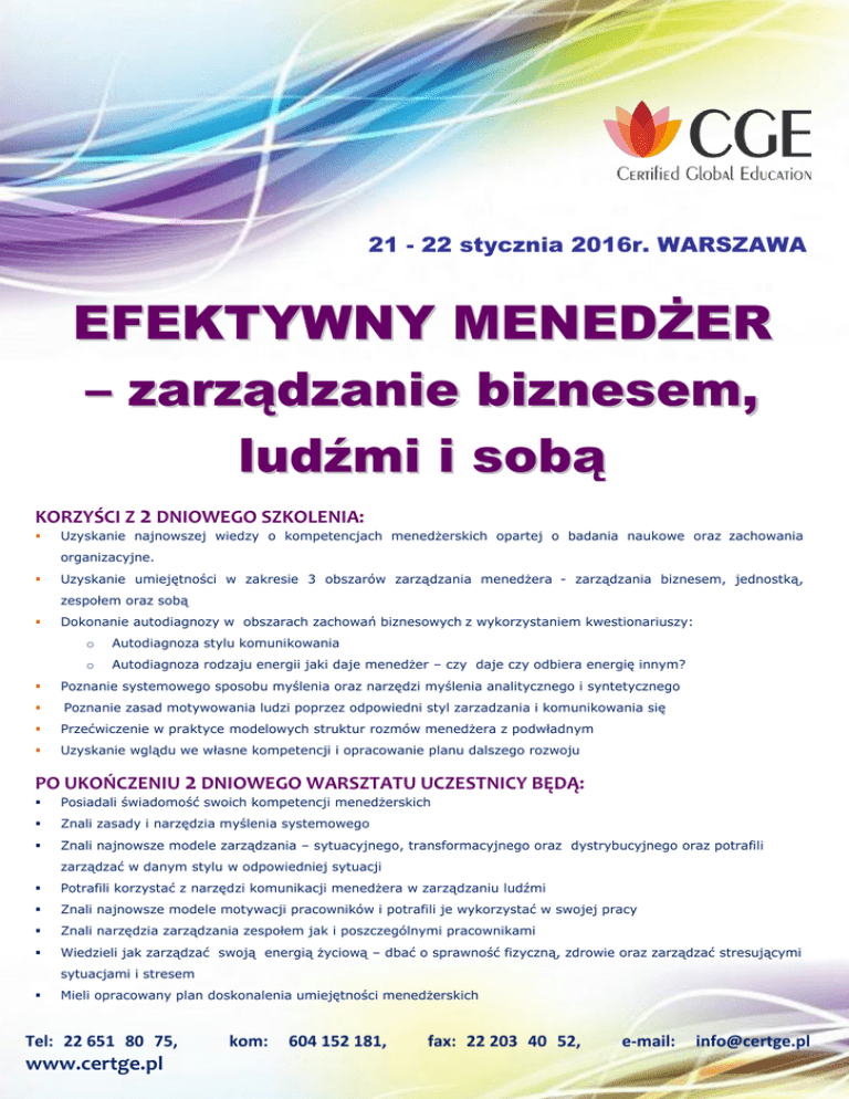 21 - 22 stycznia 2016r. WARSZAWA EFEKTYWNY MENEDŻER – zarządzanie biznesem, ludźmi i sobą KORZYŚCI Z 2 DNIOWEGO SZKOLENIA: Uzyskanie najnowszej wiedzy o kompetencjach menedżerskich opartej o badania naukowe oraz zachowania organizacyjne. Uzyskanie umiejętności w zakresie 3 obszarów zarządzania menedżera - zarządzania biznesem, jednostką, zespołem oraz sobą Dokonanie autodiagnozy w obszarach zachowań biznesowych z wykorzystaniem kwestionariuszy: o Autodiagnoza stylu komunikowania o Autodiagnoza rodzaju energii jaki daje menedżer – czy daje czy odbiera energię innym? Poznanie systemowego sposobu myślenia oraz narzędzi myślenia analitycznego i syntetycznego Poznanie zasad motywowania ludzi poprzez odpowiedni styl zarzadzania i komunikowania się Przećwiczenie w praktyce modelowych struktur rozmów menedżera z podwładnym Uzyskanie wglądu we własne kompetencji i opracowanie planu dalszego rozwoju PO UKOŃCZENIU 2 DNIOWEGO WARSZTATU UCZESTNICY BĘDĄ: Posiadali świadomość swoich kompetencji menedżerskich Znali zasady i narzędzia myślenia systemowego Znali najnowsze modele zarządzania – sytuacyjnego, transformacyjnego oraz dystrybucyjnego oraz potrafili zarządzać w danym stylu w odpowiedniej sytuacji Potrafili korzystać z narzędzi komunikacji menedżera w zarządzaniu ludźmi Znali najnowsze modele motywacji pracowników i potrafili je wykorzystać w swojej pracy Znali narzędzia zarządzania zespołem jak i poszczególnymi pracownikami Wiedzieli jak zarządzać swoją energią życiową – dbać o sprawność fizyczną, zdrowie oraz zarządzać stresującymi sytuacjami i stresem Mieli opracowany plan doskonalenia umiejętności menedżerskich Tel: 22 651 80 75, www.certge.pl kom: 604 152 181, fax: 22 203 40 52, e-mail: [email protected] EFEKTYWNY MENEDŻER – zarządzanie biznesem, ludźmi i sobą. 21 – 22 STYCZNIA 2016r. WARSZAWA, WARSZTATY OPIS SZKOLENIA: Program 2 dniowego szkolenia oparty jest na najnowszych, światowych programach i sprawdzonych modelach rozwoju kompetencji menedżerskich. Oparty jest na koncepcji 3 obszarów, którym zajmuje się menedżer: zarządzaniu działaniami aby osiągnąć cele biznesowe, zarządzaniu ludźmi – zespołem oraz poszczególnymi pracownikami i zarządzaniu sobą. Menedżer efektywność osiąga wtedy, gdy potrafi zintegrować kompetencje w tych trzech obszarach. Na warsztacie uczestnicy poznają modele, techniki i narzędzia, stosowanie w praktyce biznesowej właśnie w tych trzech obszarach. Warsztat opracowany i prowadzony jest przez doświadczonego praktyka zarządzania, wieloletniego menedżera w globalnych organizacjach - Wiolettę Małota, autorkę książki „Jak z menedżera stać się przywódcą”, absolwentkę studiów doktoranckich w zakresie nauk o zarządzaniu na Akademii Leona Koźmińskiego w Warszawie. Program warsztatu zakorzeniony jest w praktyce zarządzania oraz zorientowany na uzyskanie konkretnych praktycznych korzyści przez uczestników. METODY SZKOLENIOWE Zajęcia odbywają się w formie warsztatu, w którym uczestnicy zdobędą najnowszą wiedzę z zakresu nowoczesnego zarządzania oraz umiejętności praktyczne z tego zakresu potrzebne do zastosowania w ich codziennej pracy zawodowej. Przedstawiane narzędzia i techniki będą doskonalone w praktycznych ćwiczeniach. ZAŁOŻENIA PROGRAMOWE 1. WPROWADZENIE DO 4 KOMPETENCJI 4 Model kompetencji menedżera Diagnoza własnego stylu komunikowania się 2. ZARZĄDZANIE BIZNESEM Wyznaczanie i realizacja celów biznesowych Mierniki efektywności – czyli praca z KPI 3. ZARZĄDZANIE PRACOWNKIEM Style zarządzania Motywowanie ludzi Komunikowanie się z pracownikami Rozwijanie pracowników – menedżer w roli Coacha oraz Mentora 4. ZARZĄDZANIE ZESPOŁEM Twój wpływ na zespół – dajesz czy odbierasz energie zespołowi Zasady zarządzania zespołem – elastyczność w dostrzeganiu każdego pracownika osobno i traktowaniu pracowników jako zespół 5. ZARZĄDZANIE SOBĄ Diagnoza typu osobowości A czy B Strategie zarządzania stresem Techniki odnawiania energii życiowej PROGRAM DZIEŃ I MODUŁ I – MODUŁ II – ZARZĄDZANIE BIZNESEM WPROWADZENIE Model kompetencji menedżera – poznanie modelowych kompetencji w zakresie zarządzania biznesem, ludźmi i sobą Określenie własnego profilu kompetencji Diagnoza własnego stylu komunikowania się Jaki styl reprezentujesz styl przywódczy, towarzyski, analityczny czy przyjacielski? Tel: 22 651 80 75, www.certge.pl kom: 604 152 181, "Nie można rozwiązać problemów naszej egzystencji na tym samym poziomie myślenia, na którym zostały wykreowane" ~Albert Einstein Wyznaczanie celów, monitoring ich realizacji oraz ewaluacja Struktura różnych typów rozmów z pracownikiem na każdym etapie realizacji celów: o Ustalanie celu – model SMARTR o Monitorowanie celów – model SSC o Ewaluacja celu – model GOLD fax: 22 203 40 52, e-mail: [email protected] EFEKTYWNY MENEDŻER – zarządzanie biznesem, ludźmi i sobą. 21 – 22 stycznia 2016r. Warszawa, WARSZTATY MODUŁ III – ZARZĄDZANIE PRACOWNKIEM "Są dwie trwałe rzeczy, które możemy dać uczniowi: pierwsza to korzenie - druga to skrzydła" STYLE ZARZĄDZANIA o Micozarządzanie, zarządzanie sytuacyjne oraz dystrybuowane o Narzędzia komunikacji stosowane w każdym ze stylów o Motywowanie innych poprzez stosowanie odpowiedniego stylu zarządzania MOTYWOWANIE LUDZI o 3 Czynniki motywujące podwładnych, których źródłem jest menedżer o Tworzenie środowiska dla pracownika motywującego go do pracy Diagnoza: Dajesz czy odbierasz ludziom energię? (kwestionariusz) KOMUNIKOWANIE SIĘ Z PRACOWNIKAMI o Style komunikowania się – diagnoza swojego stylu – jednego z czterech stylów* o Charakterystyka stylów komunikacji i rodzaju wywieranego wpływu na innych o Zasady komunikowania się z osobami o danym stylu o Umiejętności komunikowania się – zadawanie otwierających pytań, słuchanie, komunikacja bez barier o Men