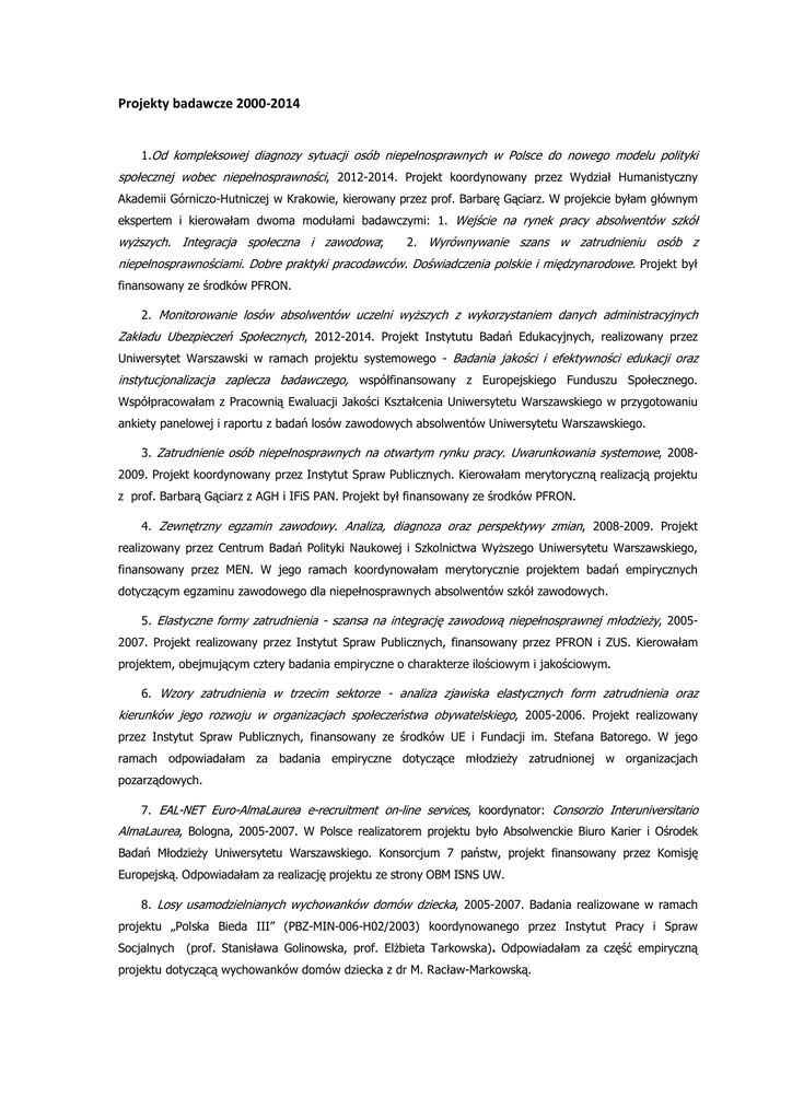 Projekty badawcze 2000-2014 1.Od kompleksowej diagnozy sytuacji osób niepełnosprawnych w Polsce do nowego modelu polityki społecznej wobec niepełnosprawności, 2012-2014. Projekt koordynowany przez Wydział Humanistyczny Akademii Górniczo-Hutniczej w Krakowie, kierowany przez prof. Barbarę Gąciarz. W projekcie byłam głównym ekspertem i kierowałam dwoma modułami badawczymi: 1. Wejście na rynek pracy absolwentów szkół wyższych. Integracja społeczna i zawodowa; 2. Wyrównywanie szans w zatrudnieniu osób z niepełnosprawnościami. Dobre praktyki pracodawców. Doświadczenia polskie i międzynarodowe. Projekt był finansowany ze środków PFRON. 2. Monitorowanie losów absolwentów uczelni wyższych z wykorzystaniem danych administracyjnych Zakładu Ubezpieczeń Społecznych, 2012-2014. Projekt Instytutu Badań Edukacyjnych, realizowany przez Uniwersytet Warszawski w ramach projektu systemowego - Badania jakości i efektywności edukacji oraz instytucjonalizacja zaplecza badawczego, współfinansowany z Europejskiego Funduszu Społecznego. Współpracowałam z Pracownią Ewaluacji Jakości Kształcenia Uniwersytetu Warszawskiego w przygotowaniu ankiety panelowej i raportu z badań losów zawodowych absolwentów Uniwersytetu Warszawskiego. 3. Zatrudnienie osób niepełnosprawnych na otwartym rynku pracy. Uwarunkowania systemowe, 20082009. Projekt koordynowany przez Instytut Spraw Publicznych. Kierowałam merytoryczną realizacją projektu z prof. Barbarą Gąciarz z AGH i IFiS PAN. Projekt był finansowany ze środków PFRON. 4. Zewnętrzny egzamin zawodowy. Analiza, diagnoza oraz perspektywy zmian, 2008-2009. Projekt realizowany przez Centrum Badań Polityki Naukowej i Szkolnictwa Wyższego Uniwersytetu Warszawskiego, finansowany przez MEN. W jego ramach koordynowałam merytorycznie projektem badań empirycznych dotyczącym egzaminu zawodowego dla niepełnosprawnych absolwentów szkół zawodowych. 5. Elastyczne formy zatrudnienia - szansa na integrację zawodową niepełnosprawnej młodzieży, 20052007. Projekt realizowany przez Instytut Spraw Publicznych, finansowany przez PFRON i ZUS. Kierowałam projektem, obejmującym cztery badania empiryczne o charakterze ilościowym i jakościowym. 6. Wzory zatrudnienia w trzecim sektorze - analiza zjawiska elastycznych form zatrudnienia oraz kierunków jego rozwoju w organizacjach społeczeństwa obywatelskiego, 2005-2006. Projekt realizowany przez Instytut Spraw Publicznych, finansowany ze środków UE i Fundacji im. Stefana Batorego. W jego ramach odpowiadałam za badania empiryczne dotyczące młodzieży zatrudnionej w organizacjach pozarządowych. 7. EAL-NET Euro-AlmaLaurea e-recruitment on-line services, koordynator: Consorzio Interuniversitario AlmaLaurea, Bologna, 2005-2007. W Polsce realizatorem projektu było Absolwenckie Biuro Karier i Ośrodek Badań Młodzieży Uniwersytetu Warszawskiego. Konsorcjum 7 państw, projekt finansowany przez Komisję Europejską. Odpowiadałam za realizację projektu ze strony OBM ISNS UW. 8. Losy usamodzielnianych wychowanków domów dziecka, 2005-2007. Badania realizowane w ramach projektu „Polska Bieda III” (PBZ-MIN-006-H02/2003) koordynowanego przez Instytut Pracy i Spraw Socjalnych (prof. Stanisława Golinowska, prof. Elżbieta Tarkowska). Odpowiadałam za część empiryczną projektu dotyczącą wychowanków domów dziecka z dr M. Racław-Markowską. 9. Human Resources in Research & Development: Monitoring System on Career Paths and Mobility Flows, 2004-2005. Koordynator: University of Kassel, prof. Harald Schomburg. Współpraca 9 państw. Projekt finansowany przez Komisję Europejską. Odpowiadałam za projekt ze strony ISNS (analiza dokumentacyjna). Udział w raporcie końcowym z dr Marcinem Sińczuchem, pt. Dynamics of Researchers` Career Paths and Mobility. 10. Instytucjonalne i rodzinne formy opieki zastępczej nad dziećmi i młodzieżą, 2003-2004. Projekt realizowany przez Instytut Spraw Publicznych. Odpowiadałam za część empiryczną projektu z dr Mariolą Racław-Markowską. 11. Analiza i ocena systemu orzekania o czasowej niezdolności do pracy, 2003-2004. Projekt Instytutu Spraw Publicznych, finansowany przez Krajową Izbę Gospodarczą. Odpowiadałam za część empiryczną projektu z dr Mariolą Racław-Markowską. 12. Społeczności lokalne wobec problemu bezrobocia młodzieży, 2002-2003. Projekt realizowany przez Instytut Spraw Publicznych, dofinansowany przez Levi Strauss Foundation. Odpowiadałam za część empiryczną projektu z dr Mariolą Racław-Markowską. 13. Decentralizacja funkcji społecznych państwa, 2000. Uczestniczyłam w realizacji i opracowaniu monografii lokalnych. Projekt realizowany przez Instytut Spraw Publicznych pod kierunkiem prof. Józefiny Hrynkiewicz.