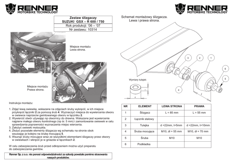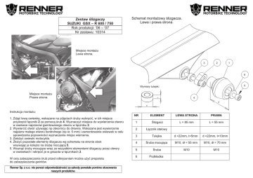 Zestaw œlizgaczy SUZUKI GSX – R 600 / 750 Rok produkcji: ’06 – ‘07 Nr zestawu: 10314 Schemat monta¿owy œlizgacza. Lewa i prawa strona. Miejsce monta¿u Lewa strona. 3 2 1 6 5 Wymiary tulejek: 4 t Miejsce monta¿u Prawa strona. L d Instrukcja monta¿u: 1. Zdj¹æ lew¹ owiewkê, wskazane na zdjêciach œruby wykrêciæ, w ich miejsce przykrêciæ ³¹czniki 2 za pomoc¹ œrub 4. Wyznaczyæ miejsca do wywiercenia otworu w owiewce naprzeciw gwintowanego otworu w ³¹czniku 2. 2. Wywierciæ otwór u¿ywaj¹c np otwornicy do drewna. Wskazane jest wywiercenie najpierw ma³ego otworu kontrolnego (np œr. 5 mm) i zamontowanie owiewek w celu sprawdzenia poprawnoœci wyznaczenia miejsc wiercenia. 3. Za³o¿yæ owiewki motocykla. 4. Z³o¿yæ pozosta³e elementy œlizgacza wg schematu na stronie obok wsuwaj¹c je kolejno na œrubê mocuj¹c¹ 5. 5. Wsun¹æ œruby mocuj¹ce wraz ze wszystkimi elementami œlizgaczy przez otwory w owiewkach i wkrêciæ je w gniazda w ³¹cznikach 2. W celu zabezpieczenia œrub przed odkrêceniem mo¿na u¿yæ preparatu do zabezpieczania gwintów. Renner Sp. z o.o. nie ponosi odpowiedzialnoœci za szkody powsta³e pomimo stosowania naszych produktów. NR ELEMENT LEWA STRONA PRAWA 1 Œlizgacz L = 85 mm L = 55 mm 2 £¹cznik stalowy 3 Tulejka d =22mm, t=5mm d =22mm, t=10mm 4 Œruba mocuj¹ca M10, d³ = 55 mm M10, d³ = 70 mm 5 Œruba M10 6 Podk³adka M10