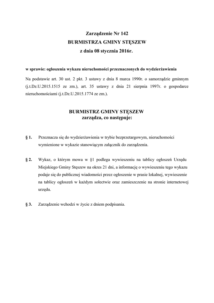 Zarządzenie Nr 142 BURMISTRZA GMINY STĘSZEW z dnia 08 stycznia 2016r. w sprawie: ogłoszenia wykazu nieruchomości przeznaczonych do wydzierżawienia Na podstawie art. 30 ust. 2 pkt. 3 ustawy z dnia 8 marca 1990r. o samorządzie gminnym (j.t.Dz.U.2015.1515 ze zm.), art. 35 ustawy z dnia 21 sierpnia 1997r. o gospodarce nieruchomościami (j.t.Dz.U.2015.1774 ze zm.). BURMISTRZ GMINY STĘSZEW zarządza, co następuje: § 1. Przeznacza się do wydzierżawienia w trybie bezprzetargowym, nieruchomości wymienione w wykazie stanowiącym załącznik do zarządzenia. § 2. Wykaz, o którym mowa w §1 podlega wywieszeniu na tablicy ogłoszeń Urzędu Miejskiego Gminy Stęszew na okres 21 dni, a informację o wywieszeniu tego wykazu podaje się do publicznej wiadomości przez ogłoszenie w prasie lokalnej, wywieszenie na tablicy ogłoszeń w każdym sołectwie oraz zamieszczenie na stronie internetowej urzędu. § 3. Zarządzenie wchodzi w życie z dniem podpisania. Załącznik do Zarządzenia nr 142 Burmistrza Gminy Stęszew z dnia 08 stycznia 2016r. WYKAZ NIERUCHOMOŚCI PRZEZNACZONYCH DO WYDZIERŻAWIENIA Na podstawie art. 35 ustawy z dnia 21 sierpnia 1997r. o gospodarce nieruchomościami (j.t.Dz.U.2015.1774 ze zm.), podaje się do publicznej wiadomości wykaz nieruchomości przeznaczonych do wydzierżawienia na terenie gminy Stęszew. Lp. Oznaczenie nieruchomości wg Powierzchnia Położenie Przeznaczenie Okres Wysokość opłat z Termin wnoszenia Tryb wydzierżawienia ewidencji gruntów Nr działki nieruchomości nieruchomości nieruchomości i trwania tytułu dzierżawy opłat i określenie dzierżawcy sposób jej umowy Nr KW 2 wm zagospodarowania 1. 47/29 PO1S/000 44849/9 30 Strykowo ul. Parkowa 7a Grunt pod garażem nr 1 3 lata 200,- zł netto rocznie 28 luty każdego roku Bezprzetargowo 2. 47/29 PO1S/000 44849/9 30 Strykowo ul. Parkowa 7a Grunt pod garażem nr 2 3 lata 200,- zł netto rocznie 28 luty każdego roku Bezprzetargowo 3. 47/29 PO1S/000 44849/9 30 Strykowo ul. Parkowa 7a Grunt pod garażem nr 3 3 lata 200,- zł netto rocznie 28 luty każdego roku Bezprzetargowo 4. 47/29 PO1S/000 44849/9 30 Strykowo ul. Parkowa 7a Grunt pod garażem nr 4 3 lata 200,- zł netto rocznie 28 luty każdego roku Bezprzetargowo 5. 47/29 PO1S/000 44849/9 30 Strykowo ul. Parkowa 7a Grunt pod garażem nr 8 3 lata 200,- zł netto rocznie 28 luty każdego roku Bezprzetargowo 6. 47/29 PO1S/000 44849/9 30 Strykowo ul. Parkowa 7a Grunt pod garażem nr 9 3 lata 200,- zł netto rocznie 28 luty każdego roku Bezprzetargowo 7. Cz. dz. 385/2 PO1S/000 48816/7 50 Dębno, Działalność 3 lata 250,- zł netto Do dnia 10 Bezprzetargowo ul. Powstańców handlowa miesięcznie każdego miesiąca Wlkp. 31a Dzierżawca tytułem zabezpieczenia winien wnieść najpóźniej w dniu podpisania umowy jednorazową opłatę w wysokości: w przypadku pozycji od 1.do 6. - 246,00 zł, w przypadku pozycji 7. – trzymiesięcznej opłaty z tytułu dzierżawy, rozliczoną w ostatnim roku dzierżawy Przygotowała: K. Grupa
