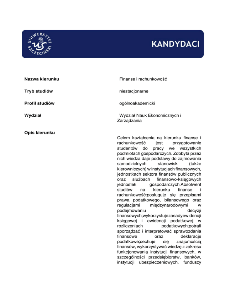 Nazwa kierunku Finanse i rachunkowość Tryb studiów niestacjonarne Profil studiów ogólnoakademicki Wydział Wydział Nauk Ekonomicznych i Zarządzania Opis kierunku Celem kształcenia na kierunku finanse i rachunkowość jest przygotowanie studentów do pracy we wszystkich podmiotach gospodarczych. Zdobyta przez nich wiedza daje podstawy do zajmowania samodzielnych stanowisk (także kierowniczych) w instytucjach finansowych, jednostkach sektora finansów publicznych oraz służbach finansowo-księgowych jednostek gospodarczych.Absolwent studiów na kierunku finanse i rachunkowość:posługuje się przepisami prawa podatkowego, bilansowego oraz regulacjami międzynarodowymi w podejmowaniu decyzji finansowych;wykorzystujezasadyewidencji księgowej i ewidencji podatkowej w rozliczeniach podatkowych;potrafi sporządzać i interpretować sprawozdania finansowe oraz deklaracje podatkowe;cechuje się znajomością finansów, wykorzystywać wiedzę z zakresu funkcjonowania instytucji finansowych, w szczególności przedsiębiorstw, banków, instytucji ubezpieczeniowych, funduszy inwestycyjnych, podmiotów sektora finansów publicznych;podejmuje decyzje na podstawie analizy informacji finansowoksięgowych oraz wszechstronnej oceny ryzyka;rozumie występowanie ryzyka na rynku finansowym i globalnym oraz umie nim zarządzać;przeprowadza analizę fundamentalną rynku kapitałowego i wyciąga z niej wnioski decyzyjne;stosuje narzędzia niezbędne do podejmowania decyzji dotyczących oceny kondycji finansowejjednostek;posługujesięjęzykiem obcym w praktyce finansów, rachunkowości i bankowości. Specjalności Student ma możliwość napisania pracy magisterskiej w ramach następujących specjalności: – Rachunkowość finansowa i auditing – Rachunkowość zarządcza i controlling – Doradztwo finansowo–księgowe – Finanse i rachunkowość przedsiębiorstw – Bankowość i rynki finansowe – Financial Management Specjalności uruchamiane są w trakcie trwania studiów (wybór nastąpi od 2 semestru studiów). Uruchomienie danej specjalności uwarunkowane jest liczbą zadeklarowanych na tę specjalność studentów. Kryteria kwalifikacji Do postępowania kwalifikacyjnego mogą przystąpićosobylegitymującesiędyplomem ukończenia studiów co najmniej pierwszego stopnia. Kryterium kwalifikacji jest ocena na dyplomie. Przykładowe przedmioty prawo finansowe standardy sprawozdawczości finansowej zarządzanie instytucjami kredytowymi Możliwości zatrudnienia Absolwent posiada wiedzę, umiejętności i kompetencje społeczne przygotowujące go m.in. do pełnienia funkcji specjalisty w działach finansowych i księgowych przedsiębiorstw i administracji publicznej oraz w działach rachunkowości instytucji finansowych (banków i zakładów ubezpieczeniowych). Posiada wiedzę, umiejętności i kompetencje społeczne przygotowujące go do pełnienia funkcji samodzielnego specjalisty w działach controllingu i rachunkowości zarządczej przedsiębiorstw. Kwalifikacje absolwenta przygotowują do zawodów: specjalistads.rachunkowościinwestycyjnej, ds. wynagrodzeń, ds. controllingu, ds. zamówień publicznych, ds. planowania strategicznego,doradca: finansowy, inwestycyjny, podatkowy,koordynator projektów unijnych,projektant pakietów usług finansowych,analityk finansowy. Kontynuacja nauki Absolwenci studiów na kierunku finanse i rachunkowość mają możliwość kontynuowania kształcenia na innych kierunkach studiów trzeciego stopnia i podyplomowych, realizowanych na Uniwersytecie Szczecińskim. Terminy Terminy postępowania rekrutacjnego na studia stacjonarne i niestacjonarne rozpoczynające się od roku akademickiego 2016/2017. Dokumenty Powered by TCPDF (www.tcpdf.org)