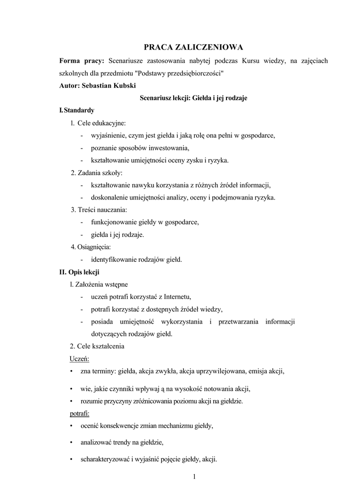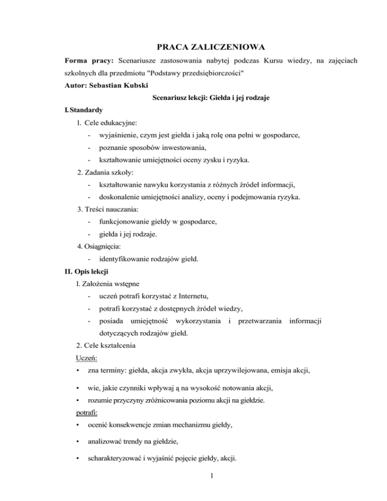 PRACA ZALICZENIOWA Forma pracy: Scenariusze zastosowania nabytej podczas Kursu wiedzy, na zajęciach szkolnych dla przedmiotu "Podstawy przedsiębiorczości" Autor: Sebastian Kubski Scenariusz lekcji: Giełda i jej rodzaje I. Standardy 1. Cele edukacyjne: - wyjaśnienie, czym jest giełda i jaką rolę ona pełni w gospodarce, - poznanie sposobów inwestowania, - kształtowanie umiejętności oceny zysku i ryzyka. 2. Zadania szkoły: - kształtowanie nawyku korzystania z różnych źródeł informacji, - doskonalenie umiejętności analizy, oceny i podejmowania ryzyka. 3. Treści nauczania: - funkcjonowanie giełdy w gospodarce, - giełda i jej rodzaje. 4. Osiągnięcia: - identyfikowanie rodzajów giełd. II. Opis lekcji l. Założenia wstępne - uczeń potrafi korzystać z Internetu, - potrafi korzystać z dostępnych źródeł wiedzy, - posiada umiejętność wykorzystania i przetwarzania informacji dotyczących rodzajów giełd. 2. Cele kształcenia Uczeń: • zna terminy: giełda, akcja zwykła, akcja uprzywilejowana, emisja akcji, • wie, jakie czynniki wpływaj ą na wysokość notowania akcji, • rozumie przyczyny zróżnicowania poziomu akcji na giełdzie. potrafi: • ocenić konsekwencje zmian mechanizmu giełdy, • analizować trendy na giełdzie, • scharakteryzować i wyjaśnić pojęcie giełdy, akcji. 1 3. Metody i formy pracy • elementy pogadanki, • ćwiczenia kształcące formalnie (ćwiczenia w rozumowaniu, ćwiczenia wyobraźni, • praca w grupach z wykorzystaniem komputerów oraz z zastosowaniem karty pracy ucznia, • dyskusje. 4. Kluczowe pojęcia: Giełda, akcja zwykła, akcja uprzywilejowana, system pozagiełdowy, emisja, transakcja. 5. Materiały i środki dydaktyczne • Środki dydaktyczne Pomoce dydaktyczne: podręcznik, encyklopedia, leksykon, zeszyt ćwiczeń, czasopisma Przyrządy: komputery z programami (Word, Excel, FrontPage, Point), Internet Materiały: karta pracy ucznia Opis zadań (instrukcja) dla ucznia: Wypełniając kartę pracy uczniowie korzystają ze strony oraz z programów Word, Excel. Załącznik 1. Karta pracy ucznia Co każdy inwestor wiedzieć powinien? Miejscem, gdzie w sposób zorganizowany odbywa się handel papierami wartościowymi jest _____________ . Kupuje i sprzedaje się tam _____________ spółek, _____________ Skarbu Państwa i przedsiębiorstw, a także _____________ , czyli takie których cena zależy od wysokości notowań innych instrumentów. Kiedy ceny większości papierów wartościowych rosną, mówimy, że rynek znajduje się w trendzie _______________ lub też, że panuje __________ .Kiedy natomiast ceny spadają mamy do czynienia z trendem__________________ lub mówimy, że jest________. Mianem _________________________________________________ określa się czasem inwestorów grających na zwyżkę cen, natomiast tych, grających na spadek ceny nazywa się ____________________ . 2 Do zobrazowania sytuacji na giełdzie wykorzystuje się _________________. ________ uwzględnia ceny wszystkich spółek na rynku podstawowym, _________________obejmuje dwadzieścia największych giełdowych polskich przedsiębiorstw, a spółki z sektora nowych technologii składają się na _________________________. Kiedy papiery wartościowe kupuje się po raz pierwszy od ich emitenta, wtedy transakcja ta przeprowadzana jest na rynku________, natomiast, kiedy papiery wartościowe nabywają i sprzedają inwestorzy na giełdzie to odbywa się to na rynku ________. Aby złożyć______na giełdzie, musisz posiadać________inwestycyjny w_________. Dla inwestorów niezwykle ważnym towarem jest szybka i rzetelna_________. Z każdą inwestycją związane jest______, czyli możliwość nie osiągnięcia zakładanych wyników. Inwestorzy ograniczają je, budując_______, tak by składały się z wielu aktywów. 6. Opis przebiegu lekcji • Czas: Lekcja przeznaczona na jedna jednostkę trwającą 45 minut. • Konspekt lekcji Części lekcji Czynności nauczyciela Czynności uczniów Czas Uwagi Część wstępna, - zapoznaje uczniów z założeniami i uczniowie słuchają, 3 wprowadzająca celami lekcji, ewentualnie zadają min - omawia metody pracy, pytania dotyczące strony technicznej przeprowadzenia lekcji Realizacja - dzieli uczniów na 8 grup, każda materiału (część grupa otrzymuje takie samo zadanie rozwijająca) uczniowie przeglądają 8 strony i przygotowują min do wykonania: Korzystając z informacje na zadany wybranej strony internetowej temat. uczniowie przygotowują, krótką słowną prezentację na temat zdefiniowania pojęcia giełda, akcja, - kontroluje przebieg prezentacji, tłumaczy trudniejsze dla uczniów Wybrany z każdej 10 zagadnienia. grupy lider prezentuje min zawartość strony, odpowiada na pytania 3 pozostałych uczniów - wspólnie z uczniami konstruują na dotyczące omawianego 5 podstawie materiałów jedną definicję tematu. giełdy i akcji, Konstruowanie jednej, min wspólnej definicji - wyjaśnia, iż obecnie na rynku światowym występuje wiele giełd, a Każdy z zespołów 10 także rynki pozagiełdowe, analizuje stronę min - przydzielenie zespołowi 1,3 analizy internetową, zapisuje Giełdy w Londynie wnioski, pytania - stara http://www.londonstockexchange.com się sformułować zestaw - przydzielenie zespołowi 2, 4 Giełdy pytań, wskazać co jest w Warszawie dla niego niezrozumiałe http://www.gpw.com.pl/, - przydzielenie zespołowi 5, 7 Internetowej Giełdy Towarowej http://www.netb.pl/, - przydzielenie zespołowi 6, 8 największego rynku pozagiełdowego http://www.nasdaq.com/. Podsumowująca - rozdaje karty pracy dla uczniów Rozwiązują kartę pracy 9 min Scenariusz lekcji: Giełda miejscem inwestowania I. Standardy 1. Cele edukacyjne: - wyjaśnienie, na czym polega ryzyko inwestowania na giełdzie, - poznanie sposobów inwestowania, - kształtowanie umiejętności oceny zysku i ryzyka. 2. Zadania szkoły: - kształtowanie nawyku korzystania z różnych źródeł informacji, - dosk