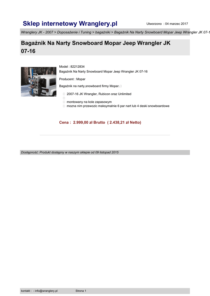 Sklep internetowy Wranglery.pl Utworzono : 04 marzec 2017 Wranglery JK - 2007 > Doposażenie i Tuning > bagażniki > Bagażnik Na Narty Snowboard Mopar Jeep Wrangler JK 07-1 Bagażnik Na Narty Snowboard Mopar Jeep Wrangler JK 07-16 Model : 82212834 Bagażnik Na Narty Snowboard Mopar Jeep Wrangler JK 07-16 Producent : Mopar Bagażnik na narty,snowboard firmy Mopar.� � 2007-16 JK Wrangler, Rubicon oraz Unlimited � � montowany na kole zapasowym � mozna nim przewozic maksymalnie 6 par nart lub 4 deski snowboardowe Cena : 2.999,00 zł Brutto ( 2.438,21 zł Netto) Dostępność: Produkt dostępny w naszym sklepie od 09 listopad 2015 kontakt : - [email protected] Strona 1