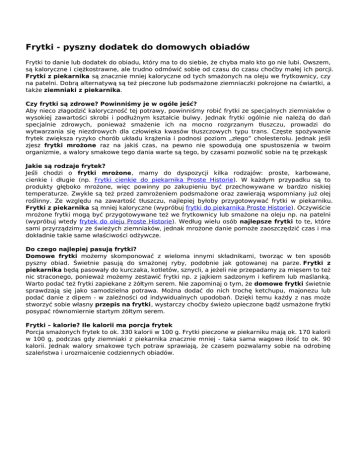 Frytki - pyszny dodatek do domowych obiadów Frytki to danie lub dodatek do obiadu, który ma to do siebie, że chyba mało kto go nie lubi. Owszem, są kaloryczne i ciężkostrawne, ale trudno odmówić sobie od czasu do czasu choćby małej ich porcji. Frytki z piekarnika są znacznie mniej kaloryczne od tych smażonych na oleju we frytkownicy, czy na patelni. Dobrą alternatywą są też pieczone lub podsmażone ziemniaczki pokrojone na ćwiartki, a także ziemniaki z piekarnika. Czy frytki są zdrowe? Powinniśmy je w ogóle jeść? Aby nieco złagodzić kaloryczność tej potrawy, powinniśmy robić frytki ze specjalnych ziemniaków o wysokiej zawartości skrobi i podłużnym kształcie bulwy. Jednak frytki ogólnie nie należą do dań specjalnie zdrowych, ponieważ smażenie ich na mocno rozgrzanym tłuszczu, prowadzi do wytwarzania się niezdrowych dla człowieka kwasów tłuszczowych typu trans. Częste spożywanie frytek zwiększa ryzyko chorób układu krążenia i podnosi poziom „złego” cholesterolu. Jednak jeśli zjesz frytki mrożone raz na jakiś czas, na pewno nie spowodują one spustoszenia w twoim organizmie, a walory smakowe tego dania warte są tego, by czasami pozwolić sobie na tę przekąsk Jakie są rodzaje frytek? Jeśli chodzi o frytki mrożone, mamy do dyspozycji kilka rodzajów: proste, karbowane, cienkie i długie (np. Frytki cienkie do piekarnika Proste Historie). W każdym przypadku są to produkty głęboko mrożone, więc powinny po zakupieniu być przechowywane w bardzo niskiej temperaturze. Zwykle są też przed zamrożeniem podsmażone oraz zawierają wspomniany już olej roślinny. Ze względu na zawartość tłuszczu, najlepiej byłoby przygotowywać frytki w piekarniku. Frytki z piekarnika są mniej kaloryczne (wypróbuj frytki do piekarnika Proste Historie). Oczywiście mrożone frytki mogą być przygotowywane też we frytkownicy lub smażone na oleju np. na patelni (wypróbuj wtedy frytek do oleju Proste Historie). Według wielu osób najlepsze frytki to te, które sami przyrządzimy ze świeżych ziemniaków, jednak mrożone danie pomoże zaoszczędzić czas i ma dokładnie takie same właściwości odżywcze. Do czego najlepiej pasują frytki? Domowe frytki możemy skomponować z wieloma innymi składnikami, tworząc w ten sposób pyszny obiad. Świetnie pasują do smażonej ryby, podobnie jak gotowanej na parze. Frytki z piekarnika będą pasowały do kurczaka, kotletów, sznycli, a jeżeli nie przepadamy za mięsem to też nic straconego, ponieważ możemy zestawić frytki np. z jajkiem sadzonym i kefirem lub maślanką. Warto podać też frytki zapiekane z żółtym serem. Nie zapominaj o tym, że domowe frytki świetnie sprawdzają się jako samodzielna potrawa. Można dodać do nich trochę ketchupu, majonezu lub podać danie z dipem - w zależności od indywidualnych upodobań. Dzięki temu każdy z nas może stworzyć sobie własny przepis na frytki, wystarczy choćby świeżo upieczone bądź usmażone frytki posypać równomiernie startym żółtym serem. Frytki – kalorie? Ile kalorii ma porcja frytek Porcja smażonych frytek to ok. 330 kalorii w 100 g. Frytki pieczone w piekarniku mają ok. 170 kalorii w 100 g, podczas gdy ziemniaki z piekarnika znacznie mniej - taka sama wagowo ilość to ok. 90 kalorii. Jednak walory smakowe tych potraw sprawiają, że czasem pozwalamy sobie na odrobinę szaleństwa i urozmaicenie codziennych obiadów. Powered by TCPDF (www.tcpdf.org)